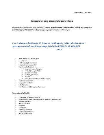 Załącznik nr 1 do SIWZ Szczegółowy opis przedmiotu zamówienia Przedmiotem zamówienia jest dostawa „Zakup wyposażenia Laboratorium Mody dla Wzgórza Zamkowego w Kielcach” według następujących parametrów technicznych: Poz. 1 Maszyna hafciarska 15 igłowa z możliwością haftu richelieu wraz z zestawem do haftu cylindrycznego TOYTOTA EXPERT ESP 9100 NET - szt. 1 pole haftu 500X350 mm 15 kolorów 1200 wkłuć igły na minutę automatyczne cięcie nici możliwość haftowania na: czapkach bejsbolowych, rękawach, nogawkach, pasach, smyczach torbach, plecakach butach koszulkach, kurtkach i wielu innych naszywanie cekinów wszywanie kordonka haft Richelieu i niezliczona ilość innych zastosowań Wyposażenie hafciarki : 2 tamborki okrągłe rozmiar 18 uchwyt tamborków do maksymalnej wielkości 500x350 mm zasilacz z kablem zestaw narzędzi oliwiarka nawlekacz zapasowy bębenek 3 szpulki aluminiowe stół do haftowania Poz. 2 Oprogramowanie hafciarki Berina Designer Plus wer 6.0 z wbudowanym programem Corel Draw Essentials 4. - szt. 1 Poz. 3 projektowanie napisów na podstawie czcionek True type zmiana kolorystyki napisów oraz sposobu ich wypełnienia możliwość łączenia kilku haftów odbicia lustrzane w pionie i w poziomie obracanie haftów pochylanie haftów zwiększanie i zmniejszanie haftów trójwymiarowy podgląd rzeczywisty haftu wbudowany program: Corel Draw Essentials 4 projektowanie napisów 71 alfabetami automatyczna zamiana grafiki/zdjęć na haft projektowanie zaawansowanych monogramów ponad 300 dostępnych rodzajów wypełnienia haftu haft krzyżykowy podgląd haftu w przeglądarce explorer, bez konieczności otwierania haftu projektowanie patchworku narzędzia do ręcznego projektowania haftu odczyt czcionek TRUE TYPE i możliwość wykonywania napisów za ich pomocą możliwość rysowania haftu myszką lub tabletem narzędzia Morphing, Carving Stamp, Halo-Effect narzędzie Color Wheel projektowanie aplikacji nieograniczone pole haftu przez opcję dzielenia haftu na dowolną liczbę tamborków i wiele, wiele innych bardzo przydatnych narzędzi Maszyna do szycia Bernina Bernette E15 - szt. 2 28 ściegów automatyczna dziurka płynna regulacja długości i szerokości ściegów automat do nawlekania igły wyłączane ząbki transportu wolne ramię regulacja pozycji igły łatwy wybór ściegów nowoczesnego design blo:c. uproszczony system nawijania nici na szpulkę chwytacz wahadłowy zatrzaskowy system mocowania stopek przycisk szycia wstecz oświetlenie halogenowe zewnętrzny obcinacz nitek regulacja balansu gęstości krawędzi dziurki Akcesoria: stopka do wszywania zamków błyskawicznych stopka do dziurek stopka do przyszywania guzików stopka uniwersalna stopka do ściegu satynowego stopka owerlokowa prowadnik krawędziowy 3 szpulki komplet igieł igła podwójna dodatkowy trzpień na szpulkę śrubokręt nakładka na ząbki transportu poz. 4 Maszyna typu Overlock pięcionitkowa Overlock BERNINA 1300MDC – 2,3,4,5 nitkowy - szt.1 24 programów szycia, w tym: 3 nitkowy ścieg owerlokowy (lewa pozycja) + ścieg łańcuszkowy 3 nitkowy ścieg owerlokowy (prawa pozycja igły) + ścieg łańcuszkowy 4 nitkowy ścieg owerlokowy z wewnętrznymi wzmocnieniami 2 nitkowy ścieg owerlokowy (lewa pozycja) + ścieg łańcuszkowy 2 nitkowy ścieg owerlokowy (prawa pozycja igły) + ścieg łańcuszkowy 4 nitkowy ścieg drabinkowy 3 nitkowy ścieg elastyczny 3 nitkowy ścieg owerlokowy (lewa pozycja igły) 3 nitkowy ścieg owerlokowy (prawa pozycja igły) 3 nitkowy ścieg płaski (lewa pozycja igły) 3 nitkowy ścieg płaski (prawa pozycja igły) 3 nitkowy ścieg rolujący 3 nitkowy ścieg obrębiający 3 nitkowy ścieg drabinkowy (szeroki – igły L, R) 3 nitkowy ścieg drabinkowy (wąski – igły L, C) 3 nitkowy ścieg drabinkowy (szeroki – igły C, R) 2 nitkowy ścieg obrębiający (lewa pozycja igły) 2 nitkowy ścieg obrębiający (prawa pozycja igły) 2 nitkowy ścieg płaski (lewa pozycja igły) 2 nitkowy ścieg płaski (prawa pozycja igły) 2 nitkowy ścieg rolujący 2 nitkowy ścieg owerlokowy (lewa pozycja igły) 2 nitkowy ścieg owerlokowy (prawa pozycja igły) 2 nitkowy ścieg łańcuszkowy bardzo cichy i najszybszy owerlok (1500 wkłuć) 2,3,4 i 5-nitkowe ściegi system mtc (Micro Thread Control) ścieg łańcuszkowy i drabinkowy wyświetlacz LCD ustawienia parametrów ściegu przyciskami na obudowie regulacja długości ściegu regulacja obcinania krawędzi materiału regulacja transportu różnicowego automat dolnego chwytacza kolorowy system nawlekania regulacja naprężenia nici palec ściegu rolującego odchylana stopka w bok okienko pozycji igieł łatwy wybór ściegów zatrzaskowy system mocowania stopek Poz. 5 Urządzenie do prasowania COMEL MAXI C - szt. 1 Stół prasowalniczy uniwersalny, składany z odsysaniem i podgrzewaniem elektrycznym. Regulacja temperatury stołu za pomocą termostatu. Zasilanie 220 V, Moc silnika odsysacza 120 W. Moc grzałki stołu 600 W Wytwornica pary 1,5 litra Wymiary stołu: długość 114 cm, szerokość 24-39 cm W komplecie teflonowa stopa Poz. 6 Deska do prasowania - szt.1 Deska do prasowania o wymiarach blatu 120x38 cm, z regulacją wysokości oraz z podstawką pod żelazko ze zintegrowanym przyłączeniem elektrycznym i antenką podtrzymującą przewód. Poz. 7 Żelazko parowe - Braun TexStyle 780 Dane techniczne : Rodzaj stopy szafirowa Moc 2400 W Wytwornica pary wbudowana Wytwarzanie pary 50 g/min - szt.1 Regulacja strumienia pary Pionowy wyrzut pary Dodatkowe uderzenie pary 120 g/min Blokada kapania Spryskiwacz Automatyczne wyłączenie żelazka System antywapienny wbudowany Funkcja samooczyszczenia Funkcje dodatkowe Precision Tip - otwory na samym wierzchu stopy, Anti Drip - system zapobiegający kapaniu, Prasowanie przestrzeni między guzikami Poz. 8 Krążkowy nóż do krojenia materiału OLFA model RTY – 2/G szt.1 Nóż z obrotowym ostrzem o średnicy 45mm do cięcia materiałów w wielu warstwach