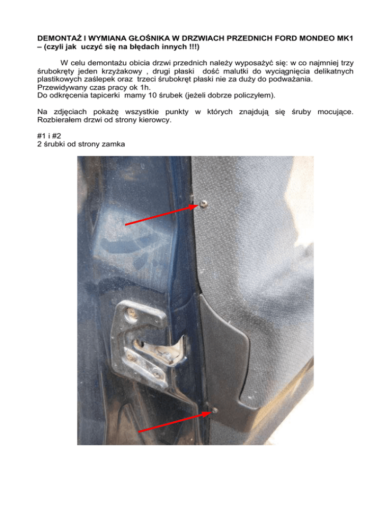 DEMONTAŻ I WYMIANA GŁOŚNIKA W DRZWIACH PRZEDNICH FORD MONDEO MK1 – (czyli jak uczyć się na błędach innych !!!) W celu demontażu obicia drzwi przednich należy wyposażyć się: w co najmniej trzy śrubokręty jeden krzyżakowy , drugi płaski dość malutki do wyciągnięcia delikatnych plastikowych zaślepek oraz trzeci śrubokręt płaski nie za duży do podważania. Przewidywany czas pracy ok 1h. Do odkręcenia tapicerki mamy 10 śrubek (jeżeli dobrze policzyłem). Na zdjęciach pokażę wszystkie punkty w których znajdują się śruby mocujące. Rozbierałem drzwi od strony kierowcy. #1 i #2 2 śrubki od strony zamka #3 i #4 dwie śrubki od spodu tapicerki. # 5 śrubka od strony zawiasu #6 śrubka nad klamką, za pomocą małego śrubokręta podważamy zaślepkę (delikatnie) następnie odkręcamy zamaskowaną śrubkę zdjęcie nr 2. # 7 następnie rzecz najtrudniejsza musimy zdjąć maskownicę by dostać sie do śrubki nr 7 Należy przy tym uważać by nie połamać zatrzasków. Poniżej zaznaczyłem zatrzask w który wpina sie maskownica z jej prawej strony. Poniżej Fotka pękniętego już zatrzasku maskownicy. Małym płaskim śrubokrętem podważamy delikatnie ząbek ze zdjęcia powyżej, jest to dość trudne bo dokładnie tego nie widać. Nie wiem jak dokładnie to zrobić i jak widzicie na załączonym obrazku mi sie nie udało :( . Jeżeli znacie jakiś dobry sposób to go opiszcie a ja ten watek poprawię. Załączam zdjęcia bo dzięki temu pokaże jak to wygląda i ktoś inny wykona to z lepszym efektem (oby !!!!). Teraz pora na lewą stronę maskownicy, tu podobnie jak wyżej, też za bardzo mi nie wyszło, zielona strzałką zaznaczyłem kierunek włożenia płaskiego śrubokręta, czerwoną zatrzask. Aby po podważeniu zatrzasku aby zdjąć całkowicie maskownicę, wewnętrzną klamkę należy odciągnąć do pozycji “otwarte” . #8 Po wyjęciu zaślepki odkręcamy osłonę zakrywającą mocowanie lusterka #9 i #10 następnie odkręcamy 2 śrubki znajdujące się w poręczy, aby dostać się do nich należy zdemontować ozdobny plastik. W celu poprawnego demontażu, płaskim śrubokrętem od dołu poprzez specjalny otwór należy wypchnąć od wewnątrz element ozdobny. Poniżej zdjęcie wyjaśniające sposób demontażu. Następnie “dobieramy” sie do śrubek. I ostatni ruch odłączenie tapicerki od zatrzasku przy szybie. Następnie odkręcamy 4 śruby mocujące głośnik , a dalej to już sobie poradzicie.... Jeżeli czytasz to i uważasz ze zostało coś ważnego pominięte napisz do mnie na email [email protected] Chętnie wysłucham uwag a w szczególności szukam dobrego opisu prawidłowego demontażu maskownicy klamki,to jedyna rzecz która mnie pokonała a chciałbym to w tym tekście poprawić. Miłej pracy!! Pozdrawiam!!!! Thered