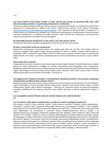FAQ Czy można poprzez Pocztę złożyć wniosek na jedno dziecko, gdy dochód nie przekracza 800 netto. Jakie dokumenty będą potrzebne. Czy potrzebuję zaświadczenie o dochodach. Wniosek w programie Rodzina 500 plus można otrzymać w placówce pocztowej i po wypełnieniu wysłać listem poleconym za potwierdzeniem odbioru, jak również elektronicznie poprzez stronę Banku Pocztowego https://www.pocztowy.pl/indywidualni/rodzina500plus/. Jeżeli dochód nie przekracza 800 zł miesięcznie na członka rodziny, jest podstawa do ubiegania się o świadczenie wychowawcze na jedno dziecko. Wniosek zawiera stosowne oświadczenia, w zależności od źródła dochodu. Jeżeli dochód jest uzyskiwany ze stosunku pracy wówczas zaświadczenie o zarobkach nie jest wymagane. Do kiedy będę dostawać świadczenie na syna, który w tym roku ukończy 18 lat? Świadczenie wychowawcze będzie przysługiwało do ukończenia 18 roku życia dziecka. Na które z moich dzieci otrzymam świadczenie? Świadczenie wychowawcze otrzymają rodzice oraz opiekunowie dzieci do 18 roku życia. Każda rodzina z minimum dwojgiem dzieci będzie mogła otrzymać świadczenie 500 zł na drugie i kolejne każde dziecko. W przypadku rodzin z dochodem poniżej 800 zł netto na osobę wsparcie otrzyma rodzina także na pierwsze lub jedyne dziecko. Dla rodzin z dzieckiem niepełnosprawnym kryterium dochodowe jest wyższe i wynosi 1200 zł netto. Gdzie należy złożyć wniosek? Postępowanie w sprawie świadczenia wychowawczego prowadzi organ właściwy. Wniosek składa się w urzędzie gminy lub miasta właściwym ze względu na miejsce zamieszkania osoby ubiegającej się o świadczenie. Wypełniony papierowy wniosek wraz z dokumentacją może zostać wysłany za pośrednictwem Poczty Polskiej do organu właściwego w formie przesyłki listowej rejestrowanej. Wniosek może zostać złożony także w formie elektronicznej poprzez portal Banku Pocztowego – Pocztowy 24. Jak wygląda proces składania wniosków za pośrednictwem placówki pocztowej? Czy pracownik przyjmujący wniosek będzie weryfikował dane osobowe klienta? Wypełniony papierowy wniosek wraz z dokumentacją może zostać wysłany za pośrednictwem Poczty Polskiej do organu właściwego w formie przesyłki listowej rejestrowanej. Wniosek może zostać złożony także w formie elektronicznej poprzez portal Banku Pocztowego – Pocztowy 24. Pracownik Poczty nie dokonuje weryfikacji wniosków przedłożonych do wysłania, natomiast może udzielić informacji w zakresie wypełniania wniosku w części 1. Czy w przypadku urodzenia dziecka należy do wniosku dołączyć akt urodzenia dziecka? Nie. Czy we wniosku należy wpisać wszystkie dzieci, czy tylko to na które przysługuje świadczenie? We wniosku w części 4 „Dane członków rodziny” należy wskazać wszystkich członków rodziny (odpowiednio: małżonków, rodziców dzieci, opiekuna faktycznego dziecka oraz zamieszkujące wspólnie z tymi osobami, pozostające na ich utrzymaniu dzieci w wieku do ukończenia 25 roku życia, a także dzieci, które ukończyły 25 rok życia, legitymujące się orzeczeniem o znacznym stopniu niepełnosprawności, jeżeli w związku z tą niepełnosprawnością przysługuje świadczenie pielęgnacyjne lub specjalny zasiłek opiekuńczy albo zasiłek dla opiekuna. Do członków rodziny nie zalicza się dziecka pozostającego pod opieką opiekuna prawnego, dziecka pozostającego w związku małżeńskim, a także pełnoletniego dziecka posiadającego własne dziecko. W przypadku gdy dziecko, zgodnie z orzeczeniem sądu, jest pod opieką naprzemienną obydwojga rodziców rozwiedzionych, żyjących w separacji lub żyjących w rozłączeniu, dziecko zalicza się jednocześnie do członków rodzin obydwojga rodziców. Osoba samotnie wychowująca dziecko (panna, kawaler, wdowa, wdowiec, osoba pozostająca w separacji orzeczonej prawomocnym orzeczeniem sądu, osoba rozwiedziona, chyba, że wychowuje wspólnie co najmniej jedno dziecko z jego rodzicem) nie wpisuje do składu rodziny drugiego z rodziców dziecka. 1 Pierwsze dziecko to… To najstarsze lub jedyne dziecko w wieku do ukończenia 18 r. życia. Czy mimo, że pracuję zagranicą, dostanę 500 zł na dziecko? Jeśli osoba składająca wniosek lub członek wskazanej we wniosku rodziny przebywa poza granicami Rzeczypospolitej Polskiej - w państwie Unii Europejskiej lub Europejskiego Obszaru Gospodarczego, a wyjazd/pobyt ten nie ma charakteru turystycznego, leczniczego lub nie jest związany z podjęciem przez dziecko kształcenia poza granicami Rzeczypospolitej Polskiej, to gmina przekaże wniosek wraz z dokumentami marszałkowi województwa w celu jego rozpatrzenia i ustalenia czy nie mają zastosowania unijne przepisy o koordynacji sytemu zabezpieczeń społecznych. Ma to na celu uniknięcie niedopuszczalnej w przepisach unijnych sytuacji pobierania przez tą samą osobę podobnych świadczeń w dwóch państwach UE/EOG jednocześnie. Jakich świadczeń nie wlicza do ustalaniu dochodu? Przy ustalaniu dochodu nie wlicza się m.in. świadczeń rodzinnych (z wyjątkiem świadczenia rodzicielskiego), świadczeń z pomocy społecznej oraz wszelkich innych środków, których nie obejmuje definicja dochodu zawarta w ustawie o świadczeniach rodzinnych. Czy od dochodu można odliczyć alimenty płacone na dziecko? Tak. Kwoty alimentów świadczonych na rzecz innych osób (tj. osób spoza rodziny) są odliczane od dochodu. Pocztowe Konto 500+ Czy obsługujący mnie pracownik dokonuje szczególnej weryfikacji w zakresie zasadności otrzymywania świadczenia Rodzina 500 plus? Pracownik nie dokonuje żadnej weryfikacji w zakresie należności klientowi świadczenia. Taka weryfikacja zostanie dokonana przez Organ gminny. Czy status weryfikacji ma znaczenie dla założenia Pocztowego Konta 500+? Weryfikacja wniosku nie ma wpływu na założenie konta. Każdy klient może założyć dowolny rachunek. Czy zakładając rachunek w 