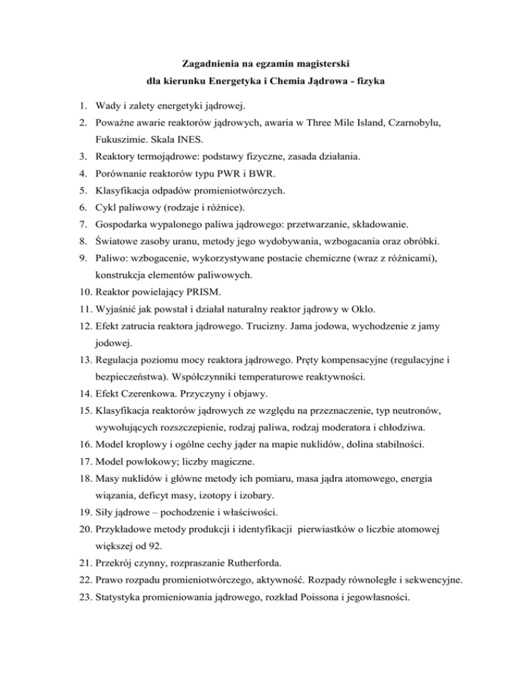 Zagadnienia na egzamin magisterski dla kierunku Energetyka i Chemia Jądrowa - fizyka 1. Wady i zalety energetyki jądrowej. 2. Poważne awarie reaktorów jądrowych, awaria w Three Mile Island, Czarnobylu, Fukuszimie. Skala INES. 3. Reaktory termojądrowe: podstawy fizyczne, zasada działania. 4. Porównanie reaktorów typu PWR i BWR. 5. Klasyfikacja odpadów promieniotwórczych. 6. Cykl paliwowy (rodzaje i różnice). 7. Gospodarka wypalonego paliwa jądrowego: przetwarzanie, składowanie. 8. Światowe zasoby uranu, metody jego wydobywania, wzbogacania oraz obróbki. 9. Paliwo: wzbogacenie, wykorzystywane postacie chemiczne (wraz z różnicami), konstrukcja elementów paliwowych. 10. Reaktor powielający PRISM. 11. Wyjaśnić jak powstał i działał naturalny reaktor jądrowy w Oklo. 12. Efekt zatrucia reaktora jądrowego. Trucizny. Jama jodowa, wychodzenie z jamy jodowej. 13. Regulacja poziomu mocy reaktora jądrowego. Pręty kompensacyjne (regulacyjne i bezpieczeństwa). Współczynniki temperaturowe reaktywności. 14. Efekt Czerenkowa. Przyczyny i objawy. 15. Klasyfikacja reaktorów jądrowych ze względu na przeznaczenie, typ neutronów, wywołujących rozszczepienie, rodzaj paliwa, rodzaj moderatora i chłodziwa. 16. Model kroplowy i ogólne cechy jąder na mapie nuklidów, dolina stabilności. 17. Model powłokowy; liczby magiczne. 18. Masy nuklidów i główne metody ich pomiaru, masa jądra atomowego, energia wiązania, deficyt masy, izotopy i izobary. 19. Siły jądrowe – pochodzenie i właściwości. 20. Przykładowe metody produkcji i identyfikacji pierwiastków o liczbie atomowej większej od 92. 21. Przekrój czynny, rozpraszanie Rutherforda. 22. Prawo rozpadu promieniotwórczego, aktywność. Rozpady równoległe i sekwencyjne. 23. Statystyka promieniowania jądrowego, rozkład Poissona i jegowłasności. 24. Rozpad alfa. Zależności energetyczne, reguły wyboru dla momentu pędu i parzystości, prawdopodobieństwo przemiany, prawo Geigera-Nuttalla. 25. Rozpad -, +, wychwyt elektronu. Zależności energetyczne, klasyfikacja przejść beta, widmo energii kinetycznej emitowanych cząstek, całkowite prawdopodobieństwo przemiany. 26. Emisja promieniowania gamma. Typy przejść, zależności energetyczne, reguły wyboru, prawdopodobieństwa przejść. 27. Zjawisko konwersji wewnętrznej. Zależności energetyczne, współczynniki konwersji. 28. Rozszczepienie, parametr rozszczepienia, energia aktywacji. Widmo masowe i całkowita energia kinetyczna fragmentów. 29. Oddziaływanie ciężkich cząstek naładowanych z materią. Straty energii na jednostkę drogi, krzywa absorpcji cząstek, zasięg, rozrzut zasięgu. 30. Oddziaływanie elektronów z materią. Strata energii na jednostkę drogi, krzywa absorpcji, zasięg. 31. Oddziaływanie kwantów gamma z materią, prawo absorpcji promieniowania gamma, masowy współczynnik absorpcji, grubość połowicznego pochłaniania. 32. Oddziaływanie neutronów z materią, prawo absorpcji neutronów, masowy współczynnik absorpcji, grubość połowicznego pochłaniania. 33. Detektory gazowe. Ruch elektronów i jonów w gazie, w polu elektrycznym. Reżimy pracy detektorów gazowych. Wzmocnienie gazowe. Zasada działania komory jonizacyjnej, licznika proporcjonalnego i licznika Geigera-Mullera. 34. Detektory półprzewodnikowe. Własności półprzewodników samoistnych i domieszkowanych, Złącze p-n. Rodzaje i zastosowanie detektorów krzemowych i germanowych. 35. Detektory scyntylacyjne. Scyntylatory organiczne i nieorganiczne. Budowa, zasada działania, własności i zastosowania detektorów scyntylacyjnych. 36. Detektory neutronów. Wykorzystywane reakcje. Budowa i zasada działania detektorów neutronów termicznych i szybkich. 37. Pomiar czasu w eksperymentach jądrowych: budowa i zasada działania dyskryminatora progowego, dyskryminatora stałofrakcyjnego, analizatora jednokanałowego, konwertera czas – amplituda (TAC). 38. Efekty zaburzające wyniki pomiarów spektroskopowych: nieliniowość, defekt wysokości impulsu, czas martwy, sumowanie i efekt pile-up, wpływ rozmiaru źródła. 39. Naturalne źródła promieniowania jonizującego, szeregi promieniotwórcze. Metody redukcji tła w układach detekcji promieniowania jądrowego. 40. Zjawisko emisji neutronów opóźnionych. Neutrony opóźnione w reaktorach jądrowych.