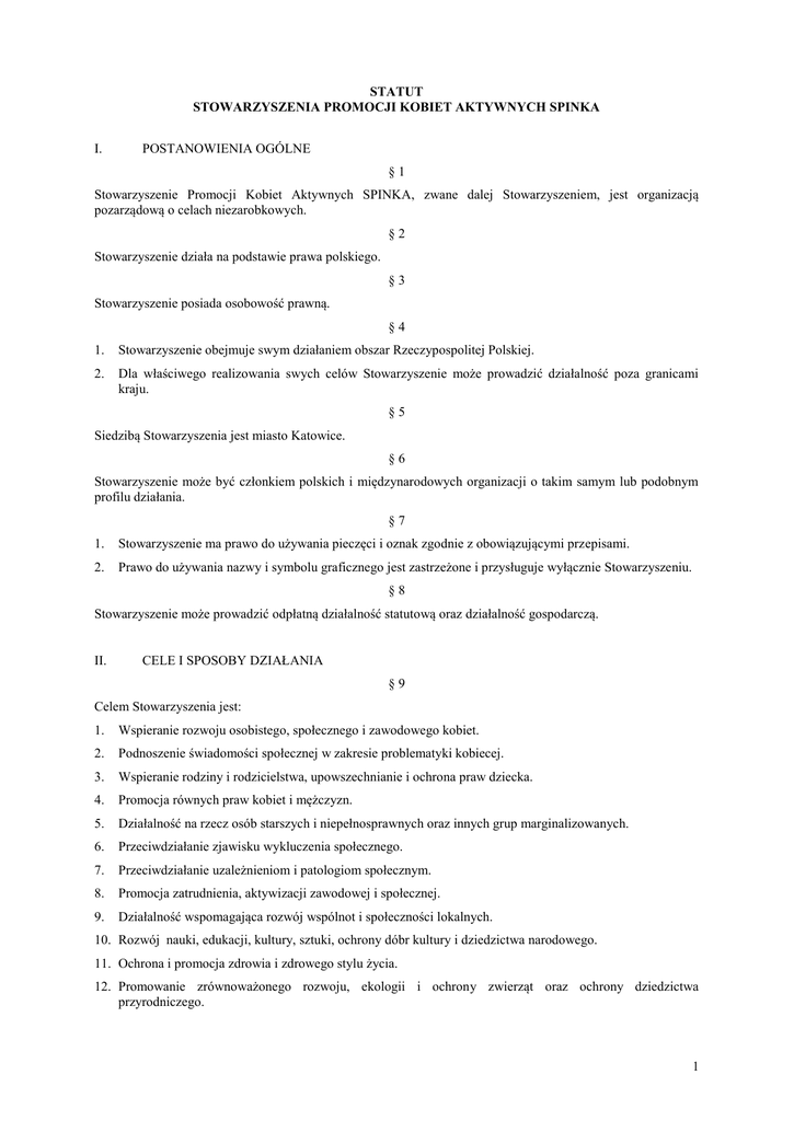 Statut Stowarzyszenia SPINKA - Stowarzyszenie Promocji Kobiet