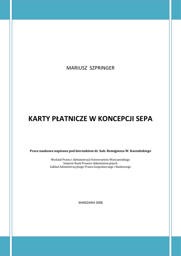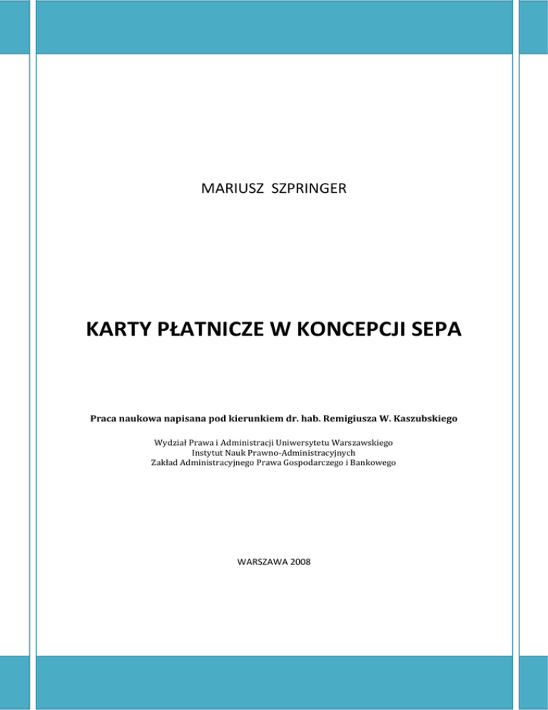 MARIUSZ SZPRINGER KARTY PŁATNICZE W KONCEPCJI SEPA Praca naukowa napisana pod kierunkiem dr. hab. Remigiusza W. Kaszubskiego Wydział Prawa i Administracji Uniwersytetu Warszawskiego Instytut Nauk Prawno-Administracyjnych Zakład Administracyjnego Prawa Gospodarczego i Bankowego WARSZAWA 2008 ©Wszelkie prawa zastrzeżone Kopiowanie i rozpowszechnianie całości lub fragmentów niniejszego opracowania może nastąpić jedynie za zgodą autora 2 Spis treści SŁOWO WSTĘPNE .................................................................................................................................... 6 ROZDZIAŁ 1 .............................................................................................................................................. 8 Ogólna charakterystyka tematyki kart płatniczych ................................................................................. 8 1.1. Płatności gotówkowe i bezgotówkowe a pojęcie systemu płatniczego ....................................... 8 1.2. Zarys historii kart płatniczych a geneza bankowości elektronicznej .......................................... 11 1.3. Klasyfikacja kart płatniczych i podmioty związane z ich funkcjonowaniem ............................... 13 ROZDZIAŁ 2 ............................................................................................................................................ 18 SEPA – umacnianie Integracji Europejskiej poprzez regulację i samoregulację w obszarze bankowości i usług płatniczych ................................................................................................................................... 18 2.1. Sens prawny ponadnarodowego systemu usług płatniczych w Europie.................................... 18 2.2. Soft law a kreowanie standardów .............................................................................................. 22 2.3. Podstawowe założenia koncepcji SEPA i jej długoterminowe cele z perspektywy sektora bankowego ........................................................................................................................................ 26 2.4. SEPA Cards Framework (SCF) jako wyraz tendencji samoregulacyjnych ................................... 33 2.5. Rola acquis communautaire w kształtowaniu rynku płatności elektronicznych ze szczególnym uwzględnieniem Dyrektywy PSD (Payment Services Directive) jako ram prawnych SEPA ............... 40 2.6. Problematyka harmonizacji krajowych porządków prawnych w zakresie kart płatniczych w kontekście dyrektywy PSD................................................................................................................. 47 ROZDZIAŁ 3 ............................................................................................................................................ 50 Funkcjonowanie systemu kart płatniczych wedle standardów SEPA ................................................... 50 3.1. Dostosowanie do SEPA lokalnych instytucji i systemów kart..................................................... 50 3.2. Zasady uczestnictwa w systemie i licencjonowania działalności (wydawców kart)................... 56 3.3. Pojęcie instytucji płatniczej. Konsekwencje dla banków w zakresie prowadzenia biznesu kartowego.......................................................................................................................................... 59 3.4. Jednolita polityka cenowa systemów kart płatniczych na całym obszarze SEPA i jej stosunek do europejskiego prawa konkurencji. .................................................................................................... 65 3.5. Nowa terminologia prawna i standardy SEPA w zakresie umów ............................................... 70 3.6. Wymogi SEPA w zakresie ochrony konsumenta ........................................................................ 76 3.7. Ujednolicenie wymogów dla wszystkich instrumentów płatniczych SEPA w kwestii wykonywania transakcji .................................................................................................................... 80 ROZDZIAŁ 4 ............................................................................................................................................ 84 Standardy techniczne i bezpieczeństwo obrotu kartowego w ramach SEPA ....................................... 84 3 4.1. Wymogi techniczne dla kart i terminali. Pojęcie interoperacyjności systemu........................... 84 4.2. Jednolite zobowiązania w zakresie przeciwdziałania przestępstwom związanym z kartami płatniczymi ........................................................................................................................................ 87 4.3. Wyzwania dla nadzoru nad rynkiem usług płatniczych.............................................................. 90 PODSUMOWANIE .................................................................................................................................. 93 Perspektywy dalszego rozwoju rynku kart płatniczych w obliczu SEPA ................................................ 93 WYKAZ LITERATURY :............................................................................................................................. 97 4 WYKAZ WAŻNIEJSZYCH SKRÓTÓW: ATM – ang. automated teller machine (bankomat) Dyrektywa PSD – ang. Payment Services Directive (Dyrektywa PE i Rady 2007/64/WE o usługach płatniczych w ramach Rynku Wewnętrznego) E.I.P. – Elektroniczny instrument płatniczy EBC – Europejski Bank Centralny EOG – Europejski Obszar Gospodarczy EPC – European Payments Council (Europejska Rada ds. Płatności) IF – ang. interchange fee (opłata interchange) KE – Komisja Europejska KIR – Krajowa Izba Rozliczeniowa MIF – ang. multilateral interchange fee (opłata interchange ustalana wielostronnie) NBP – Narodowy Bank Polski PE – Parlament Europejski PIN – ang. p