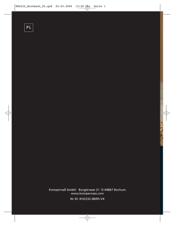 KH2232_Brotback_PL.qxd 24.03.2006 13:39 Uhr Seite 1 PL Kompernaß GmbH Burgstrasse 21 D-44867 Bochum www.kompernass.com Nr ID: KH2232-08/05-V4 KH2232_Brotback_PL.qxd 24.03.2006 13:39 Uhr Seite 2 Urządzenie do pieczenia chleba KH 2232 Instrukcja obsługi KH2232_Brotback_PL.qxd 24.03.2006 13:39 Uhr Seite 3 KH2232_Brotback_PL.qxd 24.03.2006 13:39 Uhr Seite 4 KH2232_Brotback_PL.qxd 24.03.2006 13:39 Uhr Seite 3 Urządzenie do pieczenia chleba KH2232 Strona Ważne wskazówki bezpieczeństwa 4 Przegląd urządzenia 5 Akcesoria 5 Zastosowanie zgodnie z przeznaczeniem 5 Przed pierwszym użyciem 6 Właściwości 6 Panel obsługi 6 Programy pieczenia 7 Ustawianie zegara sterującego (timera) 9 Przed rozpoczęciem pieczenia 10 Pieczenie chleba 10 Czyszczenie i pielęgnacja 12 Dane techniczne 13 Gwarancja i serwis 13 Utylizacja 13 Importer 13 Przebieg programu 14 Usuwanie usterek w urządzeniu do pieczenia chleba 18 Przed pierwszym użyciem zapoznaj się z instrukcją obsługi i zachowaj ją w celu późniejszego wykorzystania. W przypadku przekazania urządzenia osobom trzecim należy przekazać im także instrukcję. -3- KH2232_Brotback_PL.qxd 24.03.2006 13:39 Uhr Seite 4 KH2232 Ważne wskazówki Podczas eksploatacji • Często sprawdzać kabel zasilający i wtyczkę. W wypadku uszkodzenia przewodu zasilania należy zwrócić się do producenta, autoryzowanego serwisu lub wykwalifikowanego punktu naprawczego w celu naprawienia usterki. • Używanie urządzeń elektrycznych przez dzieci lub pobyt w ich pobliżu powinno być dozwolone wyłącznie pod nadzorem. • Niniejsze urządzenie jest zgodne z odpowiednimi przepisami bezpieczeństwa. Kontrole, naprawy i konserwacje techniczne wykonuje wyłącznie kwalifikowany personel sprzedawcy. • Na urządzeniu nie stawiać żadnych przedmiotów, ani go nie zakrywać. Niebezpieczeństwo pożaru! • Uwaga, urządzenie do pieczenia chleba jest gorące w czasie pracy. Urządzenie dotykać tylko przy pomocy uchwytów. Używać łapek do gorących garnków. • Zwłaszcza przy wyjmowaniu elementów akcesoriów lub ich wkładaniu należy urządzenie pozostawić do wychłodzenia i wyciągnąć wtyczkę z sieci. • Nie przesuwaj urządzenia, jeśli w formie do pieczenia znajduje się gorąca lub płynna zawartość. • Zwrócić uwagę, aby podczas pracy nie doszło do kontaktu z rotującymi mieszadłami. Niebezpieczeństwo poranienia! • Wyłącz urządzenie przyciskiem Wyłącznik, a następnie wyciągnij wtyczkę z gniazdka. • Nie wyłączać z kontaktu ciągnąc za przewód. bezpieczeństwa Ustawianie • Po rozpakowaniu urządzenia sprawdź, czy żaden z elementów nie uległ uszkodzeniu w czasie transportu. W razie konieczności skontaktuj się z dostawcą towaru. • Ustaw urządzenie na suchej, płaskiej i odpornej na działanie wysokich temperatur powierzchni. • Nie stawiaj urządzenia w pobliżu kuchenek gazowych, elektrycznych oraz innych źródeł ciepła. • Nie umieszczać urządzenia w pobliżu materiałów palnych, wybuchowych i/lub gazów palnych. • Zwracaj uwagę, aby boczne otwory wentylacyjne nie były zasłonięte. • Przed przyłączeniem sprawdź, czy rodzaj prądu w sieci elektrycznej odpowiada danym umieszczonym na tabliczce znamionowej. • Kabel zasilający z sieci prowadzić tak, by nie przechodził przez ostre krawędzie lub w pobliżu gorących powierzchni i przedmiotów. Mogłoby dojść do uszkodzenia izolacji kabla. • Aby zapobiec zahaczeniu i urazowi urządzenie zostało wyposażone tylko w krótki kabel sieciowy. • W przypadku stosowania przewodu przedłużającego maksymalna dopuszczalna moc tego przewodu musi być zgodna z mocą automatu do pieczenia chleba. • Przedłużacz układaj w taki sposób, aby nikt się o niego nie potknął ani go przypadkowo nie pociągnął. -4- KH2232_Brotback_PL.qxd 24.03.2006 13:39 Uhr Seite 5 KH2232 • • Akcesoria Wtyczkę wyłączyć z sieci, kiedy urządzenie nie jest używane oraz przed każdym czyszczeniem. Urządzenia nie stosować do przechowywania artykułów spożywczych lub naczyń. 2 Łopatki do wyrabiania ciasta Forma do pieczenia o pojemności do 1250 g Miarka Łyżka pomiarowa Wyjmowanie łopatek do wyrabiania ciasta Instrukcja obsługi Książka gwarancyjna Formularz zamówieniowy Zeszyt z przepisami Czyszczenie • Nie zanurzaj urządzenia pod wodę lub inny płyn. Niebezpieczeństwo porażenia prądem elektrycznym! • Nie czyścić urządzenia gąbkami czyszczącymi, które pozostawiają zadrapania. Kiedy części gąbki uwolnią się i dostaną do kontaktu z elementami elektrycznymi urządzenia, pojawia się niebezpieczeństwo urazu prądem elektrycznym. Wskazówka: Dodatkowo do urządzenia Bifinett możesz zamówić dwie mniejsze formy do pieczenia chleba o pojemności do 500 g. Aby otrzymać te dodatki skorzystaj z załączonego formularza zamówienia. Przegląd urządzenia Pokrywa automatu Panel obsług Otwory wentylacyjne Kabel sieciowy Wziernik Zastosowanie zgodnie z przeznaczeniem Niniejsza tabliczka na pokrywie Twojego automatu do pieczenia chleba ostrzega przed niebezpieczeństwem popalenia. Urządzenie do pieczenia chleba Bifinett jest przystosowane wyłącznie do użytkowania w warunkach domowych. Nie używać urządzenia do suszenia artykułów spożywczych lub innych przedmiotów. Nie używać automatu do pieczenia chleba na zewnątrz. Stosować tylko przez producenta zalecane akcesoria. Nie zalecane akcesoria mogą spowodować uszkodzenie urządzenia. -5- KH2232_Brotback_PL.qxd 24.03.2006 13:39 Uhr Seite 6 KH2232 Przed pierwszym użyciem Panel obsługi Likwidacja opakowania Rozpakuj swój automat i zlikwiduj opakowanie zgodnie z przepisami obowiązującymi na Twoim terenie. wyświetlacz Wyświetla wybór ciężaru (750 g, 1000 g, 1250 g) czas pozostały do zakończenia pieczenia i zaprogramowany czas pracy wybrany stopień wypieczenia chleba (średnio, jasno, ciemno lub szybko) wybrany numer programu przebieg programu Pierwsze czyszczenie Pr