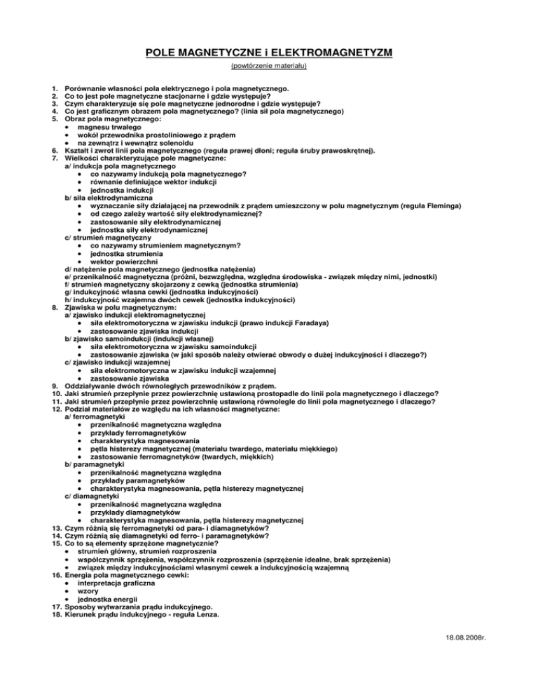 POLE MAGNETYCZNE i ELEKTROMAGNETYZM (powtórzenie materiału) 1. 2. 3. 4. 5. 6. 7. 8. 9. 10. 11. 12. 13. 14. 15. 16. 17. 18. Porównanie własno ci pola elektrycznego i pola magnetycznego. Co to jest pole magnetyczne stacjonarne i gdzie wyst puje? Czym charakteryzuje si pole magnetyczne jednorodne i gdzie wyst puje? Co jest graficznym obrazem pola magnetycznego? (linia sił pola magnetycznego) Obraz pola magnetycznego: • magnesu trwałego • wokół przewodnika prostoliniowego z pr dem • na zewn trz i wewn trz solenoidu Kształt i zwrot linii pola magnetycznego (reguła prawej dłoni; reguła ruby prawoskr tnej). Wielko ci charakteryzuj ce pole magnetyczne: a/ indukcja pola magnetycznego • co nazywamy indukcj pola magnetycznego? • równanie definiuj ce wektor indukcji • jednostka indukcji b/ siła elektrodynamiczna • wyznaczanie siły działaj cej na przewodnik z pr dem umieszczony w polu magnetycznym (reguła Fleminga) • od czego zale y warto siły elektrodynamicznej? • zastosowanie siły elektrodynamicznej • jednostka siły elektrodynamicznej c/ strumie magnetyczny • co nazywamy strumieniem magnetycznym? • jednostka strumienia • wektor powierzchni d/ nat enie pola magnetycznego (jednostka nat enia) e/ przenikalno magnetyczna (pró ni, bezwzgl dna, wzgl dna rodowiska - zwi zek mi dzy nimi, jednostki) f/ strumie magnetyczny skojarzony z cewk (jednostka strumienia) g/ indukcyjno własna cewki (jednostka indukcyjno ci) h/ indukcyjno wzajemna dwóch cewek (jednostka indukcyjno ci) Zjawiska w polu magnetycznym: a/ zjawisko indukcji elektromagnetycznej • siła elektromotoryczna w zjawisku indukcji (prawo indukcji Faradaya) • zastosowanie zjawiska indukcji b/ zjawisko samoindukcji (indukcji własnej) • siła elektromotoryczna w zjawisku samoindukcji • zastosowanie zjawiska (w jaki sposób nale y otwiera obwody o du ej indukcyjno ci i dlaczego?) c/ zjawisko indukcji wzajemnej • siła elektromotoryczna w zjawisku indukcji wzajemnej • zastosowanie zjawiska Oddziaływanie dwóch równoległych przewodników z pr dem. Jaki strumie przepłynie przez powierzchni ustawion prostopadle do linii pola magnetycznego i dlaczego? Jaki strumie przepłynie przez powierzchni ustawion równolegle do linii pola magnetycznego i dlaczego? Podział materiałów ze wzgl du na ich własno ci magnetyczne: a/ ferromagnetyki • przenikalno magnetyczna wzgl dna • przykłady ferromagnetyków • charakterystyka magnesowania • p tla histerezy magnetycznej (materiału twardego, materiału mi kkiego) • zastosowanie ferromagnetyków (twardych, mi kkich) b/ paramagnetyki • przenikalno magnetyczna wzgl dna • przykłady paramagnetyków • charakterystyka magnesowania, p tla histerezy magnetycznej c/ diamagnetyki • przenikalno magnetyczna wzgl dna • przykłady diamagnetyków • charakterystyka magnesowania, p tla histerezy magnetycznej Czym ró ni si ferromagnetyki od para- i diamagnetyków? Czym ró ni si diamagnetyki od ferro- i paramagnetyków? Co to s elementy sprz one magnetycznie? • strumie główny, strumie rozproszenia • współczynnik sprz enia, współczynnik rozproszenia (sprz enie idealne, brak sprz enia) • zwi zek mi dzy indukcyjno ciami własnymi cewek a indukcyjno ci wzajemn Energia pola magnetycznego cewki: • interpretacja graficzna • wzory • jednostka energii Sposoby wytwarzania pr du indukcyjnego. Kierunek pr du indukcyjnego - reguła Lenza. 18.08.2008r.
