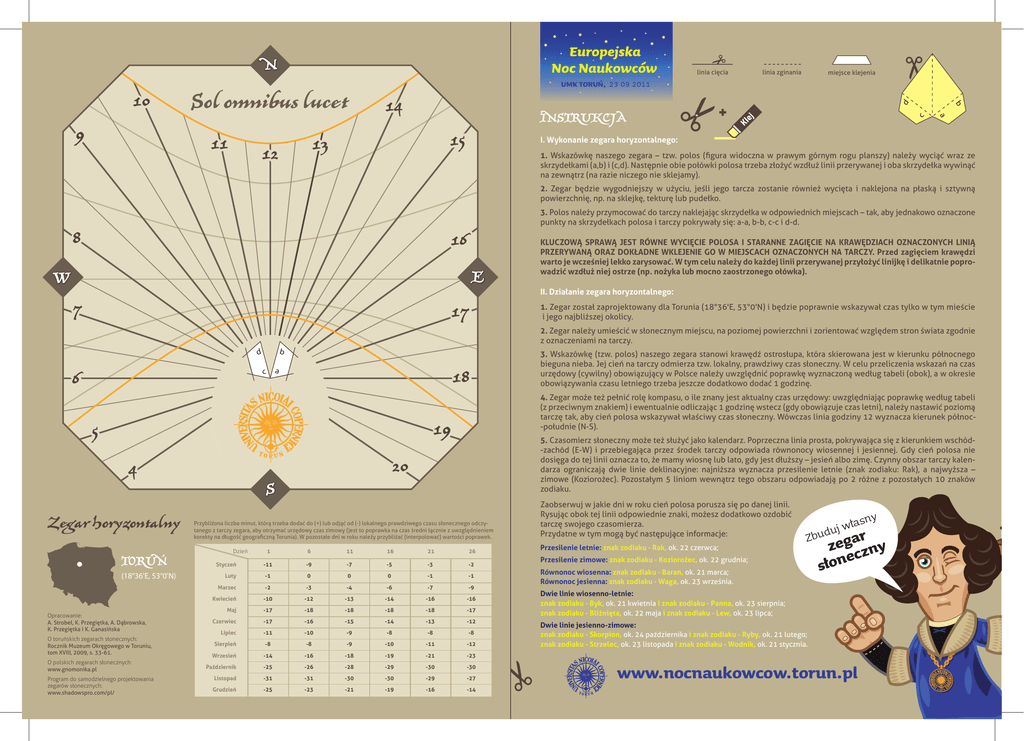 linia cięcia 11 d 14 15 13 12 c INSTRUKCJA a 9 Sol omnibus lucet miejsce klejenia b 10 linia zginania I. Wykonanie zegara horyzontalnego: 1. Wskazówkę naszego zegara – tzw. polos (figura widoczna w prawym górnym rogu planszy) należy wyciąć wraz ze skrzydełkami (a,b) i (c,d). Następnie obie połówki polosa trzeba złożyć wzdłuż linii przerywanej i oba skrzydełka wywinąć na zewnątrz (na razie niczego nie sklejamy). 2. Zegar będzie wygodniejszy w użyciu, jeśli jego tarcza zostanie również wycięta i naklejona na płaską i sztywną powierzchnię, np. na sklejkę, tekturę lub pudełko. 8 3. Polos należy przymocować do tarczy naklejając skrzydełka w odpowiednich miejscach – tak, aby jednakowo oznaczone punkty na skrzydełkach polosa i tarczy pokrywały się: a-a, b-b, c-c i d-d. 16 KLUCZOWĄ SPRAWĄ JEST RÓWNE WYCIĘCIE POLOSA I STARANNE ZAGIĘCIE NA KRAWĘDZIACH OZNACZONYCH LINIĄ PRZERYWANĄ ORAZ DOKŁADNE WKLEJENIE GO W MIEJSCACH OZNACZONYCH NA TARCZY. Przed zagięciem krawędzi warto je wcześniej lekko zarysować. W tym celu należy do każdej linii przerywanej przyłożyć linijkę i delikatnie poprowadzić wzdłuż niej ostrze (np. nożyka lub mocno zaostrzonego ołówka). II. Działanie zegara horyzontalnego: 7 17 1. Zegar został zaprojektowany dla Torunia (18°36'E, 53°0'N) i będzie poprawnie wskazywał czas tylko w tym mieście i jego najbliższej okolicy. 2. Zegar należy umieścić w słonecznym miejscu, na poziomej powierzchni i zorientować względem stron świata zgodnie z oznaczeniami na tarczy. b d 6 18 a c 4. Zegar może też pełnić rolę kompasu, o ile znany jest aktualny czas urzędowy: uwzględniając poprawkę według tabeli (z przeciwnym znakiem) i ewentualnie odliczając 1 godzinę wstecz (gdy obowiązuje czas letni), należy nastawić poziomą tarczę tak, aby cień polosa wskazywał właściwy czas słoneczny. Wówczas linia godziny 12 wyznacza kierunek północ-południe (N-S). 19 5 Zegar horyzontalny TORUŃ (18°36'E, 53°0'N) Opracowanie: A. Strobel, K. Przegiętka, A. Dąbrowska, K. Przegiętka i K. Ganasińska O toruńskich zegarach słonecznych: Rocznik Muzeum Okręgowego w Toruniu, tom XVIII, 2009, s. 33-61. O polskich zegarach słonecznych: www.gnomonika.pl Program do samodzielnego projektowania zegarów słonecznych: www.shadowspro.com/pl/ 5. Czasomierz słoneczny może też służyć jako kalendarz. Poprzeczna linia prosta, pokrywająca się z kierunkiem wschód-zachód (E-W) i przebiegająca przez środek tarczy odpowiada równonocy wiosennej i jesiennej. Gdy cień polosa nie dosięga do tej linii oznacza to, że mamy wiosnę lub lato, gdy jest dłuższy – jesień albo zimę. Czynny obszar tarczy kalendarza ograniczają dwie linie deklinacyjne: najniższa wyznacza przesilenie letnie (znak zodiaku: Rak), a najwyższa – zimowe (Koziorożec). Pozostałym 5 liniom wewnątrz tego obszaru odpowiadają po 2 różne z pozostałych 10 znaków zodiaku. 20 4 Przybliżona liczba minut, którą trzeba dodać do (+) lub odjąć od (-) lokalnego prawdziwego czasu słonecznego odczytanego z tarczy zegara, aby otrzymać urzędowy czas zimowy (jest to poprawka na czas średni łącznie z uwzględnieniem korekty na długość geograficzną Torunia). W pozostałe dni w roku należy przybliżać (interpolować) wartości poprawek. 1 6 11 16 21 26 Styczeń -11 -9 -7 -5 -3 -2 Luty -1 0 0 0 -1 -1 Marzec -2 -3 -4 -6 -7 -9 Kwiecień -10 -12 -13 -14 -16 -16 Maj -17 -18 -18 -18 -18 -17 Czerwiec -17 -16 -15 -14 -13 -12 Lipiec -11 -10 -9 -8 -8 -8 Dzień 3. Wskazówkę (tzw. polos) naszego zegara stanowi krawędź ostrosłupa, która skierowana jest w kierunku północnego bieguna nieba. Jej cień na tarczy odmierza tzw. lokalny, prawdziwy czas słoneczny. W celu przeliczenia wskazań na czas urzędowy (cywilny) obowiązujący w Polsce należy uwzględnić poprawkę wyznaczoną według tabeli (obok), a w okresie obowiązywania czasu letniego trzeba jeszcze dodatkowo dodać 1 godzinę. Sierpień -8 -8 -9 -10 -11 -12 Wrzesień -14 -16 -18 -19 -21 -23 Październik -25 -26 -28 -29 -30 -30 Listopad -31 -31 -30 -30 -29 -27 Grudzień -25 -23 -21 -19 -16 -14 Zaobserwuj w jakie dni w roku cień polosa porusza się po danej linii. Rysując obok tej linii odpowiednie znaki, możesz dodatkowo ozdobić tarczę swojego czasomierza. Przydatne w tym mogą być następujące informacje: Przesilenie letnie: znak zodiaku - Rak, ok. 22 czerwca; Zb Przesilenie zimowe: znak zodiaku - Koziorożec, ok. 22 grudnia; Równonoc wiosenna: znak zodiaku - Baran, ok. 21 marca; Równonoc jesienna: znak zodiaku - Waga, ok. 23 września. sny wła uduj r zegaczny e słon Dwie linie wiosenno-letnie: znak zodiaku - Byk, ok. 21 kwietnia i znak zodiaku - Panna, ok. 23 sierpnia; znak zodiaku - Bliźnięta, ok. 22 maja i znak zodiaku - Lew, ok. 23 lipca; Dwie linie jesienno-zimowe: znak zodiaku - Skorpion, ok. 24 października i znak zodiaku - Ryby, ok. 21 lutego; znak zodiaku - Strzelec, ok. 23 listopada i znak zodiaku - Wodnik, ok. 21 stycznia. www.nocnaukowcow.torun.pl