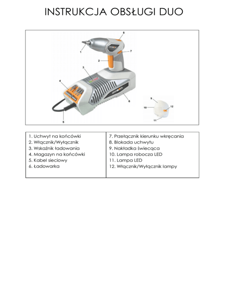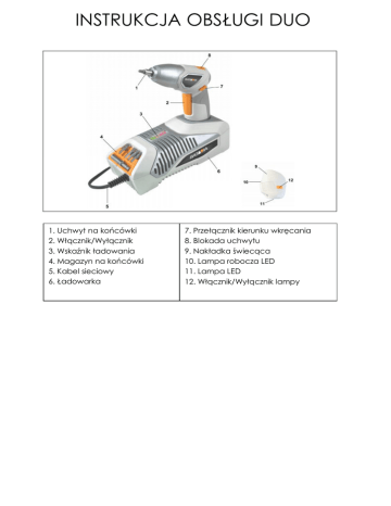 INSTRUKCJA OBSŁUGI DUO 1. Uchwyt na końcówki 2. Włącznik/Wyłącznik 3. Wskaźnik ładowania 4. Magazyn na końcówki 5. Kabel sieciowy 6. Ładowarka 7. Przełącznik kierunku wkręcania 8. Blokada uchwytu 9. Nakładka świecąca 10. Lampa robocza LED 11. Lampa LED 12. Włącznik/Wyłącznik lampy INSTRUKCJA OBSŁUGI DUO Szanowni Państwo Niezastosowanie się do ostrzeżeń i instrukcji może spowodować porażenie prądem, pożar i / lub ciężkie obrażenia ciała. Urządzenie jest wyposażone w następujące symbole: OSTRZEŻENIE - przeczytaj instrukcje, aby zmniejszyć ryzyko obrażeń. Utylizuj urządzenie prawidłowo Istnieją następujące symbol na ładowarce: Do stosowania w pomieszczeniach zamkniętych Stopień ochrony: IP20 OSTRZEŻENIE - przeczytaj instrukcje, aby zmniejszyć ryzyko obrażeń. Utylizuj urządzenie prawidłowo UWAGI BEZPIECZEŃSTWA Przeczytaj uważnie instrukcje i zapoznaj się z ostrzeżeniami. Niezastosowanie się do ostrzeżeń i instrukcji może spowodować porażenie prądem, pożar i / lub ciężkie obrażenia ciała. Termin "elektronarzędzie" w ostrzeżeniach odnosi się do elektronarzędzi zasilanych prądem sieciowym (z przewodu zasilającego) oraz baterią (bez kabla). Zachowaj te instrukcje bezpieczeństwa ostrożnie! 1.MIEJSCE PRACY a. Utrzymuj miejsce pracy w czystości i dobrze oświetlone. Nieporządek lub ciemne miejsca mogą powodować wypadki. b. Nie pracować w środowiskach zagrożonych wybuchem, w obecności łatwopalnych cieczy, gazów lub pyłów. Elektronarzędzia wytwarzają iskry, które mogą zapalić pył lub opary. c. Chronić dzieci i innych podczas pracy elektronarzędziem. Chwila nieuwagi może spowodować utratę kontroli nad urządzeniem. 2. BEZPIECEZEŃSTWO ELEKTRYCZNE a. Wtyczka urządzenia musi pasować do gniazda sieciowego. Wtyczka nie może być w żaden sposób modyfikowana. Nie należy stosować żadnych przejściówek z uziemieniem ochronnym. Oryginalne wtyczki i pasujące gniazda zmniejszają ryzyko porażenia prądem. b. Unikaj dotykania uziemionych powierzchni takich jak rury, grzejniki, piece i lodówki. Istnieje zwiększone ryzyko porażenia prądem, jeśli twoje ciało jest uziemione. c. Chronić urządzenie przed deszczem i wilgocią. Wnikanie wody w elektronarzędzia zwiększa ryzyko porażenia prądem. d. Nie nadużywaj kabla do przenoszenia urządzenia, aby się rozłączyć lub wyciągnąć wtyczkę z gniazdka. Trzymaj przewód z dala od źródeł ciepła, oleju, ostrych krawędzi lub ruchomych części. Uszkodzone lub poplątane kable zwiększają ryzyko porażenia prądem. e. Podczas pracy z elektronarzędziem na zewnątrz, należy używać tylko INSTRUKCJA OBSŁUGI DUO f. przedłużaczy, które nadają się również do zastosowania na zewnątrz. Zastosowanie nadaje się do odkrytego przedłużacza zmniejsza ryzyko porażenia prądem. Podczas pracy elektronarzędziem w wilgotnym otoczeniu, należy użyć wyłącznika rezydualnej. Zastosowanie wyłącznika zmniejsza ryzyko porażenia prądem. 3. BEZPIECZEŃSTWO OSÓB a. Bądź czujny, uważaj na to co robisz i zachowuj zdrowym rozsądek podczas pracy elektronarzędziem. Nie używaj elektronarzędzia, gdy jesteś zmęczony lub pod wpływem narkotyków, alkoholu lub leków. Chwila nieuwagi podczas pracy elektronarzędziem, może doprowadzić do poważnych obrażeń. b. Stosować środki ochrony osobistej i zawsze nosić okulary ochronne. Noszenie osobistego wyposażenia ochronnego, takiego jak maska przeciwpyłowa, antypoślizgowe obuwie robocze, kask ochronny lub ochraniacze uszu, w zależności od rodzaju i użytkowania elektronarzędzia, zmniejsza ryzyko obrażeń. c. Unikać przypadkowego uruchomienia. Upewnij się, że przełącznik jest wyłączony przed podłączeniem go do zasilania i / lub akumulatora, przed podniesieniem lub przeniesieniem. Jeśli nosisz urządzenie z palcem na wyłączniku lub masz urządzenie podłączenia do sieci elektrycznej, może to prowadzić do wypadków. d. Przed włączeniem elektronarzędzia Usunąć klucz do regulacji. Narzędzie lub klucz, które znajdują się w ruchomych częściach urządzenia może prowadzić do obrażeń ciała. e. Unikać nieprawidłowej postawy. Zapewnienie bezpieczeństwa i utrzymania równowagi w każdej chwili, prowadzi do bezpieczniejszego prowadzenia urządzenia. f. Nosić odpowiednią odzież. Nie należy nosić luźnej odzieży ani biżuterii. Włosy, odzież i rękawice trzymaj z dala od części ruchomych. Luźna odzież, biżuteria lub długie włosy mogą zostać pochwycone przez ruchome części. g. Gdy istnieje możliwość montażu przewodów do odsysania pyłu, upewnij się że są one prawidłowo zamontowane. system do odprowadzania pyłu zmniejsza zagrożenie. 4. Staranne obchodzenie się i użytkowanie elektronarzędzi a. Nie należy przeciążać urządzenia. Użyj do swojej pracy prawidłowego elektronarzędzia. Prawidłowe elektronarzędzie wykona pracę lepiej i bezpieczniej dla. b. Nie należy używać elektronarzędzia, którego przełącznik jest uszkodzony. Elektronarzędzie, które nie można włączyć lub wyłączyć może być niebezpieczne i musi zostać naprawione. c. Wyjąć wtyczkę z gniazdka i / lub wyjąć baterię przed dokonaniem jakichkolwiek regulacji, wymiany akcesoriów lub odłożeniem elektronarzędzia. Ten środek ostrożności zapobiega niezamierzone uruchomienie elektronarzędzia d. Przechowywać nieużywane elektronarzędzia w miejscu niedostępnym dla dzieci. Niech INSTRUKCJA OBSŁUGI DUO ludzie nie korzystają z urządzenia, które nie są zaznajomione z nim lub nie przeczytali instrukcji. Elektronarzędzia są niebezpieczne, gdy są używane przez osoby niedoświadczone. e. Utrzymywać maszynę w dobrym stanie tj. Sprawdź, czy ruchome części pracują prawidłowo i czy części są uszkodzone lub uszkodzone w taki sposób, że funkcja elektronarzędzia jest osłabiona. Jakichkolwiek uszkodzonych części przed użyciem urządzenia. Wi