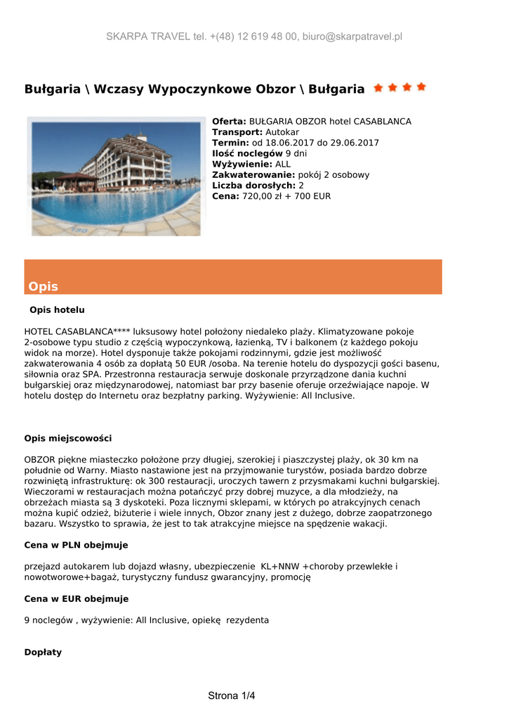 SKARPA TRAVEL tel. +(48) 12 619 48 00, [email protected] Bułgaria \ Wczasy Wypoczynkowe Obzor \ Bułgaria Oferta: BUŁGARIA OBZOR hotel CASABLANCA Transport: Autokar Termin: od 18.06.2017 do 29.06.2017 Ilość noclegów 9 dni Wyżywienie: ALL Zakwaterowanie: pokój 2 osobowy Liczba dorosłych: 2 Cena: 720,00 zł + 700 EUR Opis Opis hotelu HOTEL CASABLANCA**** luksusowy hotel położony niedaleko plaży. Klimatyzowane pokoje 2-osobowe typu studio z częścią wypoczynkową, łazienką, TV i balkonem (z każdego pokoju widok na morze). Hotel dysponuje także pokojami rodzinnymi, gdzie jest możliwość zakwaterowania 4 osób za dopłatą 50 EUR /osoba. Na terenie hotelu do dyspozycji gości basenu, siłownia oraz SPA. Przestronna restauracja serwuje doskonale przyrządzone dania kuchni bułgarskiej oraz międzynarodowej, natomiast bar przy basenie oferuje orzeźwiające napoje. W hotelu dostęp do Internetu oraz bezpłatny parking. Wyżywienie: All Inclusive. Opis miejscowości OBZOR piękne miasteczko położone przy długiej, szerokiej i piaszczystej plaży, ok 30 km na południe od Warny. Miasto nastawione jest na przyjmowanie turystów, posiada bardzo dobrze rozwiniętą infrastrukturę: ok 300 restauracji, uroczych tawern z przysmakami kuchni bułgarskiej. Wieczorami w restauracjach można potańczyć przy dobrej muzyce, a dla młodzieży, na obrzeżach miasta są 3 dyskoteki. Poza licznymi sklepami, w których po atrakcyjnych cenach można kupić odzież, biżuterie i wiele innych, Obzor znany jest z dużego, dobrze zaopatrzonego bazaru. Wszystko to sprawia, że jest to tak atrakcyjne miejsce na spędzenie wakacji. Cena w PLN obejmuje przejazd autokarem lub dojazd własny, ubezpieczenie KL+NNW +choroby przewlekłe i nowotworowe+bagaż, turystyczny fundusz gwarancyjny, promocję Cena w EUR obejmuje 9 noclegów , wyżywienie: All Inclusive, opiekę rezydenta Dopłaty Strona 1/4 SKARPA TRAVEL tel. +(48) 12 619 48 00, [email protected] 1. Obowiązkowo płatna taksa klimatyczna: osoba dorosła 1 EUR/dzień, dzieci 2-12 lat 50% 2. Do pokoju 1 osobowego 180 EUR ( na zapytanie). Zniżki W cenie uwzględniona PROMOCJĘ FIRST MINUTE: przy dojeździe autokarem – 100 zł / osoba przy dojeździe własnym – 50 zł / osoba 1. Dziecko do 2 lat płaci tylko płaci tylko 360 zł 2. Dziecko od 2 do10 lat jako 3 osoba w pokoju płacą kwotę w złotych + 50 EUR, 3. Osoba powyżej 10 jako 3 w pokoju płaci kwotę w złotych + 70% kwoty w EUR 4. STAŁY KLIENT: obejmuje osoby korzystające trzeci kolejny rok z naszej oferty ! Uwagi organizatora 1.Kwota w złotych płatna jest w Polsce, kwota w EUR płatna w Bułgarii. 2.Przy dojeździe własnym, gdy potrzebna jest faktura na całość i przy zakupie ubezpieczenia od kosztów rezygnacji wtedy obowiązkowo równowartość kwoty w EUR płatna jest w Polsce. Kwota w EUR przeliczana jest na zł wg kursu NBP pieniądz sprzedaż z dnia ostatniej wpłaty. 3.W dniu wykupienia imprezy/ wpłaty zaliczki klient ma możliwość wykupienia dodatkowego ubezpieczenia od kosztów rezygnacji z imprezy zgodnie z Ogólnymi Warunkmi Ubezpieczenia KOSZTÓW IMPREZY TURYSTYCZNEJ w wysokości 3,3% jednak nie później niż 5 dni od dnia podpisania umowy. 4. Wycieczki fakultatywne organizowane są przez lokalne biura podróży. 5.Doba hotelowa rozpoczyna się o godz 14 i kończy o godz 9. 6. Miejsca i godziny odjazdów autokarów podano w rozkładzie jazdy 7. Potrzebny DOWÓD OSOBISTY lub PASZPORT ! Prosze pamiętać również o dokumencie dla dzieci. 8. Dla osób dojeżdżających do Krakowa możemy zarezerwować przednocleg w cenie od 100 zł. Uwagi przewoźnika 1.Transport na trasach antenowych w Polsce możliwy jest mikrobusem, autokarem klasy turystycznej, samochodem osobowym lub innym przewoźnikiem np. Polskim Busem, Luxbusem, PKP, PKS itp. Ewentualną zmianę godzin odjazdów podamy najpóźniej na 24 godziny przed odjazdem. Trasa połączeń na terenie kraju zależy od zgłoszeń z poszczególnych miast, co może spowodować, ze przejazd nie będzie realizowany najkrótszą z możliwych tras. 2. Na trasach poza granicami Polski transport odbywa się autokarami wyposażonymi w siedzenia uchylne, klimatyzację, toalety, video i nagłośnienie. Przy małej ilości osób, możliwość przewozu uczestników małym autobusem bez WC i mini baru, wtedy toalety na postojach płatne przez Strona 2/4 SKARPA TRAVEL tel. +(48) 12 619 48 00, [email protected] przewoźnika. 3. Podane godziny wyjazdów i przyjazdów mogą ulec zmianie z różnych przyczyn np. złe warunki drogowe, atmosferyczne, zwiększanie ruchu na drogach szczególnie w szczycie sezonu letniego i inne. 4. Prosimy o przybycie na miejsce zbiórki najpóźniej 15 minut przed planowaną godziną odjazdu. Miejsca w autokarze są przydzielane w kolejności podpisania umowy, a klienci o miejscach informowani są przez obsługę na miejscu zbiórki. W autokarze obowiązuje całkowity zakaz palenia papierosów oraz spożywania alkoholu. Osoby korzystające z samego przejazdu, powinny obowiązkowo ubezpieczyć się na czas pobytu. Przewoźnik gwarantuje tylko ubezpieczenie na czas przejazdu. Ramowy program imprezy 1 dzień – wyjazd z Polski wg rozkładu jazdy, przejazd przez Słowację (dla chętnych posiłek w cenie ok 5 EUR), Węgry, Serbię lub Rumunię. 2 dzień – przyjazd do Bułgarii w godzinach południowych, zakwaterowanie, nocleg, 3-10 dzień - WYPOCZYNEK, możliwość wykupioenia wycieczek fakultatywnych 11 dzień – wykwaterowanie z pokoi do godz 10:00, czas wolny, wyjazd w droge powrotną ok godz 12:00-14:00 czasu bułgarskiego, przejazd przez Bułgarię i Serbie lub Rumunię, 12 dzień – przejazd przez Węgry, Słowację (dla chetnych posiłek w cenie ok 5 EUR), przyjazd do Krakowa między godziną 14:00 a 18:00 Praktyczne informacje Najbliższa placówka dyplomatyczna: Konsulat RP w Warnie ul. Sławiańska 18, 9000 Warna tel. (00-3595) 260-92-12/13 Obowiązująca waluta 1 LEVA = 100 stotinek 1 EUR = ok 