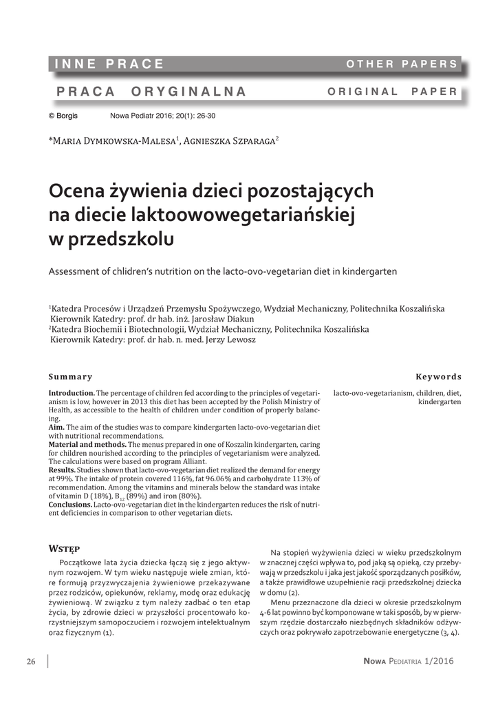 INNE PRACE PRACA © Borgis Borgis O T H E R PA P E R S ORYGINALNA ORIGINAL PA P E R Nowa Pediatr 2016; 20(1): 26-30 *Maria Dymkowska-Malesa1, Agnieszka Szparaga2 Ocena żywienia dzieci pozostających na diecie laktoowowegetariańskiej w przedszkolu Assessment of chlidren’s nutrition on the lacto-ovo-vegetarian diet in kindergarten Katedra Procesów i Urządzeń Przemysłu Spożywczego, Wydział Mechaniczny, Politechnika Koszalińska Kierownik Katedry: prof. dr hab. inż. Jarosław Diakun 2 Katedra Biochemii i Biotechnologii, Wydział Mechaniczny, Politechnika Koszalińska Kierownik Katedry: prof. dr hab. n. med. Jerzy Lewosz 1 Summary Key wo rd s Introduction. The percentage of children fed according to the principles of vegetarianism is low, however in 2013 this diet has been accepted by the Polish Ministry of Health, as accessible to the health of children under condition of properly balancing. Aim. The aim of the studies was to compare kindergarten lacto-ovo-vegetarian diet with nutritional recommendations. Material and methods. The menus prepared in one of Koszalin kindergarten, caring for children nourished according to the principles of vegetarianism were analyzed. The calculations were based on program Alliant. Results. Studies shown that lacto-ovo-vegetarian diet realized the demand for energy at 99%. The intake of protein covered 116%, fat 96.06% and carbohydrate 113% of recommendation. Among the vitamins and minerals below the standard was intake of vitamin D (18%), B12 (89%) and iron (80%). Conclusions. Lacto-ovo-vegetarian diet in the kindergarten reduces the risk of nutrient deficiencies in comparison to other vegetarian diets. Wstęp Początkowe lata życia dziecka łączą się z jego aktywnym rozwojem. W tym wieku następuje wiele zmian, które formują przyzwyczajenia żywieniowe przekazywane przez rodziców, opiekunów, reklamy, modę oraz edukację żywieniową. W związku z tym należy zadbać o ten etap życia, by zdrowie dzieci w przyszłości procentowało korzystniejszym samopoczuciem i rozwojem intelektualnym oraz fizycznym (1). 26 lacto-ovo-vegetarianism, children, diet, kindergarten Na stopień wyżywienia dzieci w wieku przedszkolnym w znacznej części wpływa to, pod jaką są opieką, czy przebywają w przedszkolu i jaka jest jakość sporządzanych posiłków, a także prawidłowe uzupełnienie racji przedszkolnej dziecka w domu (2). Menu przeznaczone dla dzieci w okresie przedszkolnym 4-6 lat powinno być komponowane w taki sposób, by w pierwszym rzędzie dostarczało niezbędnych składników odżywczych oraz pokrywało zapotrzebowanie energetyczne (3, 4). Nowa Pediatria 1/2016 Ocena żywienia dzieci pozostających na diecie laktoowowegetariańskiej w przedszkolu Im młodsze dziecko, tym bardziej widoczne są efekty niedoborów składników odżywczych w jego rozwoju, dlatego tak ważne jest ciągłe monitorowanie stanu odżywienia i sposobu żywienia dzieci, szczególnie przebywających w placówkach żywienia zbiorowego (przedszkola). W przedszkolu dzieciom podaje się najczęściej trzy posiłki, które stanowią około 70% całodziennej racji pokarmowej (CRP), określającej ilość produktów spożywczych dostarczających energii i składników pokarmowych zgodnie z dziennym zapotrzebowaniem organizmu (5, 6). Szacuje się, że obecnie w Polsce jest około 2 milionów wegetarian i liczba ta stale rośnie. Istnieje wiele rodzajów wegetarianizmu. Jednym z najbardziej popularnych jest laktoowowegetarianizm, który wyklucza spożywanie produktów pochodzenia zwierzęcego, jednakże dopuszcza do konsumpcji mleko i produkty mleczne. Ryzykiem takiej diety jest wystąpienie alergii na białko mleka lub nietolerancji spowodowanej nieproporcjonalną podażą laktozy oraz nadmiernym spożyciem mleka (7, 8). Wśród wegetarian ogromną grupę stanowią ludzie młodzi, którzy jako rodzice podejmują świadomą decyzję, iż dla ich dzieci najwłaściwsza jest dieta wegetariańska (9). Z szacunkowych danych wynika co prawda, że odsetek dzieci żywionych zgodnie z zasadami wegetarianizmu zarówno w Polsce, jak i w pozostałych krajach Unii Europejskiej jest niewielki (około 3%) (10-12), jednakże 12 marca 2013 roku dieta wegetariańska została uznana przez Ministra Zdrowia jako przystępna dla zdrowia dzieci i młodzieży pod warunkiem, iż zostanie ona prawidłowo zbilansowana (13). Cel pracy Celem niniejszej pracy była ocena diet dzieci pozostających na diecie laktoowowegetariańskiej w przedszkolu, w odniesieniu do zaleceń żywieniowych. Materiał i metody Ocenę żywienia w przedszkolu koszalińskim, do którego uczęszczały dzieci zarówno na diecie laktoowowegetariańskiej, jak i tradycyjnej przeprowadzono na podstawie jadłospisów dekadowych z sezonu wiosenno-letniego z 2014 roku (bez wliczonych sobót oraz niedziel). Materiał do badań stanowiło menu udostępniane rodzicom na tablicy ogłoszeń z wyszczególnieniem rodzajów produktów oraz ich gramaturą. Zgodnie z deklaracjami rodziców dzieci pozostających w placówce przedszkolnej, dieta laktoowowegetariańska była zgodna z ich wolą. Dodatkowo opiekunowie dzieci znali i zaakceptowali jadłospisy przedszkolne. Analizowane racje pokarmowe obejmowały trzy posiłki: śniadanie, obiad składający się z zupy i dania głównego oraz podwieczorek. Pierwsze śniadanie oraz kolację dzieci spożywały w domu, tym samym te posiłki nie podlegały ocenie. Racje pokarmowe analizowano pod względem energetyczności oraz zawartości witamin: A, D, E, C, PP i z grupy B (B1, B2, B6, B12) oraz składników mineralnych (wapń, magnez, żelazo, sód, potas, fosfor). Zawartość poszczególnych składników odżywczych w racjach pokarmowych obliczono z wykorzystaniem kalkulatora dietetycznego Aliant, który jest skutecznym narzędziem do układania, analizy i oceny jadłospisów (14). Wyniki analizowano statystycznie przy zastosowaniu pakietu MS Office-Excel, podając średnią i odchylenie standardowe 