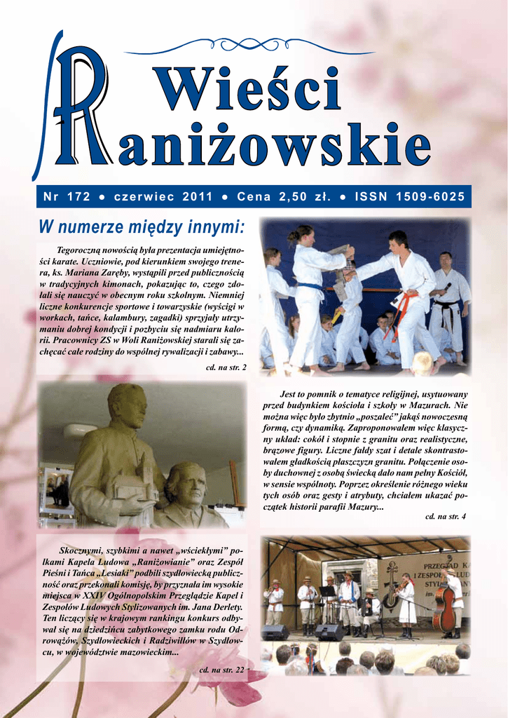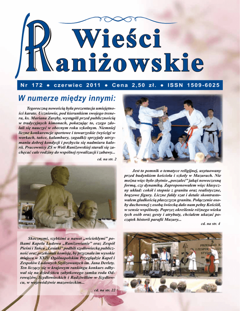 Wieści aniżowskie N r 1 7 2 ● c z e r w i e c 2 0 11 ● C e n a 2 , 5 0 z ł . ● I S S N 1 5 0 9 - 6 0 2 5 W numerze między innymi: Tegoroczną nowością była prezentacja umiejętności karate. Uczniowie, pod kierunkiem swojego trenera, ks. Mariana Zaręby, wystąpili przed publicznością w tradycyjnych kimonach, pokazując to, czego zdołali się nauczyć w obecnym roku szkolnym. Niemniej liczne konkurencje sportowe i towarzyskie (wyścigi w workach, tańce, kalambury, zagadki) sprzyjały utrzymaniu dobrej kondycji i pozbyciu się nadmiaru kalorii. Pracownicy ZS w Woli Raniżowskiej starali się zachęcać całe rodziny do wspólnej rywalizacji i zabawy... cd. na str. 2 Jest to pomnik o tematyce religijnej, usytuowany przed budynkiem kościoła i szkoły w Mazurach. Nie można więc było zbytnio „poszaleć” jakąś nowoczesną formą, czy dynamiką. Zaproponowałem więc klasyczny układ: cokół i stopnie z granitu oraz realistyczne, brązowe figury. Liczne fałdy szat i detale skontrastowałem gładkością płaszczyzn granitu. Połączenie osoby duchownej z osobą świecką dało nam pełny Kościół, w sensie wspólnoty. Poprzez określenie różnego wieku tych osób oraz gesty i atrybuty, chciałem ukazać początek historii parafii Mazury... cd. na str. 4 Skocznymi, szybkimi a nawet „wściekłymi” polkami Kapela Ludowa „Raniżowianie” oraz Zespół Pieśni i Tańca „Lesiaki” podbili szydłowiecką publiczność oraz przekonali komisję, by przyznała im wysokie miejsca w XXIV Ogólnopolskim Przeglądzie Kapel i Zespołów Ludowych Stylizowanych im. Jana Derlety. Ten liczący się w krajowym rankingu konkurs odbywał się na dziedzińcu zabytkowego zamku rodu Odrowążów, Szydłowieckich i Radziwiłłów w Szydłowcu, w województwie mazowieckim... cd. na str. 22 Wieści Raniżowskie nr 172 2 II Piknik Rodzinny w Woli Raniżowskiej Wychodząc naprzeciw oczekiwaniom lokalnej społeczności, a także spełniając jedno z priorytetowych zadań szkoły, 5 czerwca Zespół Szkół w Woli Raniżowskiej wraz z Radą Rodziców zorganizowali II Piknik Rodzinny. Podobnie jak w ubiegłym roku głównym celem tego wydarzenia była aktywizacja i integracja rodzin oraz pracowników placówki z przedstawicielami różnych środowisk, w tym samorządowych. O godzinie 14.00 piknik został zainaugurowany przez dyrektor, mgr Irenę Katę, która powitała obecnych oraz wręczyła podziękowania sponsorom imprezy. Następnie na okazałej estradzie, która została umieszczona na placu obok kościoła, pojawiały się kolejno, przygotowane przez nauczycielki Zespołu Szkół, grupy dziecięce i młodzieżowe. Zaprezentowały one krótkie programy artystyczne, w którym można było usłyszeć echa wiosny, Dnia Matki oraz Dnia Ks. Marian Zaręba podczas pokazu Dziecka. karate. Występy młodszych uczniów w strojach ludowych. Starsi uczniowie demonstrują swoje umiejętności w karate. Nie zabrakło również występu zespołu tanecznego „Wolanie”. Jego członkowie w trzech wejściach zaprezentowali zarówno tańce nowoczesne (jive, cha – cha), jak i tradycyjne (wiązanka tańców rzeszowskich, oberek, kujawiak, mazur). Na scenie pojawiły się również solistki – absolwentki ZS w Woli Raniżowskiej: Marta Kopeć i Klaudia Babiarz, które swoimi pięknymi barwami głosu urzekły uczestników pikniku. „Echa wiosny” wykonaniu Partycji Rembisz i Anny Rembisz. Malowanie motylków na twarzy było hitem pikniku. Walc angielski został pokazany z pełnym uczuciem. Wieści Raniżowskie nr 172 Widowiskowa część karate – rozbijanie dachówek. Tegoroczną nowością była prezentacja umiejętności karate. Uczniowie, pod kierunkiem swojego trenera – ks. M. Zaręby, wystąpili przed publicznością w tradycyjnych kimonach, pokazując to, czego zdołali się nauczyć w obecnym roku szkolnym. Imprezę uświetnił również występ znakomitej Orkiestry Dętej z Dobrynina, której towarzyszyły: śpiew solistki, indywidualna gra na saksofonie oraz występy grupy baletowej. Cała zabawa wypełniona była wieloma atrakcjami. Zarówno dzieci, jak i dorośli mogli znaleźć coś dla siebie. Trampolina, dmuchana zjeżdżalnia, malowanie twarzy, grill, wata cukrowa, popcorn, kawa oraz domowe wypieki, o które zadbali rodzice uczniów, stały się nieodłącznym elementem pikniku. 3 Koncert orkiestry dętej z pokazem grupy baletowej z Dobrynina. Wójt Daniel Fila odbiera podziękowania od organizatorów pikniku: dyr. Ireny Katy i Józefa Ozgi. Wśród gości pikniku był poseł Zbigniew Chmielowiec. Obok dyr. Irena Kata i sołtys Edward Kasica. Finałowym punktem programu był mecz piłki nożnej rozegrany pomiędzy drużyną księży a drużyną Sołtysa Woli Raniżowskiej. Znaczącą przewagą 10:5 zwyciężyli księża, a na miano króla strzelców zasłużył ks. Marian Zaręba – zdobywca pięciu bramek. Piknik i tym razem spotkał się z dużym zainteresowaniem i ciepłym przyjęciem. Można powiedzieć, że staje się on nową tradycją we wsi Wola Raniżowska. Istotnym jest fakt, że w jego zorganizowanie i przebieg zaangażowane było wiele środowisk – co świadczy o integracji – a to przecież był jeden z głównych celów imprezy. cd. na str. 4 Niemniej liczne konkurencje sportowe i towarzyskie (wyścigi w workach, tańce, kalambury, zagadki) sprzyjały utrzymaniu dobrej kondycji i pozbyciu się nadmiaru kalorii. Pracownicy ZS w Woli Raniżowskiej starali się zachęcać całe rodziny do wspólnej rywalizacji i zabawy. Pokazom na scenie przyglądało się setki mieszkańców Woli Raniżowskiej. Turniej rodzin odbywający się na scenie. Wieści Raniżowskie nr 172 4 Klaudia Babiarz. Marta Kopeć. cd. ze str. 3 Podczas II Pikniku Rodzinnego w Woli Raniżowskiej Stowarzyszenie Lokalna Grupa Działania „Siedlisko” z siedzibą w Kolbuszowej promowało swą działalność na rzecz zrównoważonego rozwoju obszarów wiejskich. Uczestnicy mieli okazję do zapozn