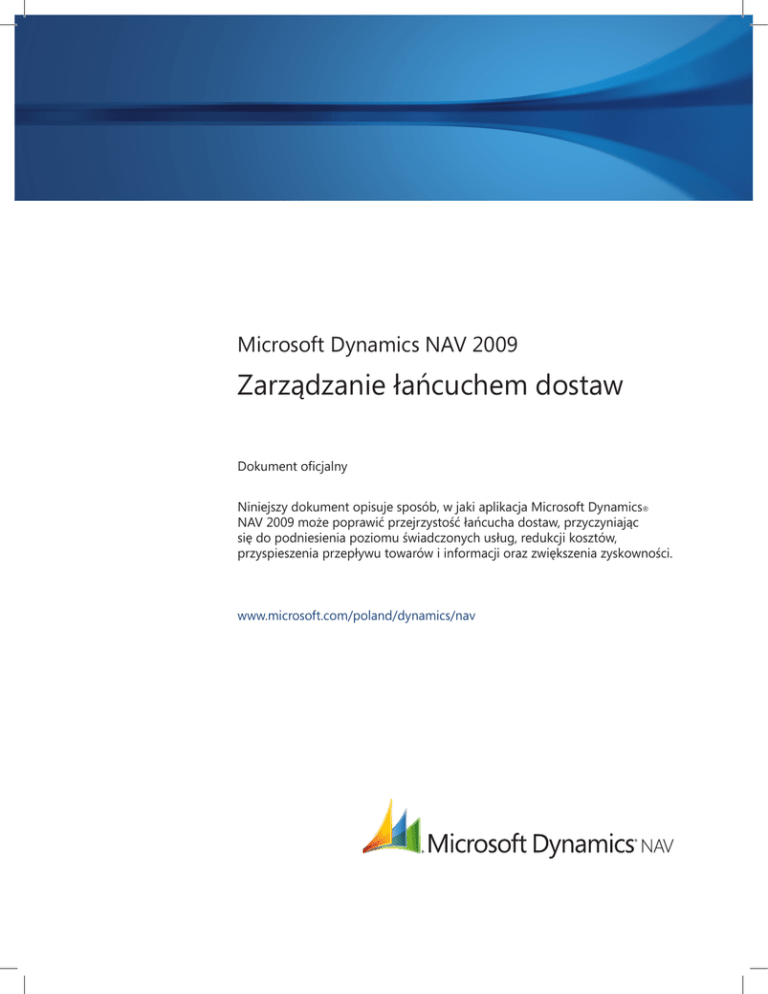 Microsoft Dynamics NAV 2009 Zarządzanie łańcuchem dostaw Dokument oficjalny Niniejszy dokument opisuje sposób, w jaki aplikacja Microsoft Dynamics® NAV 2009 może poprawić przejrzystość łańcucha dostaw, przyczyniając się do podniesienia poziomu świadczonych usług, redukcji kosztów, przyspieszenia przepływu towarów i informacji oraz zwiększenia zyskowności. www.microsoft.com/poland/dynamics/nav Spis treści Wstęp.................................................................................................................................. 3 Streszczenie........................................................................................................................ 3 Wyzwania związane z zarządzaniem łańcuchem dostaw.............................................. 3 Podejmowanie wyzwań: W jaki sposób technologia może pomóc.............................. 4 Zoptymalizuj sprawność łańcucha dostaw dzięki Microsoft Dynamics NAV.............. 4 Udostępniaj pracownikom informacje, których potrzebują...........................................................................................5 Usprawniaj i automatyzuj procesy, aby podnieść produktywność...............................................................................7 Usprawniaj proces uzupełniania zapasów i zarządzania nimi.......................................................................................9 Optymalizuj procesy zachodzące w obrębie przedsiębiorstwa i łańcucha dostaw.......................................... ..11 Obniżaj ogólne koszty zarządzania firmą........................................................................................................................... 11 Zarys technologii............................................................................................................. 12 Wnioski.............................................................................................................................. 13 Załącznik: Nowe, ulepszone funkcje związane z zarządzaniem łańcuchem dostaw w Microsoft Dynamics NAV 2009..................................................................... 14 2 MICROSOFT DYNAMICS NAV 2009: ZARZĄDZANIE ŁAŃCUCHEM DOSTAW Wstęp Niniejszy dokument jest przeznaczony dla średnich przedsiębiorstw, których podstawowe operacje wiążą się z produkcją lub dystrybucją towarów i które poszukują skutecznych rozwiązań umożliwiających poprawę integracji, przejrzystości i wydajności łańcucha dostaw. Opisuje on, w jaki sposób Microsoft Dynamics NAV może połączyć partnerów handlowych, zoptymalizować ich współpracę oraz ułatwić przepływ informacji biznesowych zarówno w obrębie jednego przedsiębiorstwa, jak i między firmami, co umożliwi podniesienie wydajności, prędkości działania i zyskowności całego łańcucha dostaw. Po przeczytaniu niniejszego dokumentu zrozumiesz: • dlaczego coraz większa złożoność sieci dostaw wymaga lepszego integrowania i synchronizowania przepływu informacji i procesów między partnerami handlowymi w łańcuchu dostaw, • w jaki sposób technologia może zwiększyć przejrzystość i wydajność procesów związanych z dostawami zarówno w obrębie przedsiębiorstwa, jak i w całym łańcuchu dostaw, • jak Microsoft Dynamics NAV może pomóc przedsiębiorstwom i ich partnerom handlowym w usprawnieniu interakcji, pogłębieniu współpracy, efektywnym zarządzaniu i podniesieniu zyskowności na drodze do wspólnego sukcesu. Streszczenie W czasach, w których łańcuchy dostaw i kanały dystrybucji towarów stają się coraz bardziej złożone, skuteczne zarządzanie rozbudowanymi łańcuchami dostaw ma kluczowe znaczenie dla zapewnienia zyskowności i zadowolenia klientów. Wytwórcy i dystrybutorzy potrzebują zintegrowanego rozwiązania służącego do zarządzania przedsiębiorstwem, umożliwiającego sprawny przepływ informacji w obrębie całej firmy oraz podniesienie poziomu przejrzystości łańcucha dostaw. Odpowiednia technologia może pomóc przedsiębiorstwu usprawnić procesy, obniżyć koszty, poprawić komunikację i współpracę z partnerami handlowymi, podejmować przemyślane decyzje oraz podnieść sprawność działania. Dzięki temu można szybko reagować na zmieniające się warunki rynkowe. Microsoft Dynamics NAV jest zintegrowanym rozwiązaniem do zarządzania biznesem, umożliwiającym małym i średnim firmom zwiększenie przejrzystości łańcucha dostaw, usprawnienie przeprowadzanych procesów oraz obniżenie ogólnego kosztu zarządzania przedsiębiorstwem. Zintegrowanie funkcji zaopatrzenia, zarządzania zapasami, magazynowania, produkcji i dystrybucji z zarządzaniem finansami, kontaktami z klientami i innymi procesami zachodzącymi w firmie umożliwia udostępnienie precyzyjnych, aktualnych informacji zarówno potrzebującym ich pracownikom przedsiębiorstwa, jak i partnerom handlowym. Elastyczna, modułowa struktura aplikacji umożliwia dodawanie nowych funkcji lub ich personalizowanie w dowolnym momencie, dzięki czemu można ją dostosować do wzrostu i ewolucji firmy. Microsoft Dynamics NAV umożliwia przedsiębiorstwom stworzenie zintegrowanego łańcucha dostaw, a więc i to podniesienie poziomu zadowolenia klientów, zwiększenie zyskowności łańcucha dostaw oraz uzyskanie przewagi nad konkurencją. Wyzwania związane z zarządzaniem łańcuchem dostaw Zarządzanie łańcuchem dostaw nigdy nie było tak trudne jak dziś, w czasach coraz bardziej globalnego środowiska biznesowego, w którym pojawia się wiele nowych kanałów dystrybucji i dostaw, funkcjonujących ponad granicami geograficznymi i politycznymi. Rozwój globalnej konkurencji oznacza, że klienci w coraz większym stopniu mogą żądać niższych cen, szybszej realizacji zamówień i wyższej jakości usług. Jednocześnie wymagają większego wyboru i możliwości personalizowania produktów i ich opakowań, czego rezultatem jest wzro