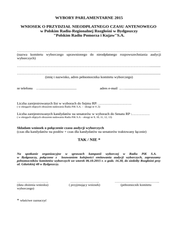 WYBORY PARLAMENTARNE 2015 WNIOSEK O PRZYDZIAŁ NIEODPŁATNEGO CZASU ANTENOWEGO w Polskim Radiu-Regionalnej Rozgłośni w Bydgoszczy "Polskim Radiu Pomorza i Kujaw"S.A. …………………………………………………………………………………………………............ (nazwa komitetu wyborczego uprawnionego do nieodpłatnego rozpowszechniania audycji wyborczych) …………………………………………………………………………………………………............ ……………………………………………………………………………………................................ (imię i nazwisko, adres pełnomocnika komitetu wyborczego) nr telefonu …......................................... adres e-mail ..…....................................... Liczba zarejestrowanych list w wyborach do Sejmu RP: ………………………. ( w okręgach objętych obszarem nadawania Radia PiK S.A. – okręgi nr 4 ,5) Liczba zarejestrowanych kandydatów na senatorów w wyborach do Senatu RP :…………… ( w okręgach objętych obszarem nadawania Radia PiK S.A – okręgi nr 9, 10, 11, 12, 13) Składam wniosek o połączenie czasu audycji wyborczych (czas dla kandydatów na posłów + czas dla kandydatów na senatorów traktowany łącznie) TAK / NIE * Na spotkanie organizacyjne w sprawach kampanii wyborczej w Radiu PiK S.A. w Bydgoszczy, połączone z losowaniem kolejności emitowania audycji wyborczych, zapraszamy pełnomocników komitetów wyborczych we wtorek 06.10.2015 r. o godz. 16.30, do siedziby Rozgłośni przy ul. Gdańskiej 48 w Bydgoszczy. ……………………….. (data złożenia wniosku) wyborczego) * właściwe zaznaczyć ……………………... ( przyjmujący wniosek) ………………………………….. (pełnomocnik komitetu