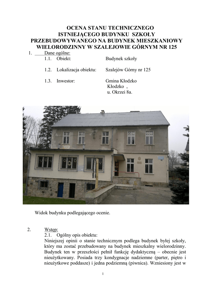 OCENA STANU TECHNICZNEGO ISTNIEJĄCEGO BUDYNKU SZKOŁY PRZEBUDOWYWANEGO NA BUDYNEK MIESZKANIOWY WIELORODZINNY W SZALEJOWIE GÓRNYM NR 125 1. Dane ogólne: 1.1. Obiekt: Budynek szkoły 1.2. Lokalizacja obiektu: Szalejów Górny nr 125 1.3. Inwestor: Gmina Kłodzko Kłodzko , u. Okrzei 8a. Widok budynku podlegającego ocenie. 2. Wstęp: 2.1. Ogólny opis obiektu: Niniejszej opinii o stanie technicznym podlega budynek byłej szkoły, który ma zostać przebudowany na budynek mieszkalny wielorodzinny. Budynek ten w przeszłości pełnił funkcję dydaktyczną – obecnie jest nieużytkowany. Posiada trzy kondygnacje nadziemne (parter, piętro i nieużytkowe poddasze) i jedna podziemną (piwnica). Wzniesiony jest w 1 technologii tradycyjnej – jego elementy konstrukcyjne są masywne. Przedmiotowy budynek posiada jedną klatkę schodową. Budynek posiada stropy drewniane i ceramiczny nad piwnicą. Klatka schodowa wykonana jest również w technologii żelbetowej, schody na poddasze drewniane. Klatka schodowa nie spełnia obecnie obowiązujących przepisów co do wysokości i szerokości stopni oraz szerokości spoczników. Elewacja budynku wymaga remontu. Budynek nie jest przystosowany dla osób niepełnosprawnych. 2.2. Podstawowe dane techniczne przedmiotowego budynku: Powierzchnia zabudowy: 247,50 m2 Powierzchnia całkowita: 510,0 m2 Kubatura: 1520 m3 Fundamenty: Na etapie inwentaryzacji nie dokonano odkrywek. Ustrój konstrukcyjny wskazuje na występowanie ław wykonanych w technologii monolitycznej wylewanych na mokro. Konstrukcja nośna: Konstrukcję nośną budynku stanowią murowane ściany nośne i drewniane stropy usztywniające. Ściany zewnętrzne części nadziemnej i piwnic Ściany zewnętrzne wykonano jako tradycyjne murowane z cegły pełnej o różnych grubościach. Otynkowane dwustronnie. Ściany wewnętrzne: Ściany wewnętrzne nośne murowane z cegły pełnej. Ściany działowe zostały wykonane z cegły ceramicznej, pełnej i dziurawki. Stropy: Stropy wykonane są jako drewniane. Klatka schodowa: Klatka schodowa została wykonana jako żelbetowa. Schody zewnętrzne: żelbetowe monolityczne. Konstrukcja dachu: Konstrukcję dachu stanowi drewniana więźba dachowa. Poszycie dachowe: Poszycie dachowe wykonano z blachy. Wentylacja: Obiekt wentylowany jest grawitacyjnie. Stolarka okienna: Stolarkę okienną stanowi w większości stolarka skrzynkowa drewniana. 2 Stolarka drzwiowa: Stolarkę drzwiową wewnętrzną stanowi w większości stolarka, płycinowa i drewniana Stolarka drzwiowa zewnętrzna wykonana jako drewniana. Okładziny i wykładziny: węzły higieniczno – sanitarne wyłożone są płytkami ceramicznymi. Ciągi komunikacyjne wyłożono lastryko. Pozostałe pomieszczenia - wykładzina PCV. Tynki: Tynki zewnętrzne wykonano jako cem-wap zacierane na gładko. Na elewacjach zamontowane są gzymsy, nie wystepują inne elementy ozdobne. Tynki wewnętrzne stanowią tynki cem-wap zacierane na gładko. Powłoki malarskie: Podstawową powłokę malarską stanowi farba emulsyjna. Ciągi komunikacyjne pomalowano farba olejną do wysokości ~2m. Kominy: tradycyjne murowane z cegły. Na górze zakończone betonową czapą. 3. Ocena stanu technicznego poszczególnych elementów budynku Fundamenty: nie dokonano odkrywek. Na podstawie wizji lokalnej nie stwierdzono zarysowań na ścianach mogących być wpływem osiadania fundamentów. Izolacje poziome i pionowe: Izolacje pionowe i poziome nieszczelne lub ich brak. Konstrukcja nośna: Konstrukcja nośna budynku (ściany nośne, belki, podciągi) jest w stanie dobrym. Nie zaobserwowano ugięć ani zarysowań tych elementów konstrukcji nośnej przedmiotowego budynku. Konstrukcja drewnianego stropu nad parterem w stanie niezadowalającym – stwierdzono ugięcia. Ściany zewnętrzne: Ściany zewnętrzne budynku pod względem konstrukcyjnym spełniają warunki bezpiecznej pracy. Zaobserwowano zawilgocenie ścian zewnętrznych spowodowane nieszczelnością lub brakiem izolacji pionowej i poziomej. 3 Ściany wewnętrzne: Ściany wewnętrzne nie wykazują spękań. Stropy: stan techniczny stropu drewnianego nad piętrem nie budzi zastrzeżeń (wymaga jedynie docieplenia), natomiast stan techniczny stropu drewnianego nad parterem jest w stanie niezadawalającym – wymaga wzmocnienia lub wymiany na ceramiczny. Klatki schodowe, schody wewnętrzne: Klatki schodowe zostały wykonane jako żelbetowe. Stan konstrukcji biegów schodowych nie budzi zastrzeżeń. Natomiast szerokość biegów schodów i spoczników nie jest zgodna z obowiązującymi przepisami dla tego typu budynków. Schody zewnętrzne: schody zewnętrzne wchodzące w skład budynku są w stanie dostateczny – wymagają jedynie drobnych napraw. Konstrukcja dachu: Konstrukcja nośna dachu w stanie dobrym. Nie zaobserwowano ugięć konstrukcji. Pokrycie dachowe: Pokrycie dachowe nie wykazuje nieszczelności – pokrycie dachu w stanie dobrym po remoncie. Problematyczna jest tylko kwestia izolacji termicznej. Wentylacja:. Przewody kominowe – wentylacja grawitacyjna wykonana jest z dużą niedokładnością – wentylacja grawitacyjna częściowo sprawna. Ponadto części kominów wystające ponad dach wykazują duże zużycie. Należy udrożnić przewody wentylacji grawitacyjnej i dostosować je do aktualnych przepisów. Obróbki blacharskie, rynny i rury spustowe. Wszystkie obróbki blacharskie, rynny i rury spustowe wykazują duże zniszczenie i nadają się do wymiany. Stolarka okienna: Stolarka okienna nie spełnia wymogów normy cieplnej. Wykazuje również duże zużycie. Stolarka drzwiowa: Stolarka drzwiowa budynku wykazuje duże zużycie. Wymiary ościeżnic w świetle w większości przypadków nie spełniają aktualnych wymagań stawianych tego typu obiektom, szczególnie w pomieszczeniach sanitarnych. Okładziny, wykładziny i posadzki: Istniejące okładziny z płytek ceramicznych nie spełniają wymogów higieniczno-sanitarnych. Duże zużycie tych okładzin utrud