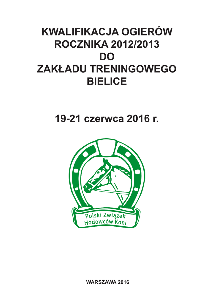 KWALIFIKACJA OGIERÓW ROCZNIKA 2012/2013 DO ZAKŁADU TRENINGOWEGO BIELICE 19-21 czerwca 2016 r. WARSZAWA 2016 DZIAŁ KSIĄG STADNYCH I IDENTYFIKACJI POLSKI ZWIĄZEK HODOWCÓW KONI ul. Koszykowa 60/62 m. 16, 00-673 Warszawa tel. 22 628-03-61, 22 629-95-31 www.pzhk.pl ISSN 1508-7417 Wszelkie prawa PZHK zastrzeżone. Przedruk i kopiowanie materiałów zawartych w Katalogu w całości lub częściowo wymaga pisemnego zezwolenia PZHK. Nakład: 70 egz., cena: 10 zł 2 Stacjonarny trening ogierów ras szlachetnych w 2016 r. Terminy kwalifikacji i prób dzielności w 2016 r. Rodzaj próby ZT Data kwalifikacji Data próby Ogiery szlachetne – m, wlkp, sp i import. (trening wierzchowy) ZT Bielice 19-21 czerwca 28-29 września Ogiery śląskie, szlachetne (trening zaprzęgowy) ZT Książ 16 sierpnia 14-15 października Opłaty KOSZT (brutto): • 100-dniowego treningu wierzchowego wynosi 6.000 zł • 60-dniowego treningu zaprzęgowego wynosi 3.240 zł W przypadku zaakceptowania przez Ministerstwo Rolnictwa i Rozwoju Wsi złożonego przez PZHK programu dotowania oceny wartości użytkowej ogierów poddawanych 60/100-dniowemu treningowi, będzie możliwość dofinansowania przez PZHK do 70%* kosztów takiego treningu. * dotyczy właścicieli ogierów, którzy zgodnie z zapisami Rozporządzenia Komisji (UE) nr 702/2014 z dnia 25 czerwca 2014 r. są mikro-, małymi- lub średnimi przedsiębiorcami. Zgłoszenia W zgłoszeniu ogiera do OZHK/WZHK należy podać jego nazwę i numer identyfikacyjny (z paszportu), dane właściciela (imię, nazwisko/nazwę, NIP, PESEL/REGON, serię i numer dowodu osobistego właściciela, podmiot wystawiający dokument, adres, numer telefonu kontaktowego) z adnotacją, że jest to zgłoszenie ogiera do ZT. Dane te będą niezbędne w związku z podpisywaniem przez PZHK umowy z właścicielami ogierów zakwalifikowanych do treningu. Badania markerów genetycznych Ogiery zakwalifikowane do treningu muszą mieć potwierdzone pochodzenie po obojgu rodzicach. W tym celu lekarz weterynarii pracujący na zlecenie Zakładu Treningowego pobiera krew zakwalifikowanym ogierom i wysyła ją do analizy. Pochodzenie potwierdza się na podstawie badań markerów genetycznych ogiera i jego rodziców. Jeśli wynik badania wykaże niezgodność pary rodzicielskiej lub w przypadku braku możliwości potwierdzenia pochodzenia po obojgu rodzicach, ogier zostanie wycofany z treningu. W takiej sytuacji koszty pobytu i treningu ogiera w ZT pokrywa właściciel. UWAGA: Tylko zakwalifikowanym do treningu ogierom przysługuje dotacyjne badanie markerów genetycznych. 3 Ogiery hodowli zagranicznej Ogiery zagraniczne (z właściwych ksiąg stadnych – patrz strona: www.pzhk.pl) muszą zostać zgłoszone do właściwego OZHK/WZHK oraz wpisane do bazy PZHK. Należy pamiętać, iż w paszporcie zagranicznym ogiera winien być wpisany polski właściciel, a dokonać tego winien związek rodzimy (czyli zagraniczny), który wydał paszport. W celu zarejestrowania ogiera hodowli zagranicznej w polskiej bazie pracownik odpowiedniego OZHK/WZHK musi zidentyfikować konia, m. in. poprzez porównanie z opisem graficznym w jego paszporcie. Pracownik OZHK/WZHK wykonuje kserokopię stron z paszportu: z datą urodzenia i nazwą, z rodowodem i opisem oraz ze stroną z wpisanym polskim właścicielem i nazwą pod jaką został zarejestrowany koń. Jeżeli dokumenty konia nie zostały wystawione w języku angielskim, francuskim lub niemieckim, właściciel jest zobowiązany przetłumaczyć je u tłumacza przysięgłego i tłumaczenie to wraz z oryginalnym dokumentem hodowlanym dostarczyć do OZHK/WZHK. Zdrowie Ogiery muszą posiadać świadectwo zdrowia wystawione przez lekarza weterynarii oraz paszport konia z wpisanymi szczepieniami przeciwko grypie. Brak szczepień bądź jakiekolwiek nieprawidłowości w schemacie szczepień spowodują niedopuszczenie ogiera do kwalifikacji. Obowiązuje następujący schemat szczepień: 1. szczepienia bazowe: o pierwsze szczepienie – w dniu rozpoczęcia szczepień o drugie szczepienie – nie wcześniej niż 21. dnia i nie później niż 92. dnia od pierwszego szczepienia 2. szczepienie przypominające: o co 6 miesięcy od ostatniego szczepienia (dopuszczalny jest 21-dniowy okres przekroczenia terminu); o żadne szczepienie przypominające nie może się odbyć później niż 7 dni przed przyby ciem na kwalifikację. W przypadku wszelkiego rodzaju zmian skórnych, właściciel zobligowany jest przedstawić wynik badania laboratoryjnego z okresu nie wcześniej niż dwu tygodni przed kwalifikacją. Brak wyników badań skutkować będzie nie przyjęciem ogiera do ZT. Ogier bez oporów musi podawać wszystkie nogi. W czasie kwalifikacji, przy prezentowaniu ogierów pod siodłem, dopuszczone jest stosowanie na przednich nogach ochraniaczy o wymiarach do 30 cm. Stosowanie owijek na przednich lub tylnych kończynach nie jest dopuszczone. W czasie kwalifikacji ogier nie może być pod wpływem środków pobudzających ani uspokajających (doping). Kierownik Zakładu ma prawo do 18 dnia po kwalifikacji wycofać ogiera z treningu, gdy jego zachowanie odbiega od normy. O tym fakcie musi być powiadomiony pisemnie właściciel oraz PZHK Przybywające do ZT ogiery, mimo braku widocznych zmian skórnych, mogą być nosicielami np. grzybicy i pomimo przestrzegania zasad higieny przez organizatora treningu osobniki mniej odporne mogą zachorować i zostać czasowo wycofane z pracy, co odbije się na wyniku próby dzielności. Dlatego zalecamy, aby przybywające na kwalifikacje ogiery zostały uodpornione na tę chorobę za pomocą szczepienia przeciw grzybicy (podobna zasada obowiązuje np. w Niemczech). Uwaga: na każdym etapie kwalifikacji i treningu wykluczone zostaną ogiery, u których stwierdzi się występowanie wad zwrotnych (łykawość, dychawica świszcząca, wartogłowienie, ślepota miesięczna) oraz wad uniemożliwiających wpis do księgi (obustronna ślepota, nieprawidłowa budo
