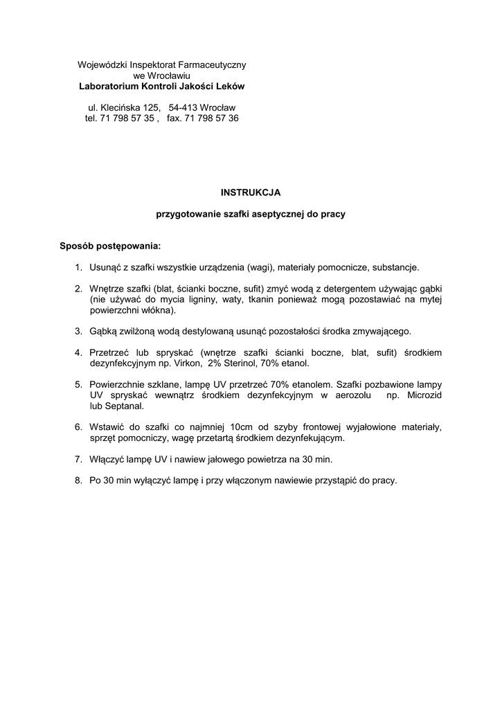 Wojewódzki Inspektorat Farmaceutyczny we Wrocławiu Laboratorium Kontroli Jakości Leków ul. Klecińska 125, 54-413 Wrocław tel. 71 798 57 35 , fax. 71 798 57 36 INSTRUKCJA przygotowanie szafki aseptycznej do pracy Sposób postępowania: 1. Usunąć z szafki wszystkie urządzenia (wagi), materiały pomocnicze, substancje. 2. Wnętrze szafki (blat, ścianki boczne, sufit) zmyć wodą z detergentem używając gąbki (nie używać do mycia ligniny, waty, tkanin ponieważ mogą pozostawiać na mytej powierzchni włókna). 3. Gąbką zwilżoną wodą destylowaną usunąć pozostałości środka zmywającego. 4. Przetrzeć lub spryskać (wnętrze szafki ścianki boczne, blat, sufit) środkiem dezynfekcyjnym np. Virkon, 2% Sterinol, 70% etanol. 5. Powierzchnie szklane, lampę UV przetrzeć 70% etanolem. Szafki pozbawione lampy UV spryskać wewnątrz środkiem dezynfekcyjnym w aerozolu np. Microzid lub Septanal. 6. Wstawić do szafki co najmniej 10cm od szyby frontowej wyjałowione materiały, sprzęt pomocniczy, wagę przetartą środkiem dezynfekującym. 7. Włączyć lampę UV i nawiew jałowego powietrza na 30 min. 8. Po 30 min wyłączyć lampę i przy włączonym nawiewie przystąpić do pracy.