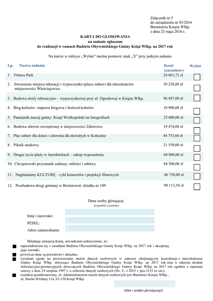 Załącznik nr 5 do zarządzenia nr 83/2016 Burmistrza Książa Wlkp. z dnia 23 maja 2016 r. KARTA DO GŁOSOWANIA na zadanie zgłoszone do realizacji w ramach Budżetu Obywatelskiego Gminy Książ Wlkp. na 2017 rok Na karcie w rubryce „Wybór” można postawić znak „X” przy jednym zadaniu Lp. Nazwa zadania Koszt szacunkowy 24 801,72 zł 1. Fitness Park 2. Stworzenie miejsca rekreacji i wypoczynku (placu zabaw) dla mieszkańców miejscowości Włościejewice 30 238,80 zł 3. Budowa strefy rekreacyjno – wypoczynkowej przy ul. Ogrodowej w Książu Wlkp. 96 897,00 zł 4. Bieg kolorów- impreza biegowa i festiwal kolorów 10 900,00 zł 5. Pamiętnik naszej gminy- Książ Wielkopolski na fotografiach 25 000,00 zł 6. Budowa siłowni zewnętrznej w miejscowości Zaborowo 19 474,00 zł 7. Plac zabaw dla dzieci i siłownia dla dorosłych w Kołacinie 44 753,60 zł 8. Piknik naukowy 21 550,00 zł 9. Drugie życie plaży w Jarosławkach – zakup wyposażenia 68 000,00 zł 10. Chrząstowski przystanek zadumy, miłości i zabawy 84 500,00 zł 11. Nagłaśniamy KULTURĘ – cykl koncertów i projekcji filmowych 46 750,00 zł 12. Przebudowa drogi gminnej w Brzóstowni- działka nr 109 98 113,50 zł Wybór Dane osoby głosującej (wypełnić czytelnie) Imię i nazwisko: PESEL: Adres zamieszkania: Składając niniejszą Kartę, oświadczam jednocześnie, że: zapoznałem/am się z zasadami Budżetu Obywatelskiego Gminy Książ Wlkp. na 2017 rok i akceptuję jego warunki, powyższe dane są prawdziwe i aktualne, wyrażam zgodę na przetwarzanie moich danych osobowych w zakresie obejmującym konsultacje z mieszkańcami Gminy Książ Wlkp. dotyczące Budżetu Obywatelskiego Gminy Książ Wlkp. na 2017 rok oraz w zakresie działań informacyjno-promocyjnych dotyczących Budżetu Obywatelskiego Gminy Książ Wlkp. na 2017 rok zgodnie z zapisami ustawy z dnia 29 sierpnia 1997 r. o ochronie danych osobowych (Dz. U. z 2015 r. poz.2135 ze zm.), zostałem poinformowany, że Administratorem moich danych osobowych jest Burmistrz Książa Wlkp., ul. Stacha Wichury 11a, 63-130 Książ Wlkp. (data i podpis głosującego) Informacja dotycząca ważności głosu Głosować można tylko na jedno zadanie, stawiając znak „X” w kratce z prawej strony obok nazwy zadania. Postawienie znaku „X” w więcej niż jednej kratce lub niepostawienie znaku „X” w żadnej kratce powoduje nieważność głosu. Głos jest nieważny, w szczególności również w przypadku, gdy: 1) Karta do głosowania będzie wypełniona nieczytelnie lub nie będzie zawierała wszystkich wymaganych danych, 2) w wyniku weryfikacji Karty do głosowania zostanie stwierdzone, że podane w niej dane osoby głosującej są błędne, 3) będzie oddany przez osobę niebędącą mieszkańcem Gminy Książ Wlkp. lub przez osobę, która w dacie rozpoczęcia konsultacji, nie ma ukończonych 18 lat.