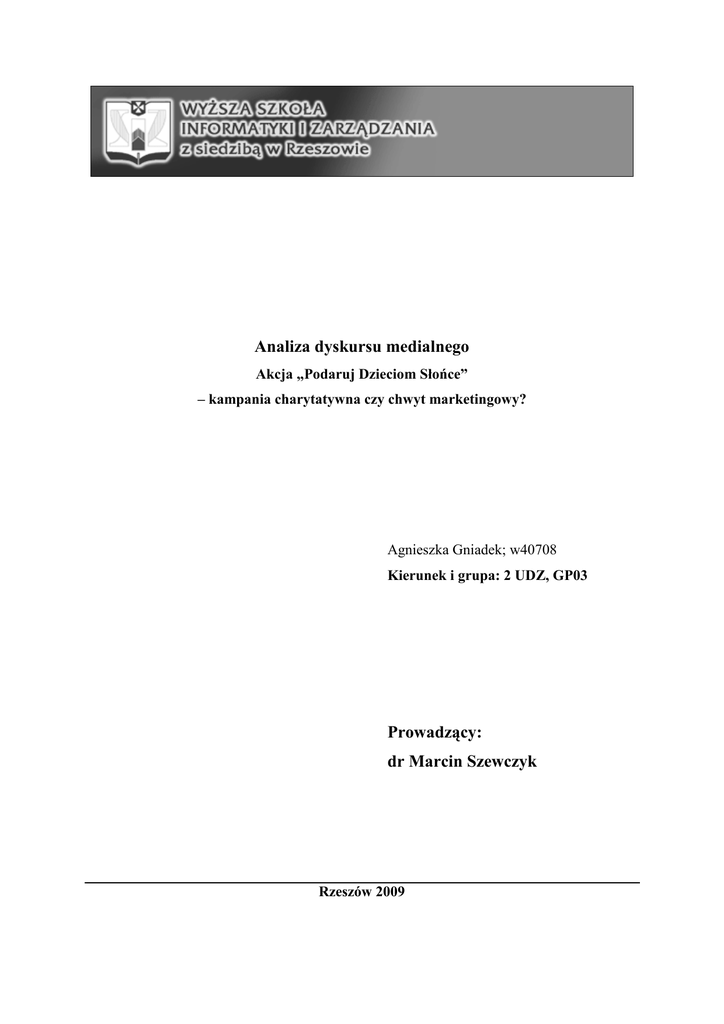 Analiza dyskursu medialnego Akcja „Podaruj Dzieciom Słońce” – kampania charytatywna czy chwyt marketingowy? Agnieszka Gniadek; w40708 Kierunek i grupa: 2 UDZ, GP03 Prowadzący: dr Marcin Szewczyk Rzeszów 2009 Mechanizm kampanii. Od 1999 roku, akcja „Podaruj Dzieciom Słońce” jest największym przedsięwzięciem marketingu społecznego w Polsce. Kampania powstała przy współpracy Fundacji Polsat i międzynarodowej firmy Procter & Gamble. Mechanizm funkcjonowania akcji jest bardzo prosty: konsument podczas codziennych zakupów nabywa produkt firmy Procter & Gamble (oznaczony specjalnym słoneczkiem – logo akcji), a przedsiębiorstwo zobowiązuje się przekazać „część” swoich zysków ze sprzedaŜy na konto Fundacji Polsat. Głównym celem wyŜej wymienionej organizacji jest finansowe wsparcie specjalistycznych placówek zdrowotnych dla dzieci i młodzieŜy oraz indywidualna pomoc dla wszystkich podopiecznych fundacji. Akcja jest skierowana do szerokiego grona konsumentów, którzy kupując produkty Procter & Gamble, wspierają tym samym istotny cel społeczny. Kampanii towarzyszą takŜe działania edukacyjne realizowane przy współpracy ekspertów akademickich i rządowych, skierowane do lekarzy pierwszego kontaktu1. Elementy kampanii społecznej. • spoty reklamowe w telewizji i Internecie, • naklejki z logo kampanii społecznej umieszczone na wybranych produktach firmy P&G, • bezpośrednie akcje promocyjne w duŜych sieciach handlowych, • działalność edukacyjna, • okazjonalne imprezy dla dzieci. Prawda wynikająca z przekazu (wg powszechnej opinii społecznej): • akcja ma charakter społeczny, charytatywny. Moje przypuszczenia : • akcja ma cel typowo marketingowy, pod pozorem kampanii charytatywnej kryją się działania zmierzające do zwiększenia sprzedaŜy produktów firmy, biorącej udział w akcji. Grupa docelowa : • konsumenci w wieku od 20–65 lat; 1 http://www.fob.org.pl/akcja-podaruj-dzieciom-slonce---procter--161_474.htm z dn. 6.06.2009 • osoby o średnim bądź wyŜszym statusie społecznym, • rodzaj odbiorców zaleŜny jest od marki i typu produktu (np. Pampersy – młodzi rodzice, Always – kobiety w wieku 13 do 50 lat). Analiza dyskursu medialnego Do własnej interpretacji faktów, zdecydowałam się wybrać tylko te elementy akcji, które obnaŜają cała prawdę o kampanii. Spoty reklamowe w telewizji i Internecie - jako podświadomy wpływ na psychikę i emocje widza. Reklamy skonstruowane są na dwa sposoby. W pierwszym przypadku jest to zestawienie dziecka zdrowego, cieszącego się Ŝyciem, spełniającego swoje marzenia z dzieckiem niepełnosprawnym, którego cały świat obraca się wokół kalectwa i rehabilitacji. Drastyczne ukazanie róŜnicy w sposobie codziennego funkcjonowania głównych bohaterów ma za zadanie silnie oddziaływać na emocje odbiorców - teksty muszą chwytać za serce: ”…codziennie trenuję po kilka godzin, podobnie jak i Asia, ja robię to Ŝeby osiągnąć sukces i zdobyć kolejne medale, ona Ŝeby zrobić kolejny krok…”2. Manipulacja obrazem i językiem ma wywoływać takie uczucia jak litość, współczucie, chęć wsparcia, co z kolei ma motywować do działania. W identyczny sposób ma wpływać na konsumentów druga wersja reklamy, gdzie małe, osamotnione dziecko zostaje przedstawione na tle pustych ścian hospicjum. Mali bohaterowie reklam zachęcają nas do finansowego wsparcia fundacji poprzez sms, bądź do zakupu produktów firm biorących udział w akcji. Celowym zabiegiem speców od marketingu jest równieŜ uŜycie w reklamie znanych osób ze świata medialnego (np. Agata Młynarska, Piotr Machalica, Ewelina Flinta). Aktorzy, gwiazdy muzyki oraz inni sławni i podziwiani ludzie mogą zwiększyć sympatię odbiorców do akcji niesienia pomocy dzieciom, a tym samym do nabywania promowanych produktów. Działa tutaj mechanizm, który polega na identyfikacji widza z idolem i wyŜszym ocenianiu reklamowanych przez gwiazdy artykułów. Ten rodzaj manipulacji działa równieŜ na próŜność konsumentów, gdyŜ po nabyciu reklamowanego produktu klient czerpie satysfakcję z 2 http://www.youtube.com/watch?v=lgEZRYuhiKc z dn. 5.06.2009 moŜliwości uŜycia tych samych artykułów co idol np. proszku Vizir reklamowanego przez Zygmunta Chajzera. Naklejki z logo kampanii społecznej – jako element wyzwalający pozytywne emocje. Zarówno w spotach reklamowanych jak i na promowanych produktach Fundacja Polsat umieszcza swoje logo w postaci Ŝółtego uśmiechniętego słoneczka na czerwonym tle. Sam symbol słońca jak i gra dwóch kontrastowych kolorów wyzwala w odbiorcach pozytywne uczucia takie jak: ciepło, radość, optymizm, energię. KaŜde logo opatrzone jest hasłem reklamowych „Podaruj Dzieciom Słońce”, co dodatkowo motywuje do działania. Sięgając po wybrany produkt firmy, konsumentowi „wydaję się”, Ŝe znaczna część z wydanej przez niego kwoty zasila konto fundacji. Nieoficjalnie mówi się jednak o „groszowym” wymiarze pomocy. ZbieŜność loga akcji i Telewizji Polsat nie jest równieŜ przypadkowa. Zabieg ten promuje samą stację, gdyŜ „słoneczka kampanii” umieszczone są na wielu produktach, które nieodłącznie towarzyszą klientowi w jego codziennym Ŝyciu. UtoŜsamienie Telewizji Polsat z kampanią „Podaruj Dzieciom Słońce” ma za zadanie budować pozytywny wizerunek stacji w umysłach widzów. Polsat chce być postrzegany, jako medium społeczne, które jest zawsze blisko „przeciętnego” człowieka i troszczy się o jego problemy. Mechanizm ten ma przyczynić się bezpośrednio do wzrostu oglądalności Telewizji Polsat. Akcje promocyjne w hipermarketach – jako bezpośrednia manipulacja konsumentem. Typowo marketingowy charakter działań firmy Procter & Gamble, która bierze udział w akcji Fundacji Polsat, zostanie omówiony na podstawie własnych doświadczeń wynikających ze współpracy z wyŜej wymienioną fi