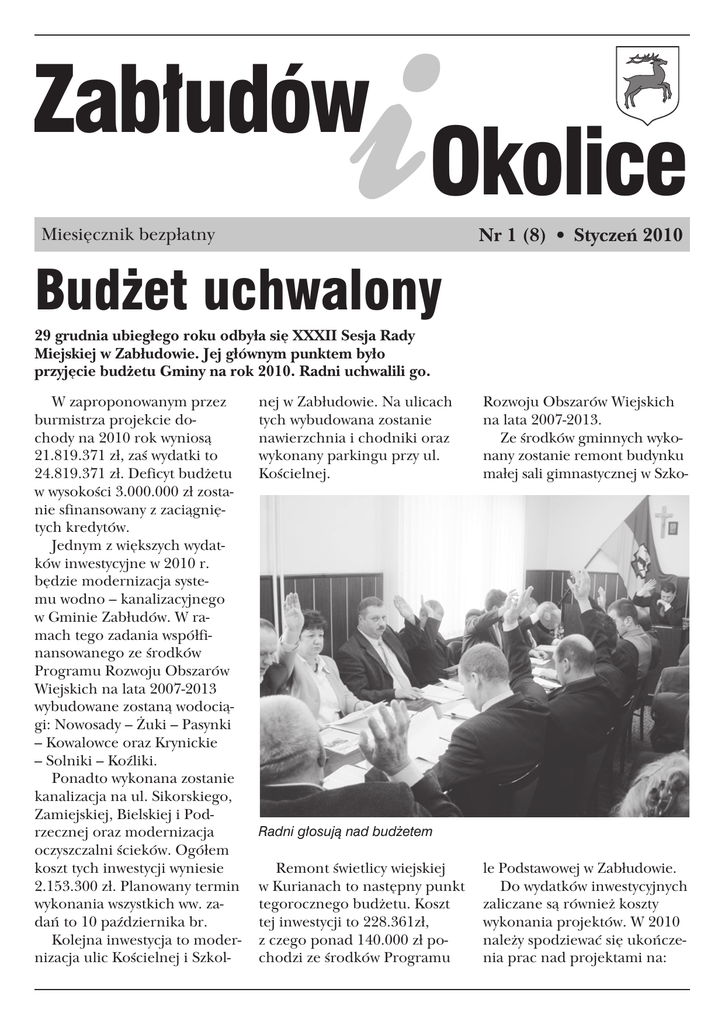 :ABUDÐW /KOLICE Miesięcznik bezpłatny Nr 1 (8) • Styczeń 2010 Budżet uchwalony 29 grudnia ubiegłego roku odbyła się XXXII Sesja Rady Miejskiej w Zabłudowie. Jej głównym punktem było przyjęcie budżetu Gminy na rok 2010. Radni uchwalili go. W zaproponowanym przez burmistrza projekcie dochody na 2010 rok wyniosą 21.819.371 zł, zaś wydatki to 24.819.371 zł. Deficyt budżetu w wysokości 3.000.000 zł zostanie sfinansowany z zaciągniętych kredytów. Jednym z większych wydatków inwestycyjne w 2010 r. będzie modernizacja systemu wodno – kanalizacyjnego w Gminie Zabłudów. W ramach tego zadania współfinansowanego ze środków Programu Rozwoju Obszarów Wiejskich na lata 2007-2013 wybudowane zostaną wodociągi: Nowosady – Żuki – Pasynki – Kowalowce oraz Krynickie – Solniki – Koźliki. Ponadto wykonana zostanie kanalizacja na ul. Sikorskiego, Zamiejskiej, Bielskiej i Podrzecznej oraz modernizacja oczyszczalni ścieków. Ogółem koszt tych inwestycji wyniesie 2.153.300 zł. Planowany termin wykonania wszystkich ww. zadań to 10 października br. Kolejna inwestycja to modernizacja ulic Kościelnej i Szkol- nej w Zabłudowie. Na ulicach tych wybudowana zostanie nawierzchnia i chodniki oraz wykonany parkingu przy ul. Kościelnej. Rozwoju Obszarów Wiejskich na lata 2007-2013. Ze środków gminnych wykonany zostanie remont budynku małej sali gimnastycznej w Szko- Radni głosują nad budżetem Remont świetlicy wiejskiej w Kurianach to następny punkt tegorocznego budżetu. Koszt tej inwestycji to 228.361zł, z czego ponad 140.000 zł pochodzi ze środków Programu le Podstawowej w Zabłudowie. Do wydatków inwestycyjnych zaliczane są również koszty wykonania projektów. W 2010 należy spodziewać się ukończenia prac nad projektami na: 2 | budowę sieci wodociągowej Pawły – Ciełuszki – Kaniuki, budowę sieci wodociągowej wraz z kanalizacją na ulicy Bielskiej oraz budowę ulic Zamiejskiej i Polnej oraz na osiedlu Św. Marii Magdaleny. Przygotowana zostanie również pełna dokumentacja kosztorysowo – projektowa budowy nawierzchni wraz z infrastrukturą techniczną ulic Kalwińskiej i Cerkiewnej w Zabłudowie. Ponadto Gmina Zabłudów sfinansuje w 50 proc. wykonanie projektu przebudowy ul. Chodkiewicza – będącej odcinkiem drogi powiatowej. Zabłudów i Okolice W ramach tego zadania zaplanowano wykonanie chodników wzdłuż ulicy, zatok parkingowych przy cmentarzach oraz kanału deszczowego. W 2010 roku na terenie Gminy Zabłudów powiat białostocki będzie prowadził następujące inwestycje: modernizacja ul. Rynek w Zabłudowie, przebudowa nawierzchni drogi Pawły – Dawidowicze, remont nawierzchni drogi na odcinku Folwarki Małe – Folwarki Wielkie – Folwarki Tylwickie i remont nawierzchni na odcinku drogi Zabłudów – Krynickie. Inwestycje te zostaną w 50 proc. sfinansowane z budżetu naszej Gminy. Budżet na 2010 rok przygotowano w oparciu o przepisy nowej ustawy o finansach publicznych i ustawie o dochodach jednostek samorządu terytorialnego. Uchwała budżetowa jest najważniejszym aktem prawnym stanowiącym podstawę finansowego funkcjonowania gminy. Na stronie Biuletynu Informacji Publicznej Urzędu Miejskiego w Zabłudowie opublikowano uchwałę budżetową Gminy Zabłudów na 2010 rok oraz pozostałe uchwały podjęte na XXXII Sesji Rady Miejskiej w Zabłudowie. Joanna Jakoniuk Nagrodzeni 20 listopada 2009 roku rozstrzygnięty został konkurs pn. „Estetyczna i bezpieczna zagroda wiejska Powiatu Białostockiego”. W ścisłej czołówce znalazły się gospodarstwa z terenu gminy Zabłudów. Już po raz siódmy Starostwo Powiatowe w Białymstoku przy współudziale burmistrzów i wójtów gmin zorganizowało konkurs na najładniejszą zagrodę wiejską. Do tegorocznej edycji zgłosiło się osiem gospodarstw. Pierwsze miejsce zajęła zagroda Izabeli i Grzegorza Łaskich z miejscowości Targonie Wielkie w gminie Zawady. Na drugim miejscu uplasowało się gospodarstwo Wiesławy i Jerzego Kondratiuków z Ciełuszek, a na trzecim Bożeny i Kazimierza Grzegorczyków ze Słomianki. Uroczyste podsumowanie konkursu odbyło się 20 listopada ub. r. w Starostwie Powiatowym w Białymstoku. Tego dnia Wiesław Pusz, Starosta Powiatu Białostockiego, radni powiatu oraz wójtowie i burmistrzowie wręczyli nagrody laureatom. Uroczystość uświetnił występ zespołu ludowego „Reczańka” z Koźlik pod kierownictwem artystycznym Ali Kamieńskiej. - Idea zorganizowanych konkursów spotyka się z dużym zainteresowaniem władz samorządowych jak i rolników. Liczymy, że dzięki nim coraz więcej gospodarstw na terenie pięknej wsi białostockiej położy nacisk na estetykę, porządek, bezpieczeństwo pracy i przestrzeganie zasad ochrony środowiska. Laureaci konkursów są wzorem do naśladowania dla pozostałych gospodarstw – napisano na stronie internetowej Starostwa Powiatowego w Białymstoku. PW Bal sołtysów 31 stycznia br., w niedzielę, w Wiejskim Domu Kultury w Rybołach odbędzie się Bal sołtysów. Początek imprezy zaplanowano na godz. 19.00. Koszt od pary 150 złotych. Bliższych informacji o balu udziela Joanna Jakoniuk z Urzędu Miejskiego w Zabłudowie, pod numerem tel. 85 7188 122 w. 24. | 3 Zabłudów i Okolice Zmieniamy gminę Z Jackiem Lulewiczem, burmistrzem Zabłudowa rozmawia Piotr Woroniecki z jej dociepleniem oraz budową w jej najbliższym otoczeniu małego placu zabaw. Tutaj też zadanie to zostanie wsparte z PROW. Nadal jesteśmy zaawansowani w pracach modernizacyjnych na obiektach Zespołu Szkolno – Przedszkolnego w Zabłudowie. Chcemy wyremontować małą salę gimnastyczną. W 2010 roku będziemy przygotowywać projekty kolejnych wodociągów przez Pawły – Ciełuszki – Kaniuki oraz Żywkowo – Olszanka – Ochremowicze. Ponadto będziemy przygotowywali projekty budowy ulicy Zamiejskiej i Polnej, ulic na osiedlu św. Marii Magdaleny oraz przebudowy ul. Chodkiewicza. Wspólnie z Powiatem Białos