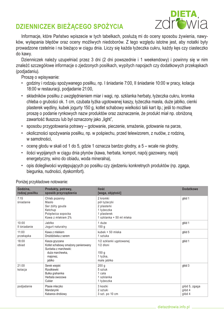 DZIENNICZEK BIEŻĄCEGO SPOŻYCIA Informacje, które Państwo wpiszecie w tych tabelkach, posłużą mi do oceny sposobu żywienia, nawyków, wyłapania błędów oraz oceny możliwych niedoborów. Z tego względu istotne jest, aby notatki były prowadzone rzetelnie i na bieżąco w ciągu dnia. Liczy się każda łyżeczka cukru, każdy kęs czy ciasteczko do kawy. Dzienniczek należy uzupełniać przez 3 dni (2 dni powszednie i 1 weekendowy) i powinny się w nim znaleźć szczegółowe informacje o zjedzonych posiłkach, wypitych napojach czy dodatkowych przekąskach (podjadaniu). Proszę o wpisywanie: • godziny i rodzaju spożywanego posiłku, np. I śniadanie 7:00, II śniadanie 10:00 w pracy, kolacja 18:00 w restauracji, podjadanie 21:00, • składników posiłku z uwzględnieniem miar i wagi, np. szklanka herbaty, łyżeczka cukru, kromka chleba o grubości ok. 1 cm, czubata łyżka ugotowanej kaszy, łyżeczka masła, duże jabłko, cienki plasterek wędliny, kubek jogurty 150 g, kotlet schabowy wielkości talii kart itp.; jeśli to możliwe proszę o podanie rynkowych nazw produktów oraz zaznaczenie, że produkt miał np. obniżoną zawartość tłuszczu lub był oznaczony jako „light”, • sposobu przygotowania potrawy – gotowanie, pieczenie, smażenie, gotowanie na parze, • okoliczności spożywania posiłku, np. w pośpiechu, przed telewizorem, z nudów, z rodziną, w samotności, • ocenę głodu w skali od 1 do 5, gdzie 1 oznacza bardzo głodny, a 5 – wcale nie głodny, • ilości wypijanych w ciągu dnia płynów (kawa, herbata, kompot, napój gazowany, napój energetyczny, wino do obiadu, woda mineralna), • opis dolegliwości występujących po posiłku czy zjedzeniu konkretnych produktów (np. zgaga, biegunka, nudności, dyskomfort). Poniżej przykładowe notowanie: Godzina, rodzaj posiłku Produkty, potrawy, sposób przyrządzenia Ilość [waga, objętość] Dodatkowe 7:15 śniadanie Chleb pszenny Masło Ser żółty gouda Ketchup Polędwica sopocka Kawa z mlekiem 2% 2 kromki pół łyżeczki 2 plasterki 1 łyżeczka 1 plasterek 1 szklanka + 50 ml mleka asa kostna [kg] głód 1 10:00 II śniadanie[%] Jabłko Jogurt naturalny 1 duże 150 g głód 1 11:00 przekąska Kawa z mlekiem Drożdżówka z serem kubek + 50 mleka 1 sztuka głód 5 18:00 obiad Kasza gryczana Kotlet schabowy smażony panierowany Surówka z marchewki: duża marchewka, majonez, jabłko 1/2 szklanki ugotowanej 1/2 dłoni głód 1 21:00 kolacja Serek wiejski Rzodkiewki Bułka grahamka Herbata owocowa Cukier 200 g 5 sztuk 1 cała 1 szklanka 1 łyżeczka głód 3 podjadanie Ptasie mleczko Mandarynki Kabanos drobiowy 3 kostki 2 sztuki 3 szt. po 10 cm głód 5, zgaga głód 4 głód 4 150 g 1 łyżka, małe jabłko dietazdrowia.info.pl dzień 1 Godzina, rodzaj posiłku dzień tygodnia .............................. Produkty, potrawy, sposób przyrządzenia Ilość [waga, objętość] data ............................ Dodatkowe Aktywność fizyczna dietazdrowia.info.pl dzień 2 Godzina, rodzaj posiłku dzień tygodnia .............................. Produkty, potrawy, sposób przyrządzenia Ilość [waga, objętość] data ............................ Dodatkowe Aktywność fizyczna dietazdrowia.info.pl dzień 3 Godzina, rodzaj posiłku dzień tygodnia .............................. Produkty, potrawy, sposób przyrządzenia Ilość [waga, objętość] data ............................ Dodatkowe Aktywność fizyczna dietazdrowia.info.pl