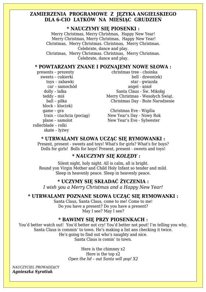 - ZAMIERZENIA PROGRAMOWE Z JĘZYKA ANGIELSKIEGO DLA 6-CIO LATKÓW NA MIESIĄC GRUDZIEŃ * NAUCZYMY SIĘ PIOSENKI : Merry Christmas, Merry Christmas, Happy New Year! Merry Christmas, Merry Christmas, Happy New Year! Christmas, Merry Christmas. Christmas, Merry Christmas. Celebrate, dance and play. Christmas, Merry Christmas. Christmas, Merry Christmas. Celebrate, dance and play. * POWTARZAMY ZNANE I POZNAJEMY NOWE SŁOWA : presents – prezenty sweets – cukierki toys – zabawki car – samochód dolly – lalka teddy – miś ball – piłka block – kloc(ek) game – gra train – ciuchcia (pociąg) plane – samolot rollerblade – rolki skate – łyżwy christmas tree - choinka bell - dzwon(ek) star - gwiazda angel - anioł Santa Claus - Św. Mikołaj Merry Christmas - Wesołych Świąt. Christmas Day - Boże Narodzenie Christmas Eve - Wigilia New Year’s Day - Nowy Rok New Year’s Eve - Sylwester * UTRWALAMY SŁOWA UCZĄC SIĘ RYMOWANKI : Present, present - sweets and toys! What's for girls? What's for boys? Dolls for girls! Bolls for boys! Present, present - sweets and toys! * NAUCZYMY SIĘ KOLĘDY : Silent night, holy night. All is calm, all is bright. Round yon Virgin Mother and Child Holy Infant so tender and mild. Sleep in heavenly peace. Sleep in heavenly peace. * UCZYMY SIĘ SKŁADAĆ ŻYCZENIA : I wish you a Merry Christmas and a Happy New Year! * UTRWALAMY POZNANE SŁOWA UCZĄC SIĘ RYMOWANKI : Santa Claus, Santa Claus, come to me! Come to me! Do you have a present? Do you have a present? May I see? May I see? * BAWIMY SIĘ PRZY PIOSENKACH : You’d better watch out! You’d better not cry! You’d better not pout! I’m telling you why, Santa Claus is commin’ to town. He’s making a list ans checking it twice. He’s going to find out who’s naughty and nice. Santa Claus is comin’ to town. Here is the chimney x2 Here is the top x2 Open the lid – out Santa will pop! X2 NAUCZYCIEL PROWADZĄCY Agnieszka Syrotiuk