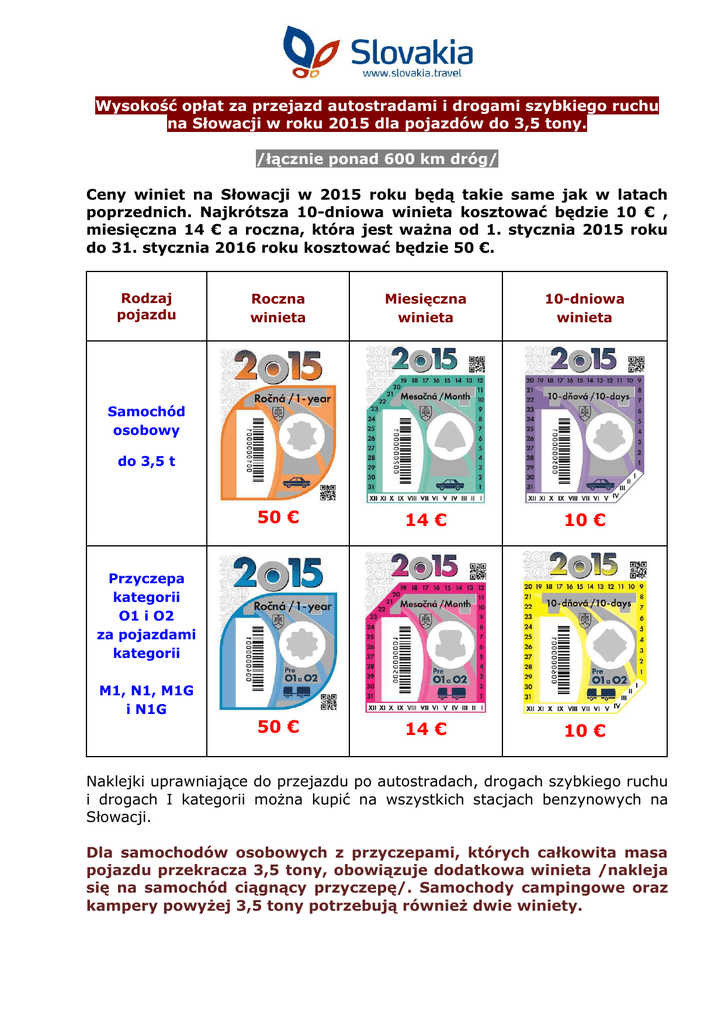 Wysokość opłat za przejazd autostradami i drogami szybkiego ruchu na Słowacji w roku 2015 dla pojazdów do 3,5 tony. /łącznie ponad 600 km dróg/ Ceny winiet na Słowacji w 2015 roku będą takie same jak w latach poprzednich. Najkrótsza 10-dniowa winieta kosztować będzie 10 € , miesięczna 14 € a roczna, która jest ważna od 1. stycznia 2015 roku do 31. stycznia 2016 roku kosztować będzie 50 €. Rodzaj pojazdu Roczna winieta Miesięczna winieta 10-dniowa winieta 50 € 14 € 10 € 50 € 14 € 10 € Samochód osobowy do 3,5 t Przyczepa kategorii O1 i O2 za pojazdami kategorii M1, N1, M1G i N1G Naklejki uprawniające do przejazdu po autostradach, drogach szybkiego ruchu i drogach I kategorii można kupić na wszystkich stacjach benzynowych na Słowacji. Dla samochodów osobowych z przyczepami, których całkowita masa pojazdu przekracza 3,5 tony, obowiązuje dodatkowa winieta /nakleja się na samochód ciągnący przyczepę/. Samochody campingowe oraz kampery powyżej 3,5 tony potrzebują również dwie winiety. Jednocześnie informujemy, że motocykle drogowych po słowackich autostradach. zwolnione są z opłat Od 01.01.2010 r. na Słowacji dla samochodów powyżej 3,5 tony wprowadzony został elektroniczny system poboru opłat. Dotyczy to jazdy po autostradach, drogach szybkiego ruchu oraz niektórych drogach pierwszej kategorii /ponad 2000 km dróg/. Więcej informacji oraz aktualne mapy płatnych odcinków dróg na Słowacji znajdą Państwo na stronach internetowych www.dialnicnenalepky.sk, www.ndsas.sk oraz www.emyto.sk. Aktualna mapa słowackich autostrad i dróg szybkiego ruchu znajduje się tutaj: http://www.ndsas.sk/ext_dok-mapa_siete/44547c Pragniemy Państwa poinformować, że od 1. lipca 2015 roku na Słowacji planowane jest wprowadzenie winiet elektronicznych, które będzie można zakupić na stacjach paliw lub przez internet czy telefon komórkowy.