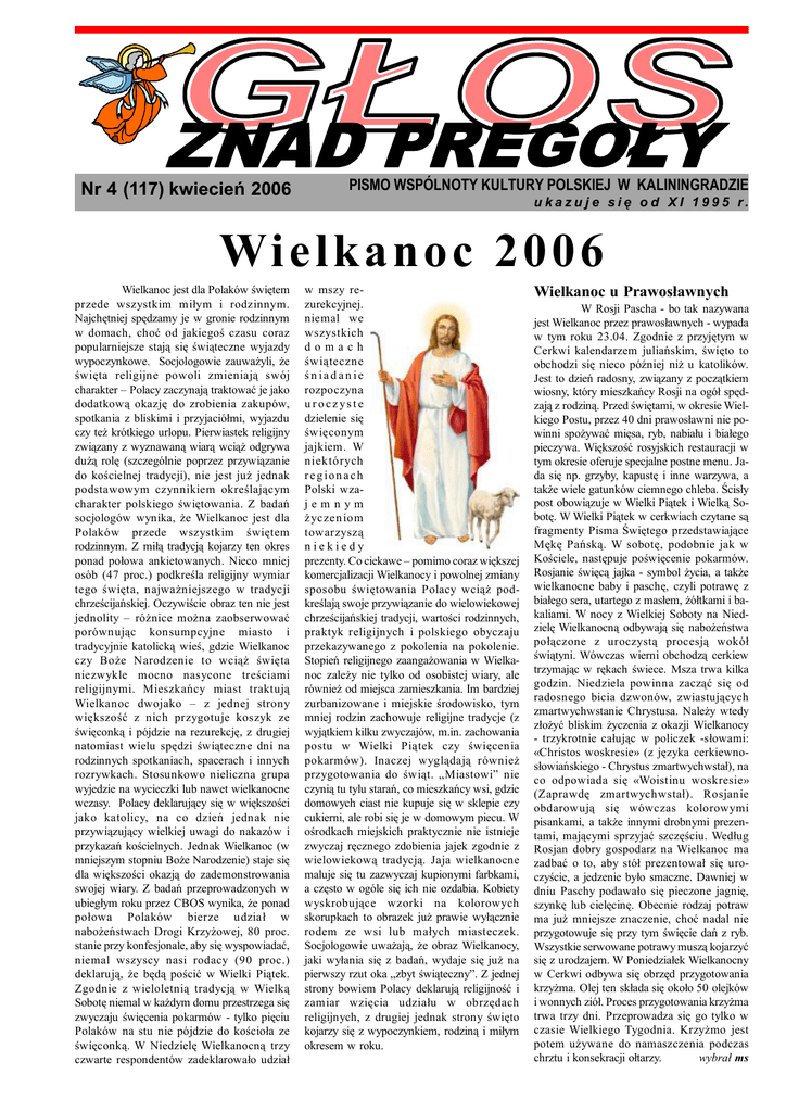 Nr 4 (117) kwiecień 2006 PISMO WSPÓLNOTY KULTURY POLSKIEJ W KALININGRADZIE u kazu j e się o d X I 1995 r. Wi e l ka no c 2 0 0 6 Wielkanoc jest dla Polaków świętem przede wszystkim miłym i rodzinnym. Najchętniej spędzamy je w gronie rodzinnym w domach, choć od jakiegoś czasu coraz popularniejsze stają się świąteczne wyjazdy wypoczynkowe. Socjologowie zauważyli, że święta religijne powoli zmieniają swój charakter – Polacy zaczynają traktować je jako dodatkową okazję do zrobienia zakupów, spotkania z bliskimi i przyjaciółmi, wyjazdu czy też krótkiego urlopu. Pierwiastek religijny związany z wyznawaną wiarą wciąż odgrywa dużą rolę (szczególnie poprzez przywiązanie do kościelnej tradycji), nie jest już jednak podstawowym czynnikiem określającym charakter polskiego świętowania. Z badań socjologów wynika, że Wielkanoc jest dla Polaków przede wszystkim świętem rodzinnym. Z miłą tradycją kojarzy ten okres ponad połowa ankietowanych. Nieco mniej osób (47 proc.) podkreśla religijny wymiar tego święta, najważniejszego w tradycji chrześcijańskiej. Oczywiście obraz ten nie jest jednolity – różnice można zaobserwować porównując konsumpcyjne miasto i tradycyjnie katolicką wieś, gdzie Wielkanoc czy Boże Narodzenie to wciąż święta niezwykle mocno nasycone treściami religijnymi. Mieszkańcy miast traktują Wielkanoc dwojako – z jednej strony większość z nich przygotuje koszyk ze święconką i pójdzie na rezurekcję, z drugiej natomiast wielu spędzi świąteczne dni na rodzinnych spotkaniach, spacerach i innych rozrywkach. Stosunkowo nieliczna grupa wyjedzie na wycieczki lub nawet wielkanocne wczasy. Polacy deklarujący się w większości jako katolicy, na co dzień jednak nie przywiązujący wielkiej uwagi do nakazów i przykazań kościelnych. Jednak Wielkanoc (w mniejszym stopniu Boże Narodzenie) staje się dla większości okazją do zademonstrowania swojej wiary. Z badań przeprowadzonych w ubiegłym roku przez CBOS wynika, że ponad połowa Polaków bierze udział w nabożeństwach Drogi Krzyżowej, 80 proc. stanie przy konfesjonale, aby się wyspowiadać, niemal wszyscy nasi rodacy (90 proc.) deklarują, że będą pościć w Wielki Piątek. Zgodnie z wieloletnią tradycją w Wielką Sobotę niemal w każdym domu przestrzega się zwyczaju święcenia pokarmów - tylko pięciu Polaków na stu nie pójdzie do kościoła ze święconką. W Niedzielę Wielkanocną trzy czwarte respondentów zadeklarowało udział w mszy rezurekcyjnej. niemal we wszystkich domach świąteczne śn iad an ie rozpoczyna u roczyste dzielenie się święconym jajkiem. W niektórych reg ion a ch Polski wzajemnym życzen iom towarzyszą niekiedy prezenty. Co ciekawe – pomimo coraz większej komercjalizacji Wielkanocy i powolnej zmiany sposobu świętowania Polacy wciąż podkreślają swoje przywiązanie do wielowiekowej chrześcijańskiej tradycji, wartości rodzinnych, praktyk religijnych i polskiego obyczaju przekazywanego z pokolenia na pokolenie. Stopień religijnego zaangażowania w Wielkanoc zależy nie tylko od osobistej wiary, ale również od miejsca zamieszkania. Im bardziej zurbanizowane i miejskie środowisko, tym mniej rodzin zachowuje religijne tradycje (z wyjątkiem kilku zwyczajów, m.in. zachowania postu w Wielki Piątek czy święcenia pokarmów). Inaczej wyglądają również przygotowania do świąt. „Miastowi” nie czynią tu tylu starań, co mieszkańcy wsi, gdzie domowych ciast nie kupuje się w sklepie czy cukierni, ale robi się je w domowym piecu. W ośrodkach miejskich praktycznie nie istnieje zwyczaj ręcznego zdobienia jajek zgodnie z wielowiekową tradycją. Jaja wielkanocne maluje się tu zazwyczaj kupionymi farbkami, a często w ogóle się ich nie ozdabia. Kobiety wyskrobujące wzorki na kolorowych skorupkach to obrazek już prawie wyłącznie rodem ze wsi lub małych miasteczek. Socjologowie uważają, że obraz Wielkanocy, jaki wyłania się z badań, wydaje się już na pierwszy rzut oka „zbyt świąteczny”. Z jednej strony bowiem Polacy deklarują religijność i zamiar wzięcia udziału w obrzędach religijnych, z drugiej jednak strony święto kojarzy się z wypoczynkiem, rodziną i miłym okresem w roku. Wielkanoc u Prawosławnych W Rosji Pascha - bo tak nazywana jest Wielkanoc przez prawosławnych - wypada w tym roku 23.04. Zgodnie z przyjętym w Cerkwi kalendarzem juliańskim, święto to obchodzi się nieco później niż u katolików. Jest to dzień radosny, związany z początkiem wiosny, który mieszkańcy Rosji na ogół spędzają z rodziną. Przed świętami, w okresie Wielkiego Postu, przez 40 dni prawosławni nie powinni spożywać mięsa, ryb, nabiału i białego pieczywa. Większość rosyjskich restauracji w tym okresie oferuje specjalne postne menu. Jada się np. grzyby, kapustę i inne warzywa, a także wiele gatunków ciemnego chleba. Ścisły post obowiązuje w Wielki Piątek i Wielką Sobotę. W Wielki Piątek w cerkwiach czytane są fragmenty Pisma Świętego przedstawiające Mękę Pańską. W sobotę, podobnie jak w Kościele, następuje poświęcenie pokarmów. Rosjanie święcą jajka - symbol życia, a także wielkanocne baby i paschę, czyli potrawę z białego sera, utartego z masłem, żółtkami i bakaliami. W nocy z Wielkiej Soboty na Niedzielę Wielkanocną odbywają się nabożeństwa połączone z uroczystą procesją wokół świątyni. Wówczas wierni obchodzą cerkiew trzymając w rękach świece. Msza trwa kilka godzin. Niedziela powinna zacząć się od radosnego bicia dzwonów, zwiastujących zmartwychwstanie Chrystusa. Należy wtedy złożyć bliskim życzenia z okazji Wielkanocy - trzykrotnie całując w policzek -słowami: «Christos woskresie» (z języka cerkiewnosłowiańskiego - Chrystus zmartwychwstał), na co odpowiada się «Woistinu woskresie» (Zaprawdę zmartwychwstał). Rosjanie obdarowują się wówczas kolorowymi pisankami, a także i