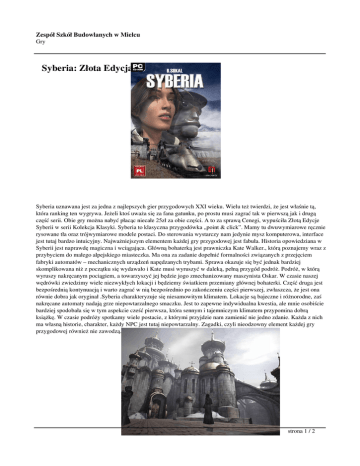Zespół Szkół Budowlanych w Mielcu Gry Syberia: Złota Edycja Syberia uznawana jest za jedna z najlepszych gier przygodowych XXI wieku. Wielu też twierdzi, że jest właśnie tą, która ranking ten wygrywa. Jeżeli ktoś uważa się za fana gatunku, po prostu musi zagrać tak w pierwszą jak i drugą część serii. Obie gry można nabyć płacąc niecałe 25zł za obie części. A to za sprawą Cenegi, wypuściła Złotą Edycje Syberii w serii Kolekcja Klasyki. Syberia to klasyczna przygodówka „point & click”. Mamy tu dwuwymiarowe ręcznie rysowane tła oraz trójwymiarowe modele postaci. Do sterowania wystarczy nam jedynie mysz komputerowa, interface jest tutaj bardzo intuicyjny. Najważniejszym elementem każdej gry przygodowej jest fabuła. Historia opowiedziana w Syberii jest naprawdę magiczna i wciągająca. Główną bohaterką jest prawniczka Kate Walker., którą poznajemy wraz z przybyciem do małego alpejskiego miasteczka. Ma ona za zadanie dopełnić formalności związanych z przejęciem fabryki automatów – mechanicznych urządzeń napędzanych trybami. Sprawa okazuje się być jednak bardziej skomplikowana niż z początku się wydawało i Kate musi wyruszyć w daleką, pełną przygód podróż. Podróż, w którą wyruszy nakręcanym pociągiem, a towarzyszyć jej będzie jogo zmechanizowany maszynista Oskar. W czasie naszej wędrówki zwiedzimy wiele niezwykłych lokacji i będziemy światkiem przemiany głównej bohaterki. Część druga jest bezpośrednią kontynuacją i warto zagrać w nią bezpośrednio po zakończeniu części pierwszej, zwłaszcza, że jest ona równie dobra jak oryginał .Syberia charakteryzuje się niesamowitym klimatem. Lokacje są bajeczne i różnorodne, zaś nakręcane automaty nadają grze niepowtarzalnego smaczku. Jest to zapewne indywidualna kwestia, ale mnie osobiście bardziej spodobała się w tym aspekcie cześć pierwsza, która sennym i tajemniczym klimatem przypomina dobrą książkę. W czasie podróży spotkamy wiele postacie, z którymi przyjdzie nam zamienić nie jedno zdanie. Każda z nich ma własną historie, charakter, każdy NPC jest tutaj niepowtarzalny. Zagadki, czyli nieodzowny element każdej gry przygodowej również nie zawodzą. strona 1 / 2 Zespół Szkół Budowlanych w Mielcu Gry Jest ich sporo a poziom trudności odpowiednio wyważony. Pierwsza cześć Syberii miała swoja premierę w 2002 roku, druga ukazała się 2 lata później, mimo to wciąż wygląda urodziwie. Gry tego typu mają to do siebie, że prawie w ogóle się nie starzeją. Ręcznie rysowane tła prezentują się cudownie. Trójwymiarowe modele w części pierwszej nieco rażą pikselami, jednak w ogóle nie przeszkadza to w czerpaniu radości z grania. Muzyka i dźwięk wciąż brzmią świetnie. Na uwagę zasługuje również znakomite spolszczenie .Syberia Złota Edycja to pozycja obowiązkowa dla każdego fana przygodówek. Świetna w każdym aspekcie. Wykonana bezbłędnie i właściwie pozbawiona wad. Świetna fabuła i magiczny klimat nie pozwalają odejść od monitora. Polecam ją również osobą, które nie miały styczności z tym gatunkiem. Może się zdarzyć, że dzięki Syberii pokochacie klasyczne gry przygodowe. Paweł Kozdęba strona 2 / 2