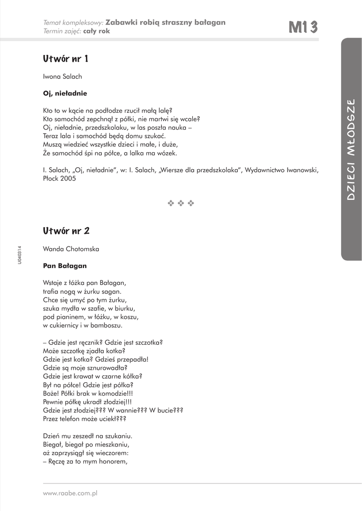 Temat kompleksowy: Zabawki robią straszny bałagan Termin zajęć: cały rok M13 Ut wór nr 1 Iwona Salach Kto to w kącie na podłodze rzucił małą lalę? Kto samochód zepchnął z półki, nie martwi się wcale? Oj, nieładnie, przedszkolaku, w las poszła nauka – Teraz lala i samochód będą domu szukać. Muszą wiedzieć wszystkie dzieci i małe, i duże, Że samochód śpi na półce, a lalka ma wózek. I. Salach, „Oj, nieładnie”, w: I. Salach, „Wiersze dla przedszkolaka”, Wydawnictwo Iwanowski, Płock 2005 ❖❖❖ U040314 Ut wór nr 2 Wanda Chotomska Pan Bałagan Wstaje z łóżka pan Bałagan, trafia nogą w żurku sagan. Chce się umyć po tym żurku, szuka mydła w szafie, w biurku, pod pianinem, w łóżku, w koszu, w cukiernicy i w bamboszu. – Gdzie jest ręcznik? Gdzie jest szczotka? Może szczotkę zjadła kotka? Gdzie jest kotka? Gdzieś przepadła! Gdzie są moje sznurowadła? Gdzie jest krawat w czarne kółka? Był na półce! Gdzie jest półka? Boże! Półki brak w komodzie!!! Pewnie półkę ukradł złodziej!!! Gdzie jest złodziej??? W wannie??? W bucie??? Przez telefon może uciekł??? Dzień mu zeszedł na szukaniu. Biegał, biegał po mieszkaniu, aż zaprzysiągł się wieczorem: – Ręczę za to mym honorem, www.raabe.com.pl DZIECI MŁODSZE Oj, nieładnie M13 Temat kompleksowy: Zabawki robią straszny bałagan Termin zajęć: cały rok znajdę wszystko jutro rano, choćbym miał na głowie stanąć!!! DZIECI MŁODSZE Choć od rana stoi na głowie i wygląda jak to zdanie, nic nie znalazł, bo nie można nic odnaleźć w BAŁAGANIE! W. Chotomska, „Pan Bałagan”, w: W. Chotomska, „Remanent”, Wydawnictwo Nasza Księgarnia, Warszawa 1985 ❖❖❖ Ut wór nr 3 Barbara Lewandowska O czym mówią zabawki wieczorem? B. Lewandowska, „O czym mówią zabawki wieczorem?”, w: B. Lewandowska, „5 deka bajek”, Wydawnictwo MAC Edukacja, Kielce 2002 www.raabe.com.pl U040314 Przed snem trzeba wrócić na swoje miejsce! Mówi lalka Przytulanka. I wraca do kołyski. – Dobrze! – stare, drewniane klocki aż podskakują z radości. – To my wrócimy do lasu! Tam na polanie rosła brzoza. Wiatr ją złamał. Stolarz zmienił ją nie do poznania. A my, klocki, jeszcze pamiętamy las! – Ruszam z wami! – dzwoni plastikowy telefon. – Po co? – rechocze gumowa żaba. – Telefon w lesie niepotrzebny! – Mógłbym urosnąć na deszczu! I udawać jakieś zwierzę – upiera się telefon. – Na przykład – żyrafę! A gdybym dobrze wyciągnął słuchawki na sznurze, mógłbym nawet zadzwonić do chmury i zamówić deszcz! Latarka mruga zielonym światłem, że wyglądałaby w lesie jak grzyb. Pluszowy lisek marzy, że wyrośnie w lesie na prawdziwego lisa. Tylko świnka-skarbonka jest zła. Może dlatego, że od tygodnia ma pusty brzuch? Kwiczy: – Też chcę urosnąć! Chcę być w lesie dziką świnią! Podepczę trawę i mech! Zniszczę polanę jak wielki, prawdziwy dzik! Ale zabawki nie rosną. Powoli zasypiają. Każda na swoim miejscu. A właściwie – obok swojego miejsca, bo wszystkie trochę się odsunęły od świnki – skarbonki. Może już wiedzą, że od złych marzeń lepiej się trzymać z daleka? Temat kompleksowy: Zabawki robią straszny bałagan Termin zajęć: cały rok M13 Ut wór nr 4 Iwona Salach DZIECI MŁODSZE Porządki O zabawki zawsze dbamy Po zabawie – posprzątamy. Już samochód na wirażu: Pędzi prędko do garażu. Lalki suną raźno w rzędzie: Bałaganu dziś nie będzie. Każdy przedszkolaczek wie Po zabawie – sprząta się. Klocki ułożymy w kątku Krzyś pilnuje dziś porządku. Lalki siedzą na tapczanie A w garażu auto stanie. U040314 I. Salach, „Porządki”, w: I. Salach, „Wiersze dla przedszkolaka”, Wydawnictwo Iwanowski, Płock 1995 ❖❖❖ Ut wór nr 5 List od Krasnala Sprzątusia Drogie Dzieci Odwiedziłem dzisiaj przedszkole. Wieczorem, kiedy leżeliście w swoich łóżeczkach, zabawki w przedszkolu nie spały, tylko rozrabiały. Zeszły ze swoich półeczek, wyszły na środek i bawiły się. Rano – zamiast wrócić na swoje miejsca na półkach – zasnęły na dywanie, przez co zrobiły straszny bałagan, a przecież zaraz miały przyjść dzieci do przedszkola! Zaczarowałem zabawki tak, aby zniknęły. Zabawki prosiły mnie, by mogły wrócić do przedszkola. Obiecały, że nie będą już bałaganiły. Jednak tylko dzieci mogą zdjąć czar z zabawek, wykonując w tym celu pewne zadanie. Jeżeli wybaczyliście zabawkom ich nierozważne zachowanie i chcecie, aby do was wróciły, to: • pokażecie, jak można bawić się bez zabawek – rozejrzyjcie się po sali i ustalcie, co może posłużyć Wam do zabawy, • przed pójściem do domu dokładnie posprzątajcie salę, tak by zabawki mogły wrócić na swoje półki. Miłej zabawy! Wasz przyjaciel, Krasnal Sprzątuś www.raabe.com.pl