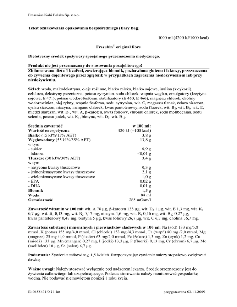 Fresenius Kabi Polska Sp. z o.o. Tekst oznakowania opakowania bezpośredniego (Easy Bag) 1000 ml (4200 kJ/1000 kcal) Fresubin® original fibre Dietetyczny środek spożywczy specjalnego przeznaczenia medycznego. Produkt nie jest przeznaczony do stosowania pozajelitowego! Zbilansowana dieta 1 kcal/ml, zawierająca błonnik, pozbawiona glutenu i laktozy, przeznaczona do żywienia dojelitowego przez zgłębnik w przypadkach zagrożenia niedożywieniem lub przy niedożywieniu. Skład: woda, maltodekstryna, oleje roślinne, białko mleka, białko sojowe, inulina (z cykorii), celuloza, dekstryny pszeniczne, potasu cytrynian, sodu chlorek, wapnia węglan, emulgatory (lecytyna sojowa, E 471), potasu wodorofosforan, stabilizatory (E 460, E 466), magnezu chlorek, choliny wodorowinian, olej rybny, wapnia fosforan, sodu cytrynian, wit. C, magnezu tlenek, żelaza siarczan, cynku siarczan, niacyna, manganu chlorek, kwas pantotenowy, sodu fluorek, wit. B2, wit. B6, wit. E, miedzi siarczan, wit. B1, wit. A, β-karoten, kwas foliowy, chromu chlorek, sodu molibdenian, sodu selenin, potasu jodek, wit. K1, biotyna, wit. D3, wit. B12. Średnia zawartość Wartość energetyczna Białko (15 kJ%/15% AET) Węglowodany (55 kJ%/55% AET) w tym - cukier - laktoza Tłuszcze (30 kJ%/30% AET) w tym - nasycone kwasy tłuszczowe - jednonienasycone kwasy tłuszczowe - wielonienasycone kwasy tłuszczowe - EPA - DHA Błonnik Woda Osmolarność w 100 ml: 420 kJ (=100 kcal) 3,8 g 13,8 g 0,9 g ≤0,01 g 3,4 g 0,3 g 2,1 g 1,0 g 0,02 g 0,01 g 1,5 g 84 ml 285 mOsm/l Zawartość witamin w 100 ml: wit. A 70 µg, β-karoten 133 µg, wit. D3 1 µg, wit. E 1,3 mg, wit. K1 6,7 µg, wit. B1 0,13 mg, wit. B2 0,17 mg, niacyna 1,6 mg, wit. B6 0,16 mg, wit. B12 0,27 µg, kwas pantotenowy 0,47 mg, biotyna 5 µg, kwas foliowy 26,7 µg, wit. C 6,7 mg, cholina 36,7 mg. Zawartość substancji mineralnych i pierwiastków śladowych w 100 ml: Na (sód) 133 mg/5,8 mmol, K (potas) 155 mg/4,0 mmol, Cl (chlorki) 153 mg /4,3 mmol, Ca (wapń) 80 mg /2,0 mmol, Mg (magnez) 25 mg /1,0 mmol, P (fosfor) 63 mg/2,0 mmol, Fe (żelazo) 1,3 mg, Zn (cynk) 1,2 mg, Cu (miedź) 133 µg, Mn (mangan) 0,27 mg, I (jodki) 13,3 µg, F (fluorki) 0,13 mg, Cr (chrom) 6,7 µg, Mo (molibden) 10 µg, Se (selen) 6,7 µg. Podawanie: Żywienie całkowite ≥ 1,5 l/dzień. Rozpoczynając żywienie należy stopniowo zwiększać dawkę. Ważne uwagi: Należy stosować wyłącznie pod nadzorem lekarza. Środek przeznaczony jest do żywienia całkowitego lub uzupełniającego. Podczas stosowania należy monitorować gospodarkę wodną. Nie podawać niemowlętom poniżej 1 roku życia. Et.0455431/0 i 1 Int przygotowana 03.11.2009 Fresenius Kabi Polska Sp. z o.o. Przechowywać w temperaturze pokojowej. Po otwarciu opakowanie należy zużyć w ciągu 24 godzin. Przed użyciem dobrze wstrząsnąć! Nie stosować, jeśli opakowanie jest uszkodzone, napęczniałe lub zawartość zgęstniała! Najlepiej spożyć przed końcem/Numer partii: data i numer partii na opakowaniu. [logo Fresenius Kabi] Producent: Fresenius Kabi Deutschland GmbH D-61346 Bad Homburg, Niemcy Dystrybutor: Fresenius Kabi Polska Sp. z o.o. ul. Hrubieszowska 2 01-209 Warszawa 0455431/0 0455431/1 Et.0455431/0 i 1 Int przygotowana 03.11.2009