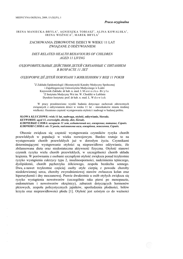 MEDYCYNA OGÓLNA, 2009, 15 (XLIV), 1 Praca oryginalna IRENA M ANIE CKA-B RYŁ A1, AGNIESZ KA TOB I ASZ1, ALINA KOWALSKA1 , IRENA WOŹNICA2, MAREK BRYŁA1 ZACHOWANIA ZDROWOTNE DZIECI W WIEKU 11 LAT ZWIĄZANE Z ODśYWIANIEM DIET-RELATED HEALTH BEHAVIOURS OF CHILDREN AGED 11 LIVING ОЗДОРОВИТЕЛЬНЫЕ ДЕЙСТВИЯ ДЕТЕЙ СВЯЗАННЫЕ С ПИТАНИЕМ В ВОЗРАСТЕ 11 ЛЕТ ОЗДОРОВЧІ ДІЇ ДІТЕЙ ПОВ'ЯЗАНІ З ЖИВЛЕННЯМ У ВІЦІ 11 РОКІВ 1 Z Zakładu Epidemiologii i Biostatystyki Katedry Medycyny Społecznej i Zapobiegawczej Uniwersytetu Medycznego w Łodzi Kierownik Zakładu: dr hab. n. med. I. M a n i e c k a - B r y ł a 2 Z Instytutu Medycyny Wsi im. W. Chodźki w Lublinie Dyrektor Instytutu: prof. dr hab. n. med. L. W d o w i a k W pracy przedstawiono wyniki badania dotyczące zachowań zdrowotnych związanych z odŜywianiem dzieci w wieku 11 lat – mieszkańców miasta średniej wielkości. Oceniono częstość występowania otyłości i nadwagi w badanej próbie. SŁOWA KLUCZOWE: wiek 11 lat, nadwaga, otyłość, odŜywianie, Sieradz. KEYWORDS: aged 11, overweight, obesity, diet, Sieradz. КЛЮЧЕВЫЕ СЛОВА: возвраст 11 лет, избыточный вес, ожирение, питание, Серадз. КЛЮЧОВІ СЛОВА: вік 11 років, надлишкова вага, ожиріння, живлення, Серадз. - - - - - Obecnie zwiększa się częstość występowania czynników ryzyka chorób przewlekłych w populacji w wieku rozwojowym. Bardzo rzutuje to na występowanie chorób przewlekłych juŜ w dorosłym Ŝyciu. Czynnikami determinującymi występowanie otyłości są nieprawidłowe odŜywianie, źle zbilansowana dieta oraz niedostateczna aktywność fizyczna. Otyłość stanowi czynnik ryzyka wielu chorób przewlekłych, w szczególności chorób układu krąŜenia. W porównaniu z osobami szczupłymi otyłość zwiększa ponad trzykrotnie ryzyko wystąpienia cukrzycy typu 2, insulinooporności, nadciśnienia tętniczego, dyslipidemii, chorób pęcherzyka Ŝółciowego, zespołu bezdechu sennego. Dwu, a nawet trzykrotnie częściej osoby otyłe cierpią z powodu choroby niedokrwiennej serca, choroby zwyrodnieniowej stawów zwłaszcza kolan oraz hiperurykemii i dny moczanowej. Prawie dwukrotnie u osób otyłych zwiększa się ryzyko wystąpienia nowotworów (szczególnie raka piersi po menopauzie, endometrium i nowotworów okręŜnicy), zaburzeń dotyczących hormonów płciowych, zespołu policystycznych jajników, upośledzenia płodności, bólów krzyŜa oraz nieprawidłowości płodu [1]. Otyłość jest szóstym co do waŜności 106 I. Maniecka-Bryła, A. Tobiasz, A. Kowalska, I. Woźnica, M. Bryła czynnikiem ryzyka odpowiedzialnym za ogólną liczbę zgonów na świecie. W 1997 roku WHO oficjalnie uznało otyłość za stan przewlekły, wymagający leczenia, sprzyjający rozwojowi innych chorób, związany ze zwiększoną śmiertelnością [2]. CELE BADANIA Celem badania była ocena jakości odŜywiania i określenie częstości występowania nadwagi i otyłości w badanej próbie. Oceniono stan odŜywienia według płci oraz określono częstość występowania otyłości brzusznej w grupie dziewcząt i chłopców. Oceniono takŜe przestrzeganie zaleceń dietetycznych i poddano analizie miejsce spoŜywania posiłków w grupie badanych dzieci. Określono częstość spoŜywania poszczególnych grup Ŝywności: ryb, mięsa i wędlin, owoców, warzyw, roślin strączkowych, mleka, jogurtów, kefirów i białego sera, jaj, słodkich napojów gazowanych, chipsów i chrupek, posiłków typu fast-food oraz słodyczy. MATERIAŁ I METODY - - - - - Badanie przeprowadzono w czerwcu 2007 roku wśród uczniów losowo wybranej szkoły podstawowej z Sieradza. Badaniem objęto wszystkich uczniów klas piątych, w liczbie 160 uczniów (81 chłopców i 79 dziewczynek). W badanej próbie znalazło się co trzecie dziecko w wieku 11 lat mieszkające w Sieradzu, który liczył w tym czasie 43 983 mieszkańców. Jako narzędzie badania wykorzystano anonimowy kwestionariusz ankiety, który wypełniali uczniowie po uzyskaniu zgody swoich rodziców. Ankieta zawierała 15 pytań dotyczących sposobu odŜywiania i aktywności fizycznej. Wszystkie pytania były pytaniami zamkniętymi. Wykonano takŜe pomiary masy ciała, wzrostu, obwodu talii i obwodu bioder. Wyliczono wskaźniki BMI (Body Mass Index) i WHR (Waist-Hip Ratio). Pomiarów dokonano w gabinecie pielęgniarki szkolnej, który znajdował się na terenie szkoły. Warto podkreślić, Ŝe przestrzegano zaleceń Zakładu Medycyny Szkolnej Instytutu Matki i Dziecka co do odpowiedniej temperatury w pomieszczeniach i właściwych metod pomiarów cięŜaru ciała, wzrostu, obwodu talii i obwodu bioder [3]. Pomiary, wyraŜone w kilogramach i centymetrach, porównywano z odpowiednimi dla płci i wieku siatkami centylowymi. W badaniu wykorzystano siatki centylowe dla populacji łódzkiej w wieku 7-19 lat, które opracowano w Uniwersytecie Medycznym w Łodzi [4]. Do oceny częstości korzystano ze wskaźników struktury: procentów, frakcji. Obliczono takŜe podstawowe wartości przeciętne: średnią arytmetyczną, modalną i medianę dla wzrostu, masy ciała, wskaźnika BMI, WHR, obwodu talii; miary rozproszenia: odchylenie standardowe, a takŜe wartość minimalną i maksymalną analizowanych cech. Do określenia stopnia odŜywienia wykorzystano wskaźnik BMI będący ilorazem masy ciała w kilogramach i wzrostu w metrach do kwadratu. Do wykazania zaleŜności między badanymi zmiennymi wykorzystano test niezaleŜności Chi2 dla tablicy wielopolowej i test Chi2 z poprawką Yates`a oraz obliczono współczynnik C-Pearsona dla określenia siły zaleŜności. Za istotne Zachowania zdrowotne dzieci w wieku 11 lat związane z odŜywianiem w Sieradzu 107 statystycznie uznano zaleŜności na poziomie istotności p<0,05 [5, 6]. WYNIKI BADANIA 