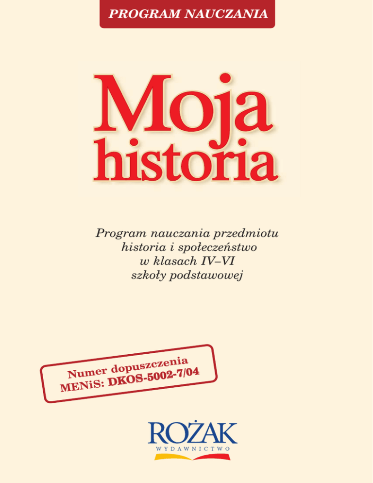 PROGRAM NAUCZANIA Program nauczania przedmiotu historia i spo∏eczeƒstwo w klasach IV–VI szko∏y podstawowej nia puszcze /04 o d r e 2-7 Num OS-500 K D : S i MEN Tomasz Maçkowski „MOJA HISTORIA” PROGRAM NAUCZANIA HISTORII W KLASACH IV–VI SZKO¸Y PODSTAWOWEJ Program dopuszczony do u˝ytku szkolnego przez ministra w∏aÊciwego do spraw oÊwiaty i wychowania i wpisany do wykazu programów szkolnych przeznaczonych do kszta∏cenia w klasach IV–VI szko∏y podstawowej na podstawie recenzji rzeczoznawców: prof. dr. hab. Stanis∏awa Litaka z rekomendacji Katolickiego Uniwersytetu Lubelskiego i mgr. Marka Sadowskiego z rekomendacji Ministra Edukacji Narodowej i Sportu. Numer dopuszczenia: DKOS -5002-7/04 © Copyright by Wydawnictwo Marek Ro˝ak, Gdaƒsk 2004 © Copyright by Marek Ro˝ak, Gdaƒsk 2004 Wydanie I – 2004 Program zosta∏ opracowany przez doÊwiadczonego nauczyciela historii i spo∏eczeƒstwa dr. Tomasza Maçkowskiego. Autor jest pracownikiem Zak∏adu Metodologii Historii i Historiografii Uniwersytetu Gdaƒskiego. www.rozak.com.pl e-mail: [email protected] tel./fax (058) 768 33 66 ul. Spacerowa 50 83-010 Straszyn k. Gdaƒska SPIS TREÂCI Wst´p ............................................................................................ I. Ogólna charakterystyka programu 4 ............................................ 4 II. Cele edukacyjne ...................................................................... 7 Cele kszta∏cenia ...................................................................... 7 .................................................................... 8 Cele wychowania III. Procedury osiàgania celów edukacyjnych Metody kszta∏cenia .................................... 8 .................................................................. 8 Kontrola osiàgni´ç uczniów ...................................................... Kryteria oceniania osiàgni´ç uczniów IV. TreÊci nauczania ........................................ ...................................................................... 12 12 13 TreÊci nauczania ze szczegó∏owymi celami kszta∏cenia i przewidywanymi osiàgni´ciami uczniów . . . . . . . . . . . . . . . . . . . . . . . . . . . . . . . . . . . . 14 V. Materia∏y dydaktyczne ............................................................ 63 WST¢P W wyniku wieloletnich doÊwiadczeƒ na polu nauczania historii, owocnej wspó∏pracy z nauczycielami oraz badaƒ zakresu wiedzy uczniów i ich nastawienia do przedmiotu – zrodzi∏ si´ zamys∏ stworzenia nowego programu. Obecny system edukacyjny umo˝liwia wprowadzenie wielu programów nauczania historii i spo∏eczeƒstwa. Wykorzystujàc t´ mo˝liwoÊç, program „Moja historia” formu∏uje w∏asnà koncepcj´ nauczania przedmiotu w szkole podstawowej. Jest ona zgodna z „Podstawà programowà kszta∏cenia ogólnego” przygotowanà przez Ministerstwo Edukacji Narodowej i Sportu. Opracowanie programu w oparciu o konsultacje i uwagi Êrodowiska nauczycielskiego sprawia, ˝e jest on dostosowany do wymogów i potrzeb wspó∏czesnej szko∏y podstawowej. I. OGÓLNA CHARAKTERYSTYKA PROGRAMU Program „Moja historia” zosta∏ stworzony w taki sposób, aby mo˝liwie jak najbardziej przyst´pnie przedstawiç uczniom szko∏y podstawowej dzieje, rozumiane tu g∏ównie jako rozwój cywilizacji. Szczególne skupienie uwagi na objaÊnianiu procesu historycznego ma na celu pomoc uczniom w zrozumieniu historii. Pozwala ono równie˝ na ograniczenie nawyku mechanicznego przyswajania i odtwarzania szeregu informacji. Rozwija umiej´tnoÊci krytycznego myÊlenia i postrzegania treÊci historycznych w zwiàzkach przyczynowo-skutkowych. Uczy te˝ dostrzegania zale˝noÊci mi´dzy przesz∏oÊcià a teraêniejszoÊcià. Kszta∏ci równie˝ w uczniach zdolnoÊç ujmowania dziejów w sposób racjonalny i uporzàdkowany, a tym samym w∏aÊciwie przygotowuje ich do pog∏´biania wiedzy w toku dalszych etapów edukacji. Sposób prezentowania wiadomoÊci w programie ma konstrukcj´ chronologiczno-problemowà. Uk∏ad chronologiczny u∏atwia uczniom zrozumienie sensu procesu historycznego i przemian cywilizacyjnych. TreÊci prezentowane w rozdzia∏ach dajà z kolei sposobnoÊç rozwini´cia okreÊlonych zagadnieƒ i przedstawienia ich w sposób wszechstronny. Dobór treÊci w klasie IV ma na celu przede wszystkim wyjaÊnienie specyfiki przedmiotu, jakim jest historia i spo∏eczeƒstwo. Poprzez wprowadzenie elementarnej terminologii historycznej umo˝liwia on stworzenie podstaw do pe∏nego wyk∏adu historii w klasach V–VI. Podejmowane w klasie IV zagadnienia majà postaç „obrazków”, odzwierciedlajàcych chronologicznie wybrane etapy rozwoju cywilizacji. W przemyÊlany i konsekwentny sposób ∏àczà wiedz´ o najbli˝szym Êrodowisku ucznia z dziedzictwem ogólnonarodowym i europejskim. WiadomoÊci z dziejów narodu i paƒstwa polskiego zosta∏y wplecione w histori´ rozwoju cywilizacji europejskiej. Dzi´ki temu uczniowie dostrzegajà zwiàzki dziedzictwa narodowego z to˝samoÊcià europejskà. W podobny sposób skonstruowany zosta∏ materia∏ dla klas V i VI. Zawiera on omówienie najwa˝niejszych zagadnieƒ z dziejów powszechnych i historii Polski, od staro˝ytnoÊci po czasy nam wspó∏czesne. Chronologiczny uk∏ad treÊci uzmys∏awia uczniom zasadnoÊç podzia∏u na epoki historyczne, prezentuje rozwój spo∏eczny, podkreÊlajàc specyfik´ danego okresu. W tabeli przedstawiajàcej kolejno treÊci nauczania nie wprowadzono podzia∏u na klasy IV, V i VI. Zamieszczono natomiast propozycj´ realizacji tematów w poszczególnych klasach. U∏atwi to nauczycielom dostosowanie treÊci nauczania do w∏asnych koncepcji prowadzenia zaj´ç i do przydzia∏u godzin lekcyjnych obowiàzujàcego w szkole, w której uczà. JednoczeÊnie, poczàwszy od Êredniowiecza, dokonany zosta∏ podzia∏ na zagadnienia z historii powszechnej i historii Polski. Rozpatrywanie dzi
