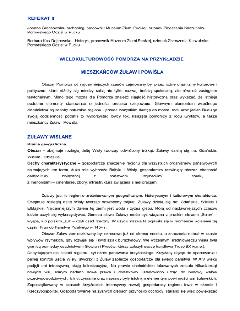 REFERAT II Joanna Grochowska- archeolog, pracownik Muzeum Ziemi Puckiej, członek Zrzeszenia KaszubskoPomorskiego Odział w Pucku Barbara Kos-Dąbrowska - historyk, pracownik Muzeum Ziemi Puckiej, członek Zrzeszenia KaszubskoPomorskiego Odział w Pucku WIELOKULTUROWOŚĆ POMORZA NA PRZYKŁADZIE MIESZKAŃCÓW ŻUŁAW I POWIŚLA Obszar Pomorza od najdawniejszych czasów zajmowany był przez różne organizmy kulturowe i polityczne, które różniły się miedzy sobą nie tylko nazwą, treścią społeczną, ale również zasięgiem terytorialnym. Mimo tego można dla Pomorza znaleźć ciągłość historyczną oraz wykazać, że istnieją podobne elementy stanowiące o jedności procesu dziejowego. Głównym elementem wspólnego dziedzictwa są zasoby naturalne regionu - przede wszystkim dostęp do morza, rzek oraz jezior. Budując swoją codzienność potrafili to wykorzystać łowcy fok, książęta pomorscy z rodu Gryfitów, a także mieszkańcy Żuław i Powiśla. ŻUŁAWY WIŚLANE Kraina geograficzna. Obszar - obejmuje rozległą deltę Wisły tworząc odwrócony trójkąt. Żuławy dzielą się na: Gdańskie, Wielkie i Elbląskie. Cechy charakterystyczne – gospodarcze znaczenie regionu dla wszystkich organizmów państwowych zajmujących ten teren, duża rola wybrzeża Bałtyku i Wisły, gospodarczo rozwinięty obszar, obecność architektury związanej z państwem krzyżackim – zamki, z menonitami – cmentarze, zbory, infrastruktura związana z melioracjami. Żuławy jest to region o zróżnicowanym geograficznym, historycznym i kulturowym charakterze. Obejmuje rozległą deltę Wisły tworząc odwrócony trójkąt. Żuławy dzielą się na: Gdańskie, Wielkie i Elbląskie. Najcenniejszym darem tej ziemi jest woda i żyzna gleba, którą od najdawniejszych czasów ludzie uczyli się wykorzystywać. Geneza słowa Żuławy może być wiązana z pruskim słowem „Solov” – wyspa, lub polskim „żuł” – czyli osad rzeczny. W użyciu nazwa ta pojawiła się w momencie wcielenie tej części Prus do Państwa Polskiego w 1454 r. Obszar Żuław zamieszkiwany był okresowo już od okresu neolitu, a znaczenia nabrał w czasie wpływów rzymskich, gdy rozwijał się i kwitł szlak bursztynowy. We wczesnym średniowieczu Wisła była granicą pomiędzy osadnictwem Słowian i Prusów, którzy założyli osadę handlową Truso (IX w.n.e.). Decydującym dla historii regionu był okres panowania krzyżackiego. Krzyżacy dążąc do opanowania i pełnej kontroli ujścia Wisły, stworzyli z Żuław zaplecze gospodarcze dla swego państwa. W XIV wieku podjęli oni intensywną akcję kolonizacyjną. Na prawie chełmińskim lokowanych zostało kilkadziesiąt nowych wsi, starym nadano nowe prawa i dodatkowo ustanowiono urząd do budowy wałów przeciwpowodziowych. Ich utrzymanie oraz naprawy były istotnym elementem powinności wsi żuławskich. Zapoczątkowany w czasach krzyżackich intensywny rozwój gospodarczy regionu trwał w okresie I Rzeczypospolitej. Gospodarowanie na żyznych glebach przynosiło dochody, starano się więc powiększać areał ziem uprawnych. Kosztem zwiększania obciążeń pańszczyźnianych budowano nowe urządzenia odwadniające – konne i wiatrowe przepompownie. Zbiegło się to w czasie z osadnictwem na tych terenach gmin menonickich, które chętnie zajmowały tereny zniszczone powodziami i trudne do zagospodarowania. Przybyli osadnicy wprowadzili nową formę organizacji wsi zwaną prawem holenderskim lub emfiteutycznym (długoletnia dzierżawa i czynsz zamiast innych świadczeń, dziedziczne prawo użytkowania gruntu). Wsie otrzymały nowy układ przestrzenny – gospodarstwa samotnicze, rozrzucone. Liczne wojny XVII w. i późniejsze, na krótko hamowały rozwój gospodarczy tych ziem. Po okresach niepokoju osadnicy wracali do naprawy zniszczonych w czasie działań wojennych elementów architektury związanej z melioracjami. Po II wojnie światowej został przerwana ciągłość osadnicza. Wysiedlono dotychczasowych mieszkańców, a w ich miejsce sprowadzono Polaków z Kresów oraz Ukraińców, ludność o innych tradycjach kulturowych. Tym samym przerwana została dotychczasowa wysoka kultura rolna i specyficzna, lokalna kultura wiejska. Krajobraz Żuław wyróżnia się ciekawą i niespotykaną na innym terenie architekturą. Głównym elementem jest rozpowszechniony typ zagrody, w której budynek mieszkalny, obora i stodoła połączone są ze sobą tworząc jedna, długą budowlę. Najbardziej reprezentacyjnym budynkami żuławskiej wsi (obok kościołów) były domy podcieniowe z ciesielskimi elementami dekoracyjnymi. Ważnym składnikiem, który wpływa na oryginalność i specyfikę Żuław są licznie zachowane cmentarze menonickie oraz zbory. Całość uzupełnia infrastruktura hydrologiczna - zachowane wały przeciwpowodziowe, mosty, kanały, przepompownie. POWIŚLE Kraina geograficzna. Obszar – teren nad dolną Wisłą na wschodnim brzegu, obecnie zajmujący obszar powiatów: kwidzyński, sztumski, częściowo malborski. Cechy charakterystyczne – pierwotnie zasiedlona przez plemiona Prusów i Słowian, zasiedlenie przez trzy główne grupy etniczne: polską, niemiecką, holenderską, duże znaczenie w przeszłości państwa krzyżackiego, architektura związana z obecnością Krzyżaków – gotyk, akcenty holenderskie – wiatraki, systemy hydrologiczne. Powiśle to kraina geograficzno-historyczna obejmująca obszary nad dolną Wisłą, na jej wschodnim brzegu. Swoim zasięgiem obejmuje obecne powiaty: kwidzyński, sztumski oraz częściowo malborski. Zawiera w sobie wielokulturowe bogactwo Pomorza, które wypływa z różnorodności tradycji i kultury. Ziemie Powiśla wchodziły dawniej w skład Prus Zachodnich, a społeczność tego regionu kształtowały trzy grupy etniczne: polska, niemiecka i holenderska. Dawniej obszar ten określano mianem Pomezanii. Nazwa ta pochodzi od pruskiego słowa: pomedian – czyli kraj pod lasami. Dla ro