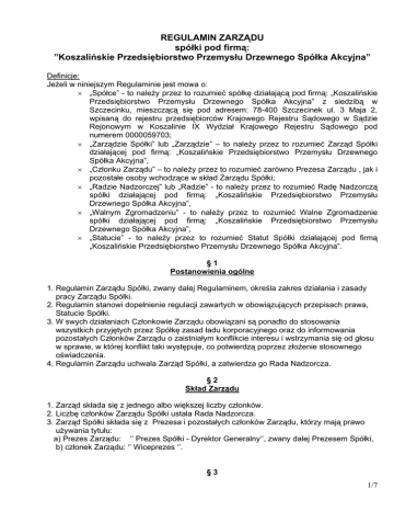 REGULAMIN ZARZĄDU spółki pod firmą: ”Koszalińskie Przedsiębiorstwo Przemysłu Drzewnego Spółka Akcyjna” Definicje: Jeżeli w niniejszym Regulaminie jest mowa o: × „Spółce” - to należy przez to rozumieć spółkę działającą pod firmą: „Koszalińskie Przedsiębiorstwo Przemysłu Drzewnego Spółka Akcyjna” z siedzibą w Szczecinku, mieszczącą się pod adresem: 78-400 Szczecinek ul. 3 Maja 2, wpisaną do rejestru przedsiębiorców Krajowego Rejestru Sądowego w Sądzie Rejonowym w Koszalinie IX Wydział Krajowego Rejestru Sądowego pod numerem 0000059703; × „Zarządzie Spółki” lub „Zarządzie” – to należy przez to rozumieć Zarząd Spółki działającej pod firmą: „Koszalińskie Przedsiębiorstwo Przemysłu Drzewnego Spółka Akcyjna”, × „Członku Zarządu” – to należy przez to rozumieć zarówno Prezesa Zarządu , jak i pozostałe osoby wchodzące w skład Zarządu Spółki; × „Radzie Nadzorczej” lub „Radzie” - to należy przez to rozumieć Radę Nadzorczą spółki działającej pod firmą: „Koszalińskie Przedsiębiorstwo Przemysłu Drzewnego Spółka Akcyjna”, × „Walnym Zgromadzeniu” - to należy przez to rozumieć Walne Zgromadzenie spółki działającej pod firmą: „Koszalińskie Przedsiębiorstwo Przemysłu Drzewnego Spółka Akcyjna”, × „Statucie” - to należy przez to rozumieć Statut Spółki działającej pod firmą „Koszalińskie Przedsiębiorstwo Przemysłu Drzewnego Spółka Akcyjna”. §1 Postanowienia ogólne 1. Regulamin Zarządu Spółki, zwany dalej Regulaminem, określa zakres działania i zasady pracy Zarządu Spółki. 2. Regulamin stanowi dopełnienie regulacji zawartych w obowiązujących przepisach prawa, Statucie Spółki. 3. W swych działaniach Członkowie Zarządu obowiązani są ponadto do stosowania wszystkich przyjętych przez Spółkę zasad ładu korporacyjnego oraz do informowania pozostałych Członków Zarządu o zaistniałym konflikcie interesu i wstrzymania się od głosu w sprawie, w której konflikt taki występuje, co potwierdzą poprzez złożenie stosownego oświadczenia. 4. Regulamin Zarządu uchwala Zarząd Spółki, a zatwierdza go Rada Nadzorcza. §2 Skład Zarządu 1. Zarząd składa się z jednego albo większej liczby członków. 2. Liczbę członków Zarządu Spółki ustala Rada Nadzorcza. 3. Zarząd Spółki składa się z Prezesa i pozostałych członków Zarządu, którzy mają prawo używania tytułu: a) Prezes Zarządu: ‘’ Prezes Spółki - Dyrektor Generalny‘’, zwany dalej Prezesem Spółki, b) członek Zarządu: ‘’ Wiceprezes ‘’. §3 1/7 Powołanie 1. Prezesa Zarządu powołuje Rada Nadzorcza. 2. Pozostali członkowie Zarządu Spółki powoływani są przez Radę Nadzorczą na wniosek Prezesa Zarządu lub z własnej inicjatywy Rady Nadzorczej. §4 Ustalanie wynagrodzenia i zawieranie umów z członkami Zarządu 1. Wynagrodzenie członków Zarządu ustala Rada Nadzorcza. 2. W umowach pomiędzy Spółką a członkami Zarządu Spółki, jak również w sporach z nimi Spółkę reprezentuje Rada Nadzorcza. 3. Rada Nadzorcza może upoważnić w drodze uchwały jednego lub więcej członków do dokonywania takich czynności prawnych. §5 Zawieszenie, odwołanie 1. Do zawieszania lub odwoływania poszczególnych Członków Zarządu lub całego Zarządu upoważniona jest Rada Nadzorcza, a także Walne Zgromadzenie. 2. Prezes Spółki może występować do Rady Nadzorczej z wnioskiem o zawieszenie albo odwołanie poszczególnych członków Zarządu Spółki. §6 Kadencja Zarządu 1. Wspólna kadencja członków Zarządu trwa pięć kolejnych lat. 2. Mandaty członków Zarządu Spółki wygasają najpóźniej z dniem odbycia Walnego Zgromadzenia zatwierdzającego sprawozdanie finansowe za ostatni pełny rok obrotowy pełnienia funkcji członka Zarządu. 3. Mandat członka Zarządu wygasa również wskutek śmierci, rezygnacji lub odwołania go ze składu Zarządu. 4. Członkowie ustępującego Zarządu Spółki mogą być ponownie powołani w skład Zarządu. 5. Członek Zarządu Spółki może być w każdym czasie odwołany, co nie uwłacza jego roszczeniom ze stosunku pracy lub innego stosunku prawnego dotyczącego pełnienia funkcji. §7 Reprezentacja Spółki 1.Do składania oświadczeń w imieniu Spółki wymagane jest współdziałanie dwóch członków Zarządu albo jednego członka Zarządu łącznie z prokurentem. W przypadku, gdy Zarząd jest jednoosobowy, jedyny członek Zarządu samodzielnie składa oświadczenia i podpisuje w imieniu Spółki. 2. Zarząd może ustanawiać prokurę. Prokura może być oddzielna lub łączna. 3. Odwołać prokurę może każdy członek Zarządu. 4. Każdy z Członków Zarządu i prokurentów jest uprawniony i zobowiązany do przyjmowania oświadczeń woli skierowanych do Spółki zarówno w lokalach Spółki, jak i poza nimi. Przy przyjęciu oświadczenia woli lub pisma każdy z uprawnionych powinien udzielać pokwitowania z zaznaczeniem i udokumentowaniem dla Spółki daty przyjęcia. 5. Członek Zarządu nie może odmówić podpisania oświadczenia, jeżeli w sprawie jego złożenia zapadła uchwała Walnego Zgromadzenia, Rady Nadzorczej lub Zarządu Spółki. §8 2/7 Kompetencje Zarządu 1. Do kompetencji Zarządu Spółki należą wszystkie sprawy niezastrzeżone Statutem Spółki lub odpowiednim przepisem prawa dla Walnego Zgromadzenia lub Rady Nadzorczej. 2. W sprawach przekraczających zakres zwykłych czynności Spółki wymagana jest uprzednia uchwała Zarządu Spółki. 3. Zarządzanie majątkiem Spółki i podejmowanie przez Zarząd Spółki decyzji dotyczących prowadzenia jej działalności obejmuje w szczególności, z uwzględnieniem ust.7: a) uchwalanie wieloletnich planów rozwoju Spółki, strategii Spółki, b) uchwalanie rocznego budżetu Spółki, c) prowadzenie polityki kredytowej i udzielanie gwarancji majątkowych, d) uchwalanie regulaminu Zarządu Spółki, e) uchwala