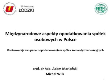 Międzynarodowe aspekty opodatkowania spółek osobowych w Polsce Kontrowersje związane z opodatkowaniem spółek komandytowo-akcyjnych prof. dr hab. Adam Mariański Michał Wilk 1 Status SKA na gruncie polskiego prawa handlowego • • • • • osobowa spółka prawa handlowego, brak osobowości prawnej, ale: SKA może we własnym imieniu nabywać prawa, w tym własność nieruchomości i inne prawa rzeczowe, zaciągać zobowiązania, pozywać i być pozywana, hybrydowy charakter SKA, zróżnicowana pozycja prawna komplementariusza i akcjonariusza, 2 Status SKA na gruncie prawa podatkowego – obecny stan prawny 1) 2) ‐ ‐ ‐ 3) podatki pośrednie, podatki dochodowe: transparentność podatkowa, opodatkowanie wspólników, status spółki osobowej przesądza o zasadach amortyzacji, opodatkowania dochodu majątku polikwidacyjnego, uchwała NSA z 16.01.2012 r. (II FPS 1/11) – opodatkowanie dochodu akcjonariusza w dniu otrzymania dywidendy. 3 Status SKA na gruncie prawa podatkowego – obecny stan prawny – SKA a prawo Unii Europejskiej - Tylko polskie spółki kapitałowe (spółka z o.o., spółka akcyjna) objęte zakresem podmiotowym regulacji prawa wtórnego UE w zakresie podatków bezpośrednich: 1) 2) 3) Dyrektywa Interest & Royalties, Dyrektywa Parent-Subsidiary Dyrektywa Merger 4 Status SKA na gruncie prawa podatkowego – obecny stan prawny – SKA a prawo międzynarodowe (1) SKA a podmiotowość podatkowa na gruncie umów w sprawie unikania podwójnego opodatkowania ‐ Art. 1 KM OECD – „niniejsza konwencja dotyczy osób mających miejsce zamieszkania lub siedzibę w jednym lub w obu umawiających się państwach” ‐ SKA jako osoba - art. 3 ust. 1 lit. a) MK OECD – „określenie „osoba" oznacza osobę fizyczną, spółkę oraz każde inne zrzeszenie osób”, ‐ art. 3 ust. 1 lit. b) MK OECD – „określenie „spółka" oznacza osobę prawną lub inną jednostkę organizacyjną, którą dla celów podatkowych traktuje się jako osobę prawną”, ‐ czy spółka osobowa może być traktowana jako „spółka” na gruncie art. 3 ust. 1 lit. b)? 5 Status SKA na gruncie prawa podatkowego – obecny stan prawny – SKA a prawo międzynarodowe (2) ‐ ‐ ‐ czy SKA jest rezydentem podatkowym? zasadniczo nie, art. 4 ust. 1 KM OECD – „w rozumieniu niniejszej konwencji, określenie „osoba mająca miejsce zamieszkania lub siedzibę w umawiającym się państwie" oznacza każdą osobę, która zgodnie z prawem tego państwa podlega tam opodatkowaniu z uwagi na jej miejsce zamieszkania, miejsce stałego pobytu, siedzibę zarządu albo inne kryterium o podobnym charakterze i obejmuje również samo państwo, jego jednostkę terytorialną lub organ lokalny”. Podmiotowość podatkowo-prawna SKA na gruncie prawa niemieckiego (podobieństwo do KGaA) 6 Status SKA na gruncie prawa podatkowego – obecny stan prawny – SKA a prawo międzynarodowe (3) ‐ ‐ art. 4 ust. 4 umowy polsko-niemieckiej - Uważa się, że spółka osobowa ma siedzibę w tym Umawiającym się Państwie, w którym znajduje się miejsce jej faktycznego zarządu. Jednakże artykuły od 6 do 23 mają zastosowanie tylko do dochodu lub majątku spółki osobowej, który podlega opodatkowaniu w Umawiającym się Państwie, w którym uważa się, że ma ona siedzibę, nie oznacza to nałożenia podatku na spółkę osobową! 7 Status SKA na gruncie prawa podatkowego – obecny stan prawny – SKA a prawo międzynarodowe (4) ‐ ‐ dochód z odsetek, dywidend, należności licencyjnych uzyskiwany przez polską SKA – opodatkowanie na zasadach określonych w UPO PL-D polska SKA jako zakład przedsiębiorcy zagranicznego (o ile spełnia przesłanki z art. 5 KM OECD) 8 Projekt nowelizacji ustawy o podatku dochodowym od osób prawnych i ustawy o podatku dochodowym od osób fizycznych • • 1) 2) 3) 4) 5) projekt z dnia 24.08.2012 r. zakres zmian: opodatkowanie SKA podatkiem dochodowym od osób prawnych, rozszerzenie zakresu stosowania przepisów o niedostatecznej kapitalizacji, ograniczenie zwolnienia z opodatkowania dywidend w przypadku pożyczki partycypacyjnej, rozszerzenie pojęcia niepodzielonych zysków, opodatkowanie dywidend wypłacanych w formie rzeczowej. 9 Projekt nowelizacji ustawy o podatku dochodowym od osób prawnych i ustawy o podatku dochodowym od osób fizycznych • • • • uzasadnienie projektu nowelizacji: „uprzywilejowana sytuacja prawna SKA względem innych spółek”, celem projektu usunięcie tej uprzywilejowanej sytuacji względem wspólników innych spółek osobowych – nie tylko nie zostanie osiągnięty, ale wręcz różnice powiększą się optymalizacja podatkowa osiągalna tylko dla największych podatników? MF nie odróżnia planowania podatkowego i optymalizacji podatkowej od unikania opodatkowania, brak zmian w prawie handlowym (SKA nadal spółką osobową). 10 Projekt nowelizacji ustawy o podatku dochodowym od osób prawnych i ustawy o podatku dochodowym od osób fizycznych • • skutek – podwójne opodatkowanie w sensie ekonomicznym dotychczas: spółki osobowe – korzystne zasady opodatkowania i odpowiedzialność wspólników, spółki kapitałowe – podwójne opodatkowanie w sensie ekonomicznym, lecz ograniczona odpowiedzialność udziałowców (akcjonariuszy), 11 Zmiany zasad opodatkowania SKA kontrowersje w zakresie jakości legislacji (1) • • • długość okresu vacatio legis – miesiąc w sprawach podatkowych jest terminem minimalnym, „władztwo państwa w dziedzinie stosunków prawnopodatkowych jest wyjątkowo silne, gwarancje ochrony prawnej interesów życiowych jednostki mają tak duże znaczenie, i muszą być przestrzegane. (...) Szczególną gwarancją w tym zakresie jest nie tylko nakaz ustanowienia vacatio legis, ale też jej okres musi mieć charakter odpowiedni do natury wprowadzanego przepisu. Szczególnie zaś w przypadku prawa daninowego należy wymagać dłuższego okresu dostosowawczego.” (wyrok TK z 15.0