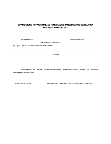 Załącznik nr 14 WZÓR OŚWIADCZENIE POTWIERDZAJĄCE TYMCZASOWE ZAMELDOWANIE UCZNIA POZA MIEJSCEM ZAMIESZKANIA Oświadczam, że ......................................................................w roku szkolnym ............/............ (imię i nazwisko dziecka) jest tymczasowo zameldowany/zameldowana w .................................................................................... ……………………………………………………………………………………………………………………… ……………………………………………………………………………………………………………………… (adres) Oświadczam, że jestem świadomy/świadoma odpowiedzialności karnej za złożenie fałszywego oświadczenia. ......................................... (miejscowość, data) ................................................................................................ (podpis osoby ubiegającej się składającej oświadczenie) 33