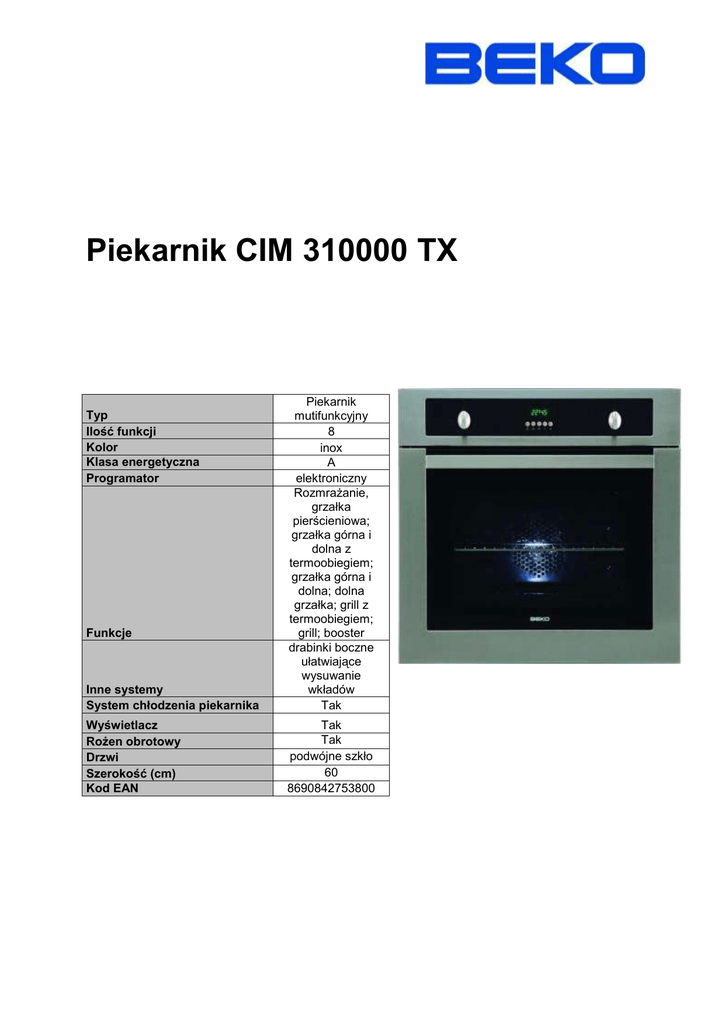 Piekarnik CIM 310000 TX Inne systemy System chłodzenia piekarnika Piekarnik mutifunkcyjny 8 inox A elektroniczny Rozmrażanie, grzałka pierścieniowa; grzałka górna i dolna z termoobiegiem; grzałka górna i dolna; dolna grzałka; grill z termoobiegiem; grill; booster drabinki boczne ułatwiające wysuwanie wkładów Tak Wyświetlacz Rożen obrotowy Drzwi Szerokość (cm) Kod EAN Tak Tak podwójne szkło 60 8690842753800 Typ Ilość funkcji Kolor Klasa energetyczna Programator Funkcje