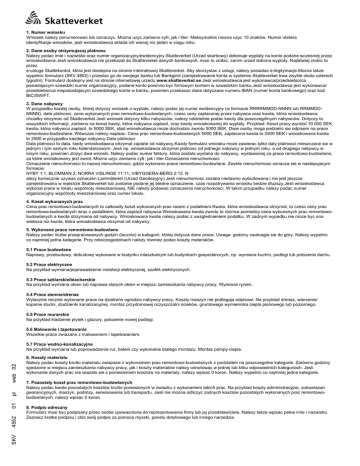 * Skatteverket 1. Numer wniosku Wniosek nalezy ponumerowac lub oznaczyc. Mozna uzyc zarówno cyfr, jak i liter. Maksymalnie mozna uzyc 10 znaków. Numer ulatwia identyfikacje wniosków, jesli wnioskodawca sklada ich wiecej niz jeden w ciagu roku. 2. Dane osoby otrzymujacej platnosc Nalezy podac imie i nazwisko oraz numer organizacyjny/ewidencyjny.Skatteverket (Urzad skarbowy) dokonuje wyplaty na konto podane wczesniej przez wnioskodawce.Jesli wnioskodawca nie przekazal do Skatteverket danych bankowych, musi to zrobic, zanim urzad dokona wyplaty. Najlatwiej zrobic to przez e-usluge Skattekontot, która jest dostepna na stronie internetowej Skatteverket. Aby skorzystac z uslugi, nalezy posiadac e-legitymacje.Mozna takze wypelnic formularz (SKV 4802) i przeslac go do swojego banku lub Bankgirot (zarejestrowanie konta w systemie Skatteverket trwa zwykle okolo czterech tygodni). Formularz dostepny jest na stronie internetowej urzedu www.skatteverket.se.Jesli wnioskodawca jest wykonawca/przedsiebiorca posiadajacym szwedzki numer organizacyjny, podane konto powinno byc firmowym kontem w szwedzkim banku.Jesli wnioskodawca jest wykonawca/ przedsiebiorca nieposiadajacym szwedzkiego konta w banku, powinien przekazac dane dotyczace numeru IBAN (numer konta bankowego) oraz kod BIC/SWIFT. 3. Dane nabywcy W przypadku kazdej osoby, której dotyczy wniosek o wyplate, nalezy podac jej numer ewidencyjny (w formacie RRRRMMDD-NNNN lub RRMMDDNNNN), date platnosci, cene wykonanych prac remontowo-budowlanych, czesc ceny zaplaconej przez nabywce oraz kwote, która wnioskodawca chcialby otrzymac od Skatteverket.Jesli wniosek dotyczy kilku nabywców, nalezy oddzielnie podac kwoty dla poszczególnych nabywców. Dotyczy to wszystkich informacji, zarówno na temat kwoty, która nabywca zaplacil, oraz kwoty wnioskowanej do wyplaty. Przyklad: Koszt pracy wyniósl 10 000 SEK, kwota, która nabywca zaplacil, to 5000 SEK, stad wnioskodawca moze dochodzic zwrotu 5000 SEK. Dwie osoby moga podzielic sie odpisem na prace remontowo-budowlane. Wówczas nalezy napisac: Cena prac remontowo-budowlanych 5000 SEK, zaplacona kwota to 2500 SEK i wnioskowana kwota to 2500 w przypadku kazdego nabywcy.Data platnosci Data platnosci to data, kiedy wnioskodawca otrzymal zaplate od nabywcy.Kazdy formularz wniosku moze zawierac tylko daty platnosci mieszczace sie w jednym i tym samym roku kalendarzowym. Jesli np. wnioskodawca otrzymal platnosc od jednego nabywcy w jednym roku, a od drugiego nabywcy w innym roku, powinien zlozyc dwa wnioski. Nalezy podac numer faktury, która zostala wyslana do nabywcy, wystawionej za prace remontowo-budowlane, za które wnioskowany jest zwrot. Mozna uzyc zarówno cyfr, jak i liter.Oznaczenie nieruchomosci Oznaczenie nieruchomosci to nazwa nieruchomosci, gdzie wykonano prace remontowo-budowlane. Zwykle nieruchomosc oznacza sie w nastepujacym formacie: NYBY 1:1, BLOMMAN 2, NORRA VISLINGE 11:11, VIBYGGERA-BERG 2:12. N alezy koniecznie uzywac oznaczen Lantmäteriet (Urzad Geodezyjny).Jesli nieruchomosc zostala niedawno wybudowana i nie jest jeszcze zarejestrowana w rejestrze Skatteverket lub zostanie podane jej bledne oznaczenie, czas rozpatrywania wniosku bedzie dluzszy.Jesli wnioskodawca wykonal prace w lokalu wspólnoty mieszkaniowej, NIE nalezy podawac oznaczenia nieruchomosci. W takim przypadku nalezy podac numer organizacyjny wspólnoty mieszkaniowej oraz numer lokalu. 4. Koszt wykonanych prac Cena prac remontowo-budowlanych to calkowity koszt wykonanych prac razem z podatkiem.Kwota, która wnioskodawca otrzymal, to czesc ceny prac remontowo-budowlanych wraz z podatkiem, która zaplacil nabywca.Wnioskowana kwota zwrotu to róznica pomiedzy cena wykonanych prac remontowobudowlanych a kwota otrzymana od nabywcy. Wnioskowana kwote nalezy podac z uwzglednieniem podatku. W zadnym wypadku nie moze byc ona wieksza niz kwota, która wnioskodawca otrzymal od nabywcy. 5. Wykonane prace remontowo-budowlane Nalezy podac liczbe przepracowanych godzin (lacznie) w kategorii, której dotycza dane prace. Uwaga: godziny zaokragla sie do góry. Nalezy wypelnic co najmniej jedna kategorie. Przy roboczogodzinach nalezy równiez podac koszty materialów. 5.1 Prace budowlane Naprawy, przebudowy, dobudowy wykonane w budynku mieszkalnym lub budynkach gospodarczych, np. wymiana kuchni, podlogi lub polozenie dachu. 5.2 Prace elektryczne Na przyklad wymiana/poprowadzenie instalacji elektrycznej, szafek elektrycznych. 5.3 Prace szklarskie/blacharskie Na przyklad wymiana okien lub naprawa starych okien w miejscu zamieszkania nabywcy pracy. Wymiana rynien. 5.4 Prace ziemne/drenaz Wylacznie recznie wykonane prace na dzialce/w ogrodzie nabywcy pracy. Koszty maszyn nie podlegaja odpisowi. Na przyklad drenaz, wiercenie/ kopanie studni, studzienki kanalizacyjnej, montaz przydomowej oczyszczalni scieków, gruntowego wymiennika ciepla pionowego lub poziomego. . 5.5 Prace murarskie Na przyklad kladzenie plytek i glazury, polozenie nowej podlogi. SKV 4552 01 pl web 02 5.6 Malowanie i tapetowanie Wszelkie prace zwiazane z malowaniem i tapetowaniem. . 5.7 Prace wodno-kanalizacyjne Na przyklad wymiana lub poprowadzenie rur, baterii czy wykonanie bialego montazu. Montaz pompy ciepla. 6. Koszty materialu Nalezy podac koszty brutto materialu zwiazane z wykonaniem prac remontowo-budowlanych z podzialem na poszczególne kategorie. Zarówno godziny spedzone w miejscu zamieszkania nabywcy pracy, jak i koszty materialów nalezy odnotowac w jednej lub kilku odpowiednich kategoriach. Jesli wykonanie danych prac nie wiazalo sie z poniesieniem kosztów na materialy, nalezy wpisac 0 koron. Nalezy wypelnic co najmniej jedna kategorie. 7. Pozostaly koszt prac remontowo-budowlanych Nalezy podac kwote pozostalych kosztów brutto poniesionych w zwiazku z wykonaniem takich prac. Na przyklad koszty administracyjne, zobowiazan gwarancyjnych, maszyn, podrózy, serwisowania lub transportu. Jesli nie mozna odliczyc zadnych kosztów pozostalych wykonanych prac remontowobudo