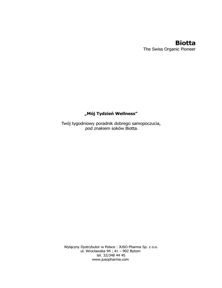 Biotta The Swiss Organic Pioneer „Mój Tydzień Wellness” Twój tygodniowy poradnik dobrego samopoczucia, pod znakiem soków Biotta. Wyłączny Dystrybutor w Polsce : JUSO Pharma Sp. z o.o. ul. Wrocławska 94 ; 41 – 902 Bytom tel. 32/348 44 45 www.jusopharma.com Gratulacje! Zdecydowałeś się wypróbować Tydzień Wellness z sokami Biotta ! Jesteśmy zaszczyceni tym faktem i chcielibyśmy Cię wesprzeć najlepiej jak możemy, w ciągu tych siedmiu dni. Niniejszy mały poradnik jest pełen wskazówek i informacji które sprawią, że po upływie tygodnia poczujesz się jak Nowo Narodzony. Tydzień Wellness z sokami Biotta odtruwa nie tylko ciało, ale i umysł; w ciągu zaledwie jednego tygodnia pozbędziesz się zbędnej wagi. Oczyścisz swoje ciało, dając mu nową energię i podkładając perfekcyjne fundamenty pod nowy styl życia. W odróżnieniu od tradycyjnych diet, Tydzień Wellness z sokami Biotta nie jest dietą głodową. Dzięki organicznym sokom owocowym i warzywnym, Twoje ciało będzie otrzymywało potrzebne witaminy i minerały, co nie zmniejszy Twojej normalnej aktywności. Życzymy samych sukcesów, mnóstwa energii i świadomego wykorzystania naszego produktu Tydzień Wellness! Wasz Zespół Biotta P.S.: Tydzień Wellness z sokami Biotta ma ponad 20-letnią tradycję. DZIĘKUJEMY za zaufanie. Tydzień Wellness z sokami Biotta : dobry dla każdego? Naukowcy z firmy Biotta opracowali Tydzień Wellness w 1994r. Jednym z głównych celów było stworzenie tygodniowego produktu osiągalnego i dostępnego dla możliwie jak największej grupy docelowej. Dlatego właśnie rezultat Tygodnia Wellness z sokami Biotta jest odpowiedni dla każdej zdrowej osoby dorosłej. Jeśli jesteś Cukrzykiem lub masz inne problemy zdrowotne, proponujemy abyś wypróbował Tydzień Wellness pod nadzorem lekarza. To samo dotyczy osób poniżej 18 roku życia. Jeśli jesteś w ciąży lub karmisz piersią, zalecamy odłożenie Tygodnia Wellness z sokami Biotta na inny termin. - 100% naturalne - 100% świeżo wyciśnięty sok - 100% organiczne - zero sztucznych składników - bez dodatku cukru Wskazówki dla Wegan: Soki Wellness i Vita -7 (zawierające serwatkę) przekaż Przyjaciołom nie będącym Weganami i zastąp je innymi sokami Biotta. Właściwą alternatywą mogą być soki warzywne lub mieszane owocowo – warzywne jak np. : Sok Biotta Powerberry Owocowy z dodatkiem karotki. Co znajdziesz w Pakiecie Tygodnia Wellness : Sok Biotta Wellness ( 3 sztuki ) : sok z gruszki, puree z gruszki, sok pomarańczowy, sok z marchwi, sok z buraka, sok z ananasa, serwatka, sok z cytryny; czynią ten organiczny sok prawdziwą bazą Tygodnia Wellness. Sok Biotta Vita - 7 ( 2 sztuki ) : sok pomarańczowy, sok z marchwi ze skoncentrowanym sokiem z cytryny, puree bananowe, sok jabłkowy, sok ananasowy, serwatka, sok z winogron, jagody rokitnika, sok z buraka, sok z cytryny; wnosi odmianę do Tygodnia Wellness. Sok Biotta z Pomidorów ( 2 sztuki ) : sok ze świeżo zebranych pomidorów wzbogacony sokiem z cytryny i szczyptą soli morskiej. Przepyszny na zimno i ciepło. Sok Biotta Koktajl Warzywny ( 2 sztuki ) : sok pomidorowy, sok z marchwi, sok z selera, sok z buraków, wzmocnione ziołami i szczyptą soli morskiej ; daje pełną dawkę warzyw, nie tylko w ciągu Tygodnia Wellness. Sok Biotta Digest Wieloowocowy ( 2 sztuki ) : sok ze śliwek, sok jabłkowy, wyciąg z herbaty ziołowej : kwiat lipy, rumianek, werbena, mięta, róża, koperek, nagietek; sok z winogron, wyciąg z fig, sok z aronii, sok z cytryny – to słodka odmiana o poranku i wieczorem. Siemię Lniane Organiczne ( 1 sztuka/100g ): Twój dzienny towarzysz na nadchodzący tydzień. Herbata ziołowa (1 sztuka/75 g ): Zioła najwyższej jakości dadzą Ci doznanie ciepła i wypoczynku. Skład: kwiat lipy, rumianek, werbena, mięta pieprzowa, owoce dzikiej róży, koper, nagietek. Przygotowanie: 2 łyżki Organicznej Herbaty ziołowej zalać 1 litrem wrzącej wody i odstawić na 10 minut. Informacje i porady dla Twojego Tygodnia Wellness z sokami Biotta. 1. Najlepszy czas.... Zasadniczo, możesz skorzystać z Tygodnia Wellness z sokami Biotta kiedy tylko chcesz. Wiosna jednak jest najpopularniejszym okresem, ponieważ wtedy ludzie często odczuwają potrzebę oczyszczenia Swojego Organizmu po okresie zimowym. Ale decyzja kiedy nadejdzie ten czas, zawsze należy do Ciebie. Wsłuchaj się we własne potrzeby! Nasza rada: Zaplanuj swój Tydzień Wellness z wyprzedzeniem. Pomoże ci to ominąć przeszkody typu kolacje biznesowe czy imprezy urodzinowe z uroczystymi ciastami :-) 2. Sukces !!! Po pierwsze i najważniejsze: powinieneś czuć się dobrze! Oczywiście rezygnacja z tradycyjnych posiłków przez tydzień będzie wymagała znacznego wysiłku, ale nie podejmuj decyzji aby się torturować. Jeśli zaczniesz mieć wątpliwości, zapytaj samego siebie, czy to tylko chwilowe załamanie, czy naprawdę osiągnąłeś swoją granicę. Nie martw się, lepsze dni są tuż „za rogiem”. Nasze rady: − Zwracaj uwagę na swój tygodniowy rozkład zajęć i swoje cele. Dobrze opracowany plan pomoże Ci uniknąć ciężkich momentów. − Zapewnij swojemu ciału dużą ilość świeżego powietrza, lekkie ćwiczenia z wystarczającą ilością snu. − Delektuj się sokami Biotta. Pij je z umiarem, łyczek po łyczku, niezbyt zimne. Możesz je również mieszać z wodą, aby zwiększyć porcje. − Staraj się całkowicie unikać kawy, czarnej herbaty i alkoholu. − Palacze powinni ograniczyć palenie. Jeśli rozważasz rzucenie palenia, czemu właśnie nie teraz? − Będziemy trzymać za Ciebie kciuki! 3. Stare dobre trawienie. Dla uzyskania optymalnej detoksykacji, należy całkowicie wypróżnić jelita na początku tygodnia. Podczas trwania Tygodnia Wellness z sokami Biotta istotne jest ponadto regularne, codzienne wypróżnianie. Produkty zawarte w opakowaniu powinny Ci w tym celu pomóc. Nasze rady: Jeśli dokuczają Ci obstrukcje: − W