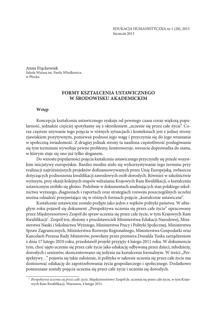 EDUKACJA HUMANISTYCZNA nr 1 (28), 2013 Szczecin 2013 Anna Frąckowiak Szkoła Wyższa im. Pawła Włodkowica w Płocku FORMY KSZTAŁCENIA USTAWICZNEGO W ŚRODOWISKU AKADEMICKIM Wstęp Koncepcja kształcenia ustawicznego zyskuje od pewnego czasu coraz większą popularność, jednakże częściej spotykamy się z określeniem „uczenie się przez całe życie”. Coraz częstsze używanie tego pojęcia w różnych sytuacjach i kontekstach jest z jednej strony zjawiskiem pozytywnym, ponieważ podnosi jego wagę i przyczynia się do jego wrastania w społeczną świadomość. Z drugiej jednak strony ta nasilona częstotliwość posługiwania się tym terminem wywołuje pewne problemy, kontrowersje, wreszcie doprowadza do stanu, w którym staje się ono już tylko sloganem. Do wzrostu popularności pojęcia kształcenia ustawicznego przyczyniły się przede wszystkim inicjatywy europejskie. Bardzo modne stało się wykorzystywanie tego terminu przy realizacji najróżniejszych projektów dofinansowywanych przez Unię Europejską, zwłaszcza dotyczących podnoszenia kwalifikacji zawodowych osób dorosłych. Również w szkolnictwie wyższym, przy okazji kolejnych etapów wdrażania Krajowych Ram Kwalifikacji, o kształceniu ustawicznym zrobiło się głośno. Podobnie w dokumentach analizujących stan polskiego szkolnictwa wyższego, diagnozach i raportach oraz strategiach rozwoju poszczególnych uczelni można odnaleźć przejawiające się w różnych formach pojęcie „kształcenie ustawiczne”. Kształcenie ustawiczne zostało podjęte jako jeden z wątków polityki państwa. W ubiegłym roku pojawił się dokument „Perspektywa uczenia się przez całe życie” opracowany przez Międzyresortowy Zespół do spraw uczenia się przez całe życie, w tym Krajowych Ram Kwalifikacji1. Zespół ten, złożony z przedstawicieli Ministerstwa Edukacji Narodowej, Ministerstwa Nauki i Szkolnictwa Wyższego, Ministerstwa Pracy i Polityki Społecznej, Ministerstwa Spraw Zagranicznych, Ministerstwa Rozwoju Regionalnego, Ministerstwa Gospodarki oraz Kancelarii Prezesa Rady Ministrów, powołany przez premiera Donalda Tuska zarządzeniem z dnia 17 lutego 2010 roku, przedstawił projekt przyjęty 4 lutego 2011 roku. W dokumencie tym, choć ujęto uczenie się przez całe życie jako edukację odbywaną przez dzieci, młodzieży, dorosłych i seniorów, skoncentrowano się jedynie na kształceniu formalnym. W treści „Perspektywy…” pojawia się takie założenie, iż polityka w zakresie uczenia się przez całe życie ma dostosować edukację do zapotrzebowania życia gospodarczego i społecznego. Dodatkowo pomieszane zostały pojęcia uczenia się przez całe życie i uczenia się dorosłych. 1 Perspektywa uczenia się przez całe życie, Międzyresortowy Zespół ds. uczenia się przez całe życie, w tym Krajowych Ram Kwalifikacji, Warszawa, 4 lutego 2011. Anna Frąckowiak 168 Najczęściej w dokumentach ogólnopolskich, np. raportach, diagnozach, strategiach, wykorzystywana jest definicja kształcenia ustawicznego podawana w ustawie o systemie oświaty, w której to pojęcie definiowane jest następująco: „kształcenie w szkołach dla dorosłych, a także uzyskiwanie i uzupełnianie wiedzy ogólnej, umiejętności i kwalifikacji zawodowych w formach pozaszkolnych przez osoby, które spełniły obowiązek szkolny”2. Należy zaznaczyć, że mimo ułomności tej definicji ministerstwo jest konsekwentne w jej stosowaniu, o czym świadczy nowo wydane rozporządzenie w sprawie kształcenia ustawicznego w formach pozaszkolnych: „Kształcenie ustawiczne prowadzi się w następujących formach pozaszkolnych: kwalifikacyjny kurs zawodowy; kurs umiejętności zawodowych; kurs kompetencji ogólnych; turnus dokształcania teoretycznego młodocianych pracowników; kurs inny niż wymienione w pkt. 1-3, umożliwiający uzyskiwanie i uzupełnianie wiedzy, umiejętności i kwalifikacji zawodowych”3. Nic zatem dziwnego, że sankcjonowane przez ministerstwo dość wąskie definiowanie kształcenia ustawicznego przyjmowane jest za powszechne. Nie pozwala to jednak dostrzec w pełni przejawów jego praktyki w różnych formach edukacyjnych, w tym i w szkolnictwie wyższym. Spory o terminologię i przesunięcia paradygmatyczne Najczęściej zróżnicowanie terminologiczne dotyczące kształcenia ustawicznego tłumaczone jest określonymi podstawami teoretycznymi, jak również zmianami w myśleniu o edukacji w perspektywie całożyciowej. Mieczysław Malewski wskazał na fundamenty, na których opiera się zarówno koncepcja kształcenia ustawicznego, jak i całożyciowego uczenia się. Źródłem koncepcji kształcenia ustawicznego, od wczesnych lat 60. XX wieku, jest teoria kapitału ludzkiego4, z kolei koncepcja całożyciowego uczenia się, która pojawiła się w latach 80. XX wieku, opiera się na teorii kapitału społecznego5. Zmiany i zróżnicowanie terminologii związane są nie tylko z teoriami, ale też i zmianą paradygmatyczną, wynikającą z przejścia od społeczeństwa modernistycznego do społeczeństwa późnej nowoczesności. Koncepcja kształcenia ustawicznego, według Malewskiego, jest związana z rozwojem zasobów ludzkich, a także bardziej technicystyczną koncepcją edukacji, gdzie dominuje obiektywny typ wiedzy, orientacja na przystosowanie, biografie ludzkie są stabilne, gdzie nie ma autonomii edukacji dorosłych i tożsamość określana jest jako „ja przedmiotowe”. Z kolei przesunięcie paradygmatyczne prowadzące do uczenia się całożyciowego, opartego na teorii kapitału społecznego i założeniu o uczącej się organizacji, związane jest z emancypacyjną funkcją edukacji, gdzie wiedza jest intersubiektywna, biografia układa się w sekwencje, dominuje orientacja na subiektywność i tożsamość w postaci „ja podmiotowego”, zaś edukacja dorosłych jest autonomiczna6. Autor ten pisze również o drugim przesunięciu paradygmatycznym, związanym z czasem pon