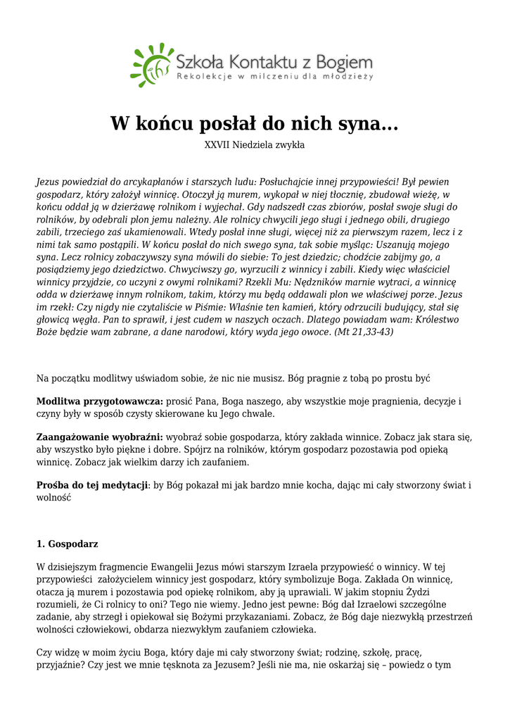 W końcu posłał do nich syna... XXVII Niedziela zwykła Jezus powiedział do arcykapłanów i starszych ludu: Posłuchajcie innej przypowieści! Był pewien gospodarz, który założył winnicę. Otoczył ją murem, wykopał w niej tłocznię, zbudował wieżę, w końcu oddał ją w dzierżawę rolnikom i wyjechał. Gdy nadszedł czas zbiorów, posłał swoje sługi do rolników, by odebrali plon jemu należny. Ale rolnicy chwycili jego sługi i jednego obili, drugiego zabili, trzeciego zaś ukamienowali. Wtedy posłał inne sługi, więcej niż za pierwszym razem, lecz i z nimi tak samo postąpili. W końcu posłał do nich swego syna, tak sobie myśląc: Uszanują mojego syna. Lecz rolnicy zobaczywszy syna mówili do siebie: To jest dziedzic; chodźcie zabijmy go, a posiądziemy jego dziedzictwo. Chwyciwszy go, wyrzucili z winnicy i zabili. Kiedy więc właściciel winnicy przyjdzie, co uczyni z owymi rolnikami? Rzekli Mu: Nędzników marnie wytraci, a winnicę odda w dzierżawę innym rolnikom, takim, którzy mu będą oddawali plon we właściwej porze. Jezus im rzekł: Czy nigdy nie czytaliście w Piśmie: Właśnie ten kamień, który odrzucili budujący, stał się głowicą węgła. Pan to sprawił, i jest cudem w naszych oczach. Dlatego powiadam wam: Królestwo Boże będzie wam zabrane, a dane narodowi, który wyda jego owoce. (Mt 21,33-43) Na początku modlitwy uświadom sobie, że nic nie musisz. Bóg pragnie z tobą po prostu być Modlitwa przygotowawcza: prosić Pana, Boga naszego, aby wszystkie moje pragnienia, decyzje i czyny były w sposób czysty skierowane ku Jego chwale. Zaangażowanie wyobraźni: wyobraź sobie gospodarza, który zakłada winnice. Zobacz jak stara się, aby wszystko było piękne i dobre. Spójrz na rolników, którym gospodarz pozostawia pod opieką winnicę. Zobacz jak wielkim darzy ich zaufaniem. Prośba do tej medytacji: by Bóg pokazał mi jak bardzo mnie kocha, dając mi cały stworzony świat i wolność 1. Gospodarz W dzisiejszym fragmencie Ewangelii Jezus mówi starszym Izraela przypowieść o winnicy. W tej przypowieści założycielem winnicy jest gospodarz, który symbolizuje Boga. Zakłada On winnicę, otacza ją murem i pozostawia pod opiekę rolnikom, aby ją uprawiali. W jakim stopniu Żydzi rozumieli, że Ci rolnicy to oni? Tego nie wiemy. Jedno jest pewne: Bóg dał Izraelowi szczególne zadanie, aby strzegł i opiekował się Bożymi przykazaniami. Zobacz, że Bóg daje niezwykłą przestrzeń wolności człowiekowi, obdarza niezwykłym zaufaniem człowieka. Czy widzę w moim życiu Boga, który daje mi cały stworzony świat; rodzinę, szkołę, pracę, przyjaźnie? Czy jest we mnie tęsknota za Jezusem? Jeśli nie ma, nie oskarżaj się – powiedz o tym dobremu Bogu. 2. Posłani Gospodarz wysyła swoje sługi do rolników, aby odebrać plon jemu należny. Gospodarz chce odebrać to, co rolnicy wypracowali w czasie, gdy on był nieobecny w winnicy. Niestety rolnicy bili i kamienowali sługi gospodarza. W końcu wysłał on swojego syna, aby odebrać należny mu plon. Jego również odrzucili. Jezus robi tu aluzję do siebie samego, bowiem to on zostanie zabity przez ludzi. Bóg z miłości posłał swojego Syna, aby zbawił świat, jednak ludzie nie rozpoznali w Nim owego syna, który przyszedł zebrać plon miłości i sprawiedliwości. Bóg i dziś wysyła do mnie ludzi – swoich proroków; i swojego Syna, aby ukazać mi miłość. Jak ją odkrywam w mojej codzienności? Gdzie szczególnie widzę działanie Boga, który kocha? Może w mojej rodzinie, bliskich, przeżywanych cierpieniach czy radościach… Spróbuj popatrzeć na całe dobro, którym jesteś obdarzanym w swoim życiu. Rozmowa końcowa: Porozmawiaj z Jezusem o tym co poruszyło Cię w tej medytacji. Uwielbiaj dobrego Pana, który pragnie objawiać ci swoją nieskończoną i czułą miłość! On jest jedynym pocieszeniem, schronieniem i ostoją człowieka! Na zakończenie odmów: Ojcze nasz.