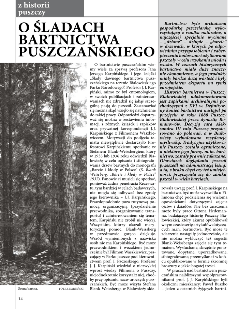 z historii puszczy O śladach bartnictwa puszczańskiego Sosna bartna. 14 FOT. J. J. KARPIŃSKI O bartnictwie puszczańskim wiemy wiele za sprawą profesora Jana Jerzego Karpińskiego i jego książki „Ślady dawnego bartnictwa puszczańskiego na terenie Białowieskiego Parku Narodowego”. Profesor J. J. Karpiński, mimo że był entomologiem, w swoich publikacjach i zainteresowaniach nie zdradził się jakąś szczególną pasją do pszczół. Zastanawiać się można skąd wzięło się natchnienie do takiej pracy. Odpowiedzi dopatrywać się można w zestawieniu informacji z różnych książek i zapisków oraz prywatnej korespondencji J. J. Karpińskiego z Filimonem Waszkiewiczem. Motywacji do podjęcia tematu niewątpliwie dostarczyło Profesorowi Karpińskiemu spotkanie ze Stefanem Blank-Weissbergiem, który w 1935 lub 1936 roku odwiedził Białowieżę w celu opisania i sfotografowania drzew bartnych do monografii „Barcie i kłody w Polsce” (S. Blank Weissberg, „Barcie i kłody w Polsce” 1937). Panowie ci musieli się spotkać, ponieważ żadna penetracja Rezerwatu, tym bardziej w celach badawczych, nie mogła się odbywać bez zgody jego kierownika – J. J. Karpińskiego. Prawdopodobnie poza rutynową pomocą organizacyjną (przydzielenie przewodnika, zorganizowanie transportu) i zainteresowaniem się tematem, Karpiński nie zrobił nic więcej. Wszystkim, którzy okazali merytoryczną pomoc, Blank-Weissberg w przedmowie gorąco dziękuje. Wśród wymienionych z nazwiska osób nie ma Karpińskiego. Być może przewodnikiem i wozakiem jednocześnie był Filimon Waszkiewicz, pracujący w Parku jeszcze pod kierownictwem prof. J. Paczoskiego. Profesor J. J. Karpiński wiedział o niezwykłej wprost wiedzy Filimona o Puszczy, niejednokrotnie korzystał z niej, choćby przy opisaniu nazw uroczysk puszczańskich. Być może wizyta Stefana Blank-Weissberga w Białowieży skie- Bartnictwo było archaiczną gospodarką pszczelarską wykorzystującą z rzadka naturalne, a najczęściej specjalnie wycinane – „dziane” – dziuple – „barcie” w drzewach, w których po odpowiednim przysposobieniu i zabezpieczeniu hodowano i użytkowano pszczoły w celu uzyskania miodu i wosku. W czasach historycznych bartnictwo miało duże znaczenie ekonomiczne, a jego produkty miały bardzo dużą wartość i były przedmiotem eksportu na rynki europejskie. Historia bartnictwa w Puszczy Białowieskiej udokumentowana jest zapiskami archiwalnymi pochodzącymi z XVI w. Definitywny koniec bartnictwa nastąpił po przejęciu w roku 1888 Puszczy Białowieskiej przez dynastię Romanowów. Decyzją cara Aleksandra III całą Puszczę przystosowano do polowań, a w Białowieży wybudowano rezydencję myśliwską. Tradycyjne użytkowanie Puszczy zostało ograniczone, a niektóre jego formy, m.in. bartnictwo, zostały prawnie zakazane. Obowiązek doglądania pszczół przeszedł na administrację leśną, a ta, z braku chęci czy też umiejętności, przyczyniła się do zaniku pszczół w wielu barciach. rowała uwagę prof. J. Karpińskiego na bartnictwo, być może wyzwoliła u Filimona chęć podzielenia się wieloma opowieściami dotyczącymi zajęcia ojców i dziadów. Nie bez znaczenia może były prace Ottona Hedemanna, badającego historię Puszczy Białowieskiej, który akurat opublikował w tym czasie serię artykułów dotyczących m.in. bartnictwa. Być może te zdarzenia nastąpiły jednocześnie, ale nie można wykluczyć też sugestii Blank-Weissberga zajęcia się tym tematem. Wysłuchane, skrzętnie ponotowane, dopytane, uporządkowane, sfotografowane, przemyślane i w końcu opublikowane w formie skromnej broszury o jakże bogatej treści. W pracach nad bartnictwem puszczańskim najbliższymi współpracownikami prof. J. J. Karpińskiego byli okoliczni mieszkańcy: Paweł Buszko – jeden z ostatnich żyjących bartni- Paweł Buszko. FOT. J. J. KARPIŃSKI Filimon Waszkiewicz. FOT. J. J. KARPIŃSKI Ekspozycja bartna w starym Muzeum BPN. FOT. J. J. KARPIŃSKI Ciosno bartne. FOT. J. J. KARPIŃSKI ków puszczańskich, Filimon Waszkiewicz i Jan Szpakowicz, którzy arkana sztuki bartnej poznawali pod opieką swoich ojców i dziadów. Dzięki ich zapałowi Profesor zanotował i uwiecznił na fotografiach to, co jeszcze zostało w pamięci tych ludzi, ale także odszukał i opisał to, co można było znaleźć w ostępach leśnych. Prace inwentaryzacyjne, opisujące drzewa bartne w Rezerwacie, prowadzone były od sierpnia do listopada 1936 roku. W ich wyniku znaleziono, opisano i udokumentowano na fotografiach 68 drzew bartnych. Niektóre sosny miały obcięte wierzchołki, co miało zabezpieczyć drzewo przed wyłamaniem lub wywróceniem. Na korze wielu drzew widoczne były jeszcze „ciosna” – znaki własności. Wiele barci zachowało swoje wyposażenie: płaszkę – płaską deseczkę zakrywająca otwór barci; klucze – drewniane, hakowato zakończone kołki umieszczane nad i pod otworem barci służące do zawieszania śniotu; śniot – wałek dębowy przecięty wzdłużnie na pół chroniący barć przed szkodnikami; hwozdownię – kołek dębowy na który odwieszano śniot w czasie oporządzania barci; kołeczki – służące do mocowania sznura, który przytrzymywał gałązki świerkowe ocieplające barć zimą. Po niektórych barciach zostały tylko zarastające blizny na drzewach. Z niektórych drzew pozostały tylko butwiejące szczątki, wśród których wprawne oko mogło dopatrzyć się rozdartych fragmentów barci. Profesor J.J. Karpiński zebrał też narzędzia do dziania i obsługi barci, sprzęty związane z użytkowaniem oraz przerobem miodu i wosku. Dzięki mozolnej pracy zgromadzono wiele materiałów i informacji, które pozwoliły na otwarcie w 1937 roku działu bartnictwa w muzeum puszczańskim w Białowieży. W czasie II wojny światowej zbiory spłonęły. Po wojnie staraniem Profesora i Filimona Waszkiewicza odtworzono ekspozycję. Zgromadzoną dok