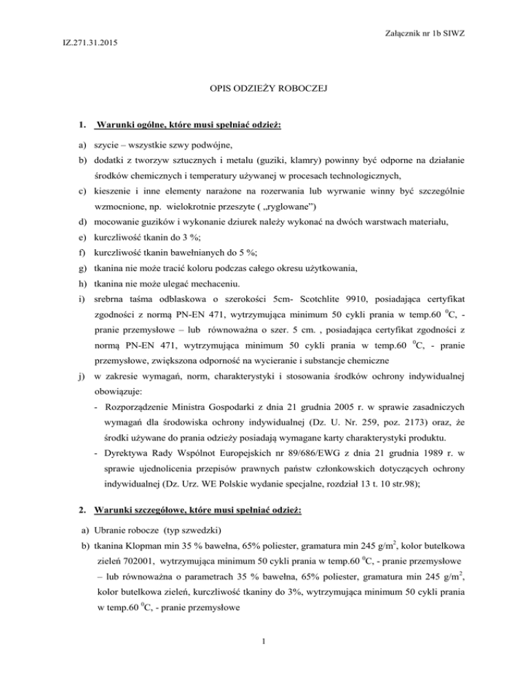 OPIS ODZIEŻY ROBOCZEJ 1. Warunki ogólne, które musi spełniać