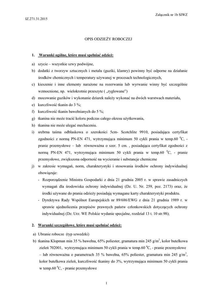 Załącznik nr 1b SIWZ IZ.271.31.2015 OPIS ODZIEŻY ROBOCZEJ 1. Warunki ogólne, które musi spełniać odzież: a) szycie – wszystkie szwy podwójne, b) dodatki z tworzyw sztucznych i metalu (guziki, klamry) powinny być odporne na działanie środków chemicznych i temperatury używanej w procesach technologicznych, c) kieszenie i inne elementy narażone na rozerwania lub wyrwanie winny być szczególnie wzmocnione, np. wielokrotnie przeszyte ( „ryglowane”) d) mocowanie guzików i wykonanie dziurek należy wykonać na dwóch warstwach materiału, e) kurczliwość tkanin do 3 %; f) kurczliwość tkanin bawełnianych do 5 %; g) tkanina nie może tracić koloru podczas całego okresu użytkowania, h) tkanina nie może ulegać mechaceniu. i) srebrna taśma odblaskowa o szerokości 5cm- Scotchlite 9910, posiadająca certyfikat zgodności z normą PN-EN 471, wytrzymująca minimum 50 cykli prania w temp.60 0C, pranie przemysłowe – lub równoważna o szer. 5 cm. , posiadająca certyfikat zgodności z normą PN-EN 471, wytrzymująca minimum 50 cykli prania w temp.60 0C, - pranie przemysłowe, zwiększona odporność na wycieranie i substancje chemiczne j) w zakresie wymagań, norm, charakterystyki i stosowania środków ochrony indywidualnej obowiązuje: - Rozporządzenie Ministra Gospodarki z dnia 21 grudnia 2005 r. w sprawie zasadniczych wymagań dla środowiska ochrony indywidualnej (Dz. U. Nr. 259, poz. 2173) oraz, że środki używane do prania odzieży posiadają wymagane karty charakterystyki produktu. - Dyrektywa Rady Wspólnot Europejskich nr 89/686/EWG z dnia 21 grudnia 1989 r. w sprawie ujednolicenia przepisów prawnych państw członkowskich dotyczących ochrony indywidualnej (Dz. Urz. WE Polskie wydanie specjalne, rozdział 13 t. 10 str.98); 2. Warunki szczegółowe, które musi spełniać odzież: a) Ubranie robocze (typ szwedzki) b) tkanina Klopman min 35 % bawełna, 65% poliester, gramatura min 245 g/m2, kolor butelkowa zieleń 702001, wytrzymująca minimum 50 cykli prania w temp.60 0C, - pranie przemysłowe – lub równoważna o parametrach 35 % bawełna, 65% poliester, gramatura min 245 g/m2, kolor butelkowa zieleń, kurczliwość tkaniny do 3%, wytrzymująca minimum 50 cykli prania w temp.60 0C, - pranie przemysłowe 1 Załącznik nr 1b SIWZ IZ.271.31.2015 c) Fason i wykończenie Bluza: - długość: do połowy bioder; - zapięcie: kryte na guziki; - podkrój szyjny wykończony kołnierzem; - jedna kieszeń piersiowa naszywana z patkami na kryte napy; - zakończona paskiem z regulacją szerokości (może być guzik, rzep lub gumka); - kieszenie zapinane, - rękawy zakończone zapinanymi mankietami; - wywietrzniki na rękawach pod pachami; - taśmy odblaskowe o szerokości 5 cm w dolnej części rękawów na całym obwodzie; - taśmy odblaskowe o szerokości 5 cm na wysokości 20 cm mierząc od dolnej krawędzi bluzy na całym obwodzie. - kolor butelkowa zieleń. Spodnie: 1. Typ "ogrodniczki" dla 119 pracowników - karczek przedni odcinany; - szelki elastyczne z regulacją zapięcia na plastykowe klamerki; - kieszenie – dwie z przodu, dwie z tyłu oraz boczna tzw. „Calówka” - wzmocnienia na końcówkach nogawek; - dwa uchwyty typ „D” np. na klucze; - pętla uchwyt na młotek; - potrójne szwy gwarantujące wyjątkową trwałość; - rozporek przedni zapinany na trzy napy; - rozporek boczny z dwu stopniową regulacją pasa na metalowy guzik i napy; - w pasie gumka dopasowująca, tył podniesiony; - po dwa pasy taśmy odblaskowej o szer. 5cm, jedna taśma umieszczona na wysokości 10 cm mierząc od dolnej krawędzi nogawki, druga na wysokości 20 cm umieszczone na całym obwodzie; - logo firmy umieszczone na przedniej kieszeni spodni; - kolor butelkowa zieleń. 2. Typ „ogrodniczki” dla 6 pracowników - z kieszeniami kaburowymi, kieszeń tzw. narzędziowa z dodatkową dwukomorową kieszonką. Kieszeń z klapą zapinaną na rzep na lewej nogawce z dodatkową dwukomorową 2 Załącznik nr 1b SIWZ IZ.271.31.2015 kieszonką. Kieszeń z klapą zapinaną na rzep na lewej nogawce z dodatkową kieszonką trzykomorową. Kieszenie z tyłu w tym jedna z klapą zapinaną na rzep; - wzmocnienia na końcówkach nogawek; - dwa uchwyty typ „D” np. na klucze; - pętla uchwyt na młotek; - potrójne szwy gwarantujące wyjątkową trwałość; - rozporek przedni zapinany na trzy napy; - rozporek boczny z dwu stopniową regulacją pasa na metalowy guzik i napy; - w pasie gumka dopasowująca, tył podniesiony; - po dwa pasy taśmy odblaskowej o szer. 5cm, jedna taśma umieszczona na wysokości 10 cm mierząc od dolnej krawędzi nogawki, druga na wysokości 20 cm umieszczone na całym obwodzie; - logo firmy umieszczone na przedniej kieszeni spodni; - kolor butelkowa zieleń. Czapka letnia: - czapka z usztywnionym daszkiem; - tkanina Klopman (lub równoważna jak wyżej) min 35 % bawełna, pozostały skład poliester, gramatura min 245 g/m2 - logo firmy umieszczone na przodzie czapki - kolor butelkowa zieleń - materiał o dużej trwałości barwy i małej kurczliwości; - rozmiar uniwersalny (regulacja), - posiadająca wkładkę przeciwpotną (w postaci taśmy lub paska tkaniny chłonącej pot), - logo firmy z przodu czapki. Koszula flanelowa: - tkanina skład: 50% bawełny, 50% poliester - gramatura min.: 245 g/m2, - kolor zielony w kratę; - zapinana na zatrzaski typu spring - długi rękaw zakończony mankietem, - kieszonka na lewej górnej części z przodu, - kołnierz i mankiety usztywnione flizeliną 3 Załącznik nr 1b SIWZ IZ.271.31.2015 Wykonawca, który powołuje się na rozwiązania równoważne opisywanym przez zamawiającego, jest obowiązany wykazać, że oferowane przez niego dostawy spełniają wymagania określone przez zamawiającego. 4