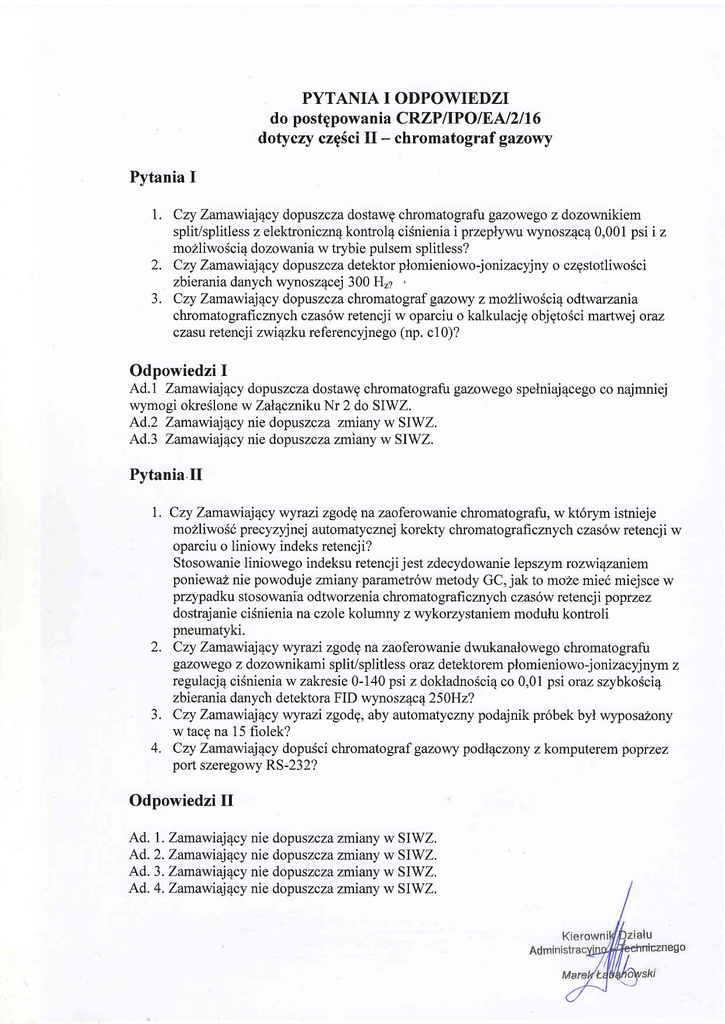 PYTANIA I ODPOWIEDZI do postgpowania CRZP/PO|ENZ|L6 dotycry czgSci II - chromatograf gazory Pytania I Czy Zamawiajqcy dopuszcza dostawg chromatografu gazowego z dozownikiem split/splitless z elektronicznqkontrol4 ciSnienia i przeplywu wynosz4cq 0,001 psi i z mo2liwoSciq dozowania w trybie pulsem splitless? 2. Czy Zamawiajqcy dopuszcza detektor plomieniowo-jonizacyjnv o czgstotliwoSci zbierania danych wynosz4cej 300 Hrr J. Czy Zamawiajqcy dopuszcza chromatograf gazovty z moZliwoSciq odtwarzania chromatognfrcznych czas6w retencji w oparciu o kalkulacjg objgto3ci mafiwej oraz czasn retencj i zwiqzku referencyj nego (np. c 1 0)? 1. Odpowiedzil Ad.l Zamawiajqcy dopuszcza dostawg chromatogrufu gazowego spelniaj4cego co najmniej wymogi okreSlone w Zal4czniku Nr 2 do SIWZ. Ad.2 Zamawiajqcy nie dopuszcza zmiany w SIWZ. Ad3 Zamawiaj4cy nie dopuszczazmiany w SIWZ. Pytania II L Czy Zamawiajqcy v,ryrazi zgodE na zaoferowanie chromatografu, w kt6rym istnieje moZl iwo S 6 precyzyj nej automaty cznej korekty chromato g r afrczny ch czas6 w retencj i w oparciu o liniowy indeks retencji? Stosowanie liniowego indeksu retencji jest zdecydowanie lepszymrozwiqzaniem poniewaZ nie powoduj e zmiany parametr6w metody GC, jak to moze mie6 miejsce w przypadku stosowania odtworzenia chromatograficznych czas6w retencji poprzez dostrajanie ciSnienia na czole kolumny z wykorzystaniem modulu kontroli pneumatyki. 2. Czy Zamawiajqcy vrryrazi zgodg na zaoferowanie dwukanalowego chromatografu gazow e go z do zownikami sp I itl splitl e s s or az detektorem plomi eni owo -j o nizacy jny m z regulacj4 ciSnienia w zakresie 0-140 psi z dokladnoSci4 co 0,01 psi oraz szybkoSci4 zbier ania danyih detekto ra F ID wyno s zqc q 2 5 }Hz? 3. Czy Zamawiajqcy v,ryrazi zgodg, aby automatyczny podajnik pr6bek byl wyposaZony w tacg na 15 fiolek? 4. Czy Zamawiajqcy dopuSci chromatograf gazowy podlqczony z komputerempoprzez port szeregowy RS-232? Odpowiedzi II Ad. 1. Zanawiajqcy nie dopuszczazmiany w SIWZ. Ad.2. Zamawiajqcy nie dopuszcza zmiany w SIWZ. Ad.3. Zamawiaj1cy nie dopuszczazmiany w SIWZ. Ad.4. Zamawiajqcy nie dopuszczazmiany w SIWZ.