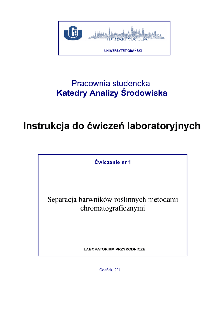 UNIWERSYTET GDAŃSKI Pracownia studencka Katedry Analizy Środowiska Instrukcja do ćwiczeń laboratoryjnych Ćwiczenie nr 1 Separacja barwników roślinnych metodami chromatograficznymi LABORATORIUM PRZYRODNICZE Gdańsk, 2011 1. Laboratorium przyrodnicze - Separacja barwników roślinnych metodami chromatograficznymi Wstęp Barwniki występujące w liściach szpinaku: chlorofile a i b, feofityny a i b, β-karoten oraz ksantofile zostaną wyekstrahowane za pomocą acetonu, a następnie rozdzielone na żelu krzemionkowym. Analiza zostanie wykonana z zastosowaniem adsorpcyjnej chromatografii kolumnowej (LC). W trakcie ćwiczenia zostanie także wykonana analiza metodą chromatografii cienkowarstwowej (TLC) ekstraktu oraz wydzielonych związków. Izolowane i analizowane związki są barwnikami, dzięki czemu można łatwo monitorować zarówno rozdział LC, jak i TLC. Pomysł eksperymentu został zaadaptowany z Pavia D.L. et al., Introduction to Organic Laboratory Techniques: A Microscale Approach, 2005. I. Wprowadzenie 1. Barwniki roślinne Chlorofile są barwnikami niezbędnymi w procesie fotosyntezy. W chloroplastach roślinnych występują przeważnie w dwóch formach: jako niebieskozielony chlorofil a oraz żółtozielony chlorofil b (struktury na Rysumku 1). Chlorofile zawierają rdzeń porfirynowy, w którym znajduje się atom magnezu łączący sie z atomami azotu każdego z pierścieni rdzenia porfirynowego. Chlorofil b różni sie od chlorofilu a obecnością grupy aldehydowej w bocznym pierścieniu pirolowym zamiast grupy metylowej. Budowa strukturalna feofityny a i b jest podobna do budowy chlorofilu a i b, z tym, że w miejscu jednego atomu magnezu w cząsteczce feofityny występują dwa atomy wodoru. Feofitynę można uzyskać poprzez działanie kwasem na chlorofil. Oprócz chlorofili w chloroplastach występują także karoteny, m.in. żółty β-karoten, czyli prowitamina A, oraz ksantofile. Zielony kolor chlorofili jest efektem tego, że związki te silnie absorbują światło w czerwonej i niebieskiej części widma promieniowania widzialnego, natomiast słabo w części zielonej. Jesienią zabarwienie liści zmienia sie na żółtawe ze względu na rozkład chlorofilu, dzięki czemu ujawnia się barwa obecnych w liściach żółtych barwników. W zależności od stanu próbki szpinaku oraz warunków eksperymentu mogą wystąpić pewne różnice w obserwowanych barwnikach. Mogą powstać nowe związki w wyniku reakcji utleniania, hydrolizy lub innych reakcji zachodzących pod wpływem światła, tlenu i innych czynników. Próbki szpinaku i wyizolowane barwniki należy przechowywać w ciemności, jeśli jest to możliwe. 2 1. Laboratorium przyrodnicze - Separacja barwników roślinnych metodami chromatograficznymi Rysunek 1. Wzory strukturalne chlorofilu a, chlorofilu b oraz β-karotenu. 2. Chromatografia adsorpcyjna Zarówno cieczowa chromatografia kolumnowa (LC), jak i chromatografia cienkowarstwowa (TLC) należą do technik określanych wspólnym mianem „chromatografia adsorpcyjna”. Rozdział następuje w wyniku wielokrotnych, selektywnych procesów adsorpcji zachodzących na aktywnych powierzchniach sorbentów. Szczególnie cenne usługi oddaje kolumnowa chromatografia adsorpcyjna w przypadku złożonych mieszanin stosunkowo niewielkich ilości substancji, których rozdzielenie za pomocą krystalizacji czy destylacji jest praktycznie nieosiągalne, zwłaszcza gdy chodzi o związki wysokowrzące i wrażliwe na działanie temperatury. Z tych samych powodów metodę kolumnowej chromatografii adsorpcyjnej stosuje się do rozdzielania szczególnie złożonych mieszanin związków pochodzących ze źródeł naturalnych. W chromatografii cieczowej występują konkurencyjne oddziaływania między próbką (analit i matryca) a fazą stacjonarną (adsorbent), między próbką a fazą ruchomą (rozpuszczalnik wymywający próbkę z adsorbentu) i między fazą ruchomą a stacjonarną. Mechanizm adsorpcyjny polega na zatrzymywaniu cząsteczek substancji na powierzchni adsorbentu (zwykle porowatego). W procesie tym biorą udział następujące oddziaływania międzycząsteczkowe: • siły wynikające z oddziaływań między cząsteczkami mającymi trwały moment dipolowy 3 1. Laboratorium przyrodnicze - Separacja barwników roślinnych metodami chromatograficznymi (oddziaływania dipol-dipol), • siły wynikające z oddziaływań między cząsteczkami mającymi dipol i cząsteczkami, w których dipol jest indukowany przez sąsiadujące cząsteczki (oddziaływanie dipol-dipol indukowany), • oddziaływania związane z tworzeniem wiązań wodorowych, specjalny rodzaj oddziaływania dipol-dipol między atomem wodoru a atomem pierwiastka elektroujemnego, np. O, N, F. Oddziaływania międzycząsteczkowe powodują, że rozdzielane substancje w niejednakowym stopniu zatrzymują się na adsorbencie. Im większe powinowactwo analitu do fazy stacjonarnej, tym analit jest silniej przez nią zatrzymywany. Analit z adsorbentu wymywany jest fazą ruchomą. Im silniej zatrzymywany analit, tym później opuszcza kolumnę (większa retencja czyli opóźnienie w stosunku do przepływu fazy ruchomej). Objętość fazy ruchomej potrzebna do jego wymycia nazywa się objętością retencji, a czas, w jakim analit zostaje wymyty z kolumny - czasem retencji. Objętość retencji i czas retencji analitu określa się precyzyjnie, licząc od momentu naniesienia na kolumnę do momentu opuszczenia kolumny maksimum jego stężenia. 2.1. Fazy stacjonarne w chromatografii adsorpcyjnej W chromatografii cieczowej używa się adsorbentów porowatych o powierzchniach od setek do tysiąca m2/g. Adsorbenty dzieli się na polarne i niepolarne. Do niepolarnych należą węgiel aktywny, węglowodory nasycone, polimery; do polarnych – żel krzemionkowy, krzemian magnezu, tlenek glinu. Żel krzemionkowy o ogólnym wzorze SiO2·nH2O jest najczęściej stosowanym adsorbentem. O jego szerokim zastosowaniu decyduje ła