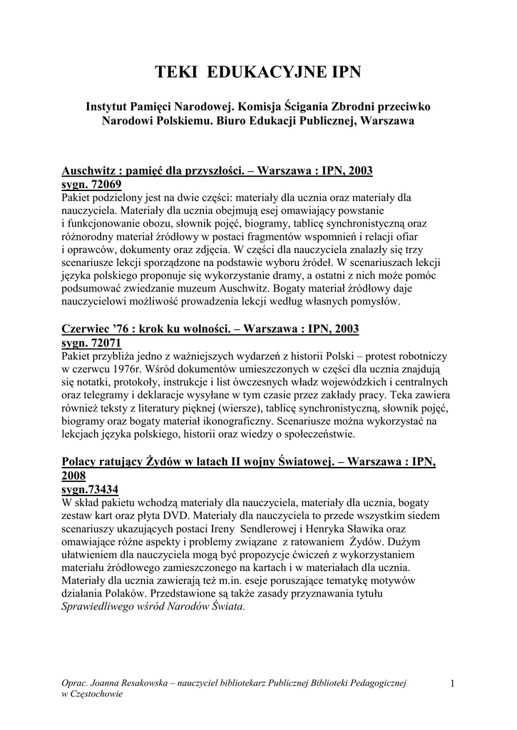 TEKI EDUKACYJNE IPN Instytut Pamięci Narodowej. Komisja Ścigania Zbrodni przeciwko Narodowi Polskiemu. Biuro Edukacji Publicznej, Warszawa Auschwitz : pamięć dla przyszłości. – Warszawa : IPN, 2003 sygn. 72069 Pakiet podzielony jest na dwie części: materiały dla ucznia oraz materiały dla nauczyciela. Materiały dla ucznia obejmują esej omawiający powstanie i funkcjonowanie obozu, słownik pojęć, biogramy, tablicę synchronistyczną oraz różnorodny materiał źródłowy w postaci fragmentów wspomnień i relacji ofiar i oprawców, dokumenty oraz zdjęcia. W części dla nauczyciela znalazły się trzy scenariusze lekcji sporządzone na podstawie wyboru źródeł. W scenariuszach lekcji języka polskiego proponuje się wykorzystanie dramy, a ostatni z nich może pomóc podsumować zwiedzanie muzeum Auschwitz. Bogaty materiał źródłowy daje nauczycielowi możliwość prowadzenia lekcji według własnych pomysłów. Czerwiec ’76 : krok ku wolności. – Warszawa : IPN, 2003 sygn. 72071 Pakiet przybliża jedno z ważniejszych wydarzeń z historii Polski – protest robotniczy w czerwcu 1976r. Wśród dokumentów umieszczonych w części dla ucznia znajdują się notatki, protokoły, instrukcje i list ówczesnych władz wojewódzkich i centralnych oraz telegramy i deklaracje wysyłane w tym czasie przez zakłady pracy. Teka zawiera również teksty z literatury pięknej (wiersze), tablicę synchronistyczną, słownik pojęć, biogramy oraz bogaty materiał ikonograficzny. Scenariusze można wykorzystać na lekcjach języka polskiego, historii oraz wiedzy o społeczeństwie. Polacy ratujący Żydów w latach II wojny Światowej. – Warszawa : IPN, 2008 sygn.73434 W skład pakietu wchodzą materiały dla nauczyciela, materiały dla ucznia, bogaty zestaw kart oraz płyta DVD. Materiały dla nauczyciela to przede wszystkim siedem scenariuszy ukazujących postaci Ireny Sendlerowej i Henryka Sławika oraz omawiające różne aspekty i problemy związane z ratowaniem Żydów. Dużym ułatwieniem dla nauczyciela mogą być propozycje ćwiczeń z wykorzystaniem materiału źródłowego zamieszczonego na kartach i w materiałach dla ucznia. Materiały dla ucznia zawierają też m.in. eseje poruszające tematykę motywów działania Polaków. Przedstawione są także zasady przyznawania tytułu Sprawiedliwego wśród Narodów Świata. Oprac. Joanna Resakowska – nauczyciel bibliotekarz Publicznej Biblioteki Pedagogicznej w Częstochowie 1 Polskie Państwo Podziemne w latach 1939-1941. – Warszawa : IPN, 2003 sygn.72073 Pakiet jest pierwszym z planowanej serii trzech pakietów poświęconych Polskiemu Państwu Podziemnemu w latach 1939-1945. Wprowadzeniem do pakietu jest esej omawiający najważniejsze problemy związane z kształtowaniem się polskiego podziemia. Następnie zamieszczono słownik pojęć, biogramy ważniejszych postaci i tablicę synchronistyczną. Bogaty materiał źródłowy, materiały graficzne, zdjęcia, mapy oraz schematy ukazujące strukturę polskiego podziemia publikowane są na luźnych kartach, aby ułatwić prowadzenie lekcji, a uczniom obrazowo przybliżyć omawiane zagadnienia. Pakiet zawiera trzy scenariusze lekcji historii przeznaczone dla uczniów szkół ponadgimnazjalnych oraz jeden scenariusz lekcji języka polskiego oparty na lekturze Kamienie na szaniec. Prymas Tysiąclecia - Kardynał Stefan Wyszyński. – Warszawa : IPN, 2003 sygn.72064 Pakiet edukacyjny poświęcony jest jednej z najważniejszych postaci w historii Polski i Kościoła. Przez pryzmat życia kardynała Wyszyńskiego przedstawiono skomplikowany konflikt pomiędzy komunistycznymi władzami PRL, a polskim Kościołem. Część dla uczniów obejmuje esej omawiający sytuację Kościoła w Polsce w czasach PRL, słownik pojęć, biogramy ważniejszych postaci, tablicę synchronistyczną oraz wybór źródeł. Część dla nauczyciela zawiera esej poświęcony postaci Stefana Wyszyńskiego, scenariusze lekcji, propozycje tras wycieczek Śladami Prymasa Tysiącleci. Wśród scenariuszy znajduje się lekcja historii związana z obchodami Milenium, lekcja języka polskiego oparta na wierszu ks. Jana Twardowskiego Komańcza oraz projekt edukacyjny. Stan wojenny. – Warszawa : IPN, 2003 sygn. 72067 Wprowadzeniem do pakietu jest esej omawiający genezę i przebieg stanu wojennego, następnie zamieszczono biogramy ważniejszych postaci, słownik pojęć, tablicę synchronistyczną, kalendarium wydarzeń w Kopalni Węgla Kamiennego „Wujek” i bibliografię. Pakiet obejmuje bogaty materiał źródłowy – zdjęcia, dokumenty, relacje, wspomnienia, fragmenty wydawnictw drugiego obiegu. Zamieszczone w pakiecie scenariusze mogą być realizowane na lekcjach historii, języka polskiego i wiedzy o społeczeństwie. Oprac. Joanna Resakowska – nauczyciel bibliotekarz Publicznej Biblioteki Pedagogicznej w Częstochowie 2 Stosunki polsko-ukraińskie w latach 1939 – 1947. – Warszawa : IPN, 2002 sygn.72077 Problematyka omówiona w tym pakiecie jest jednym z trudniejszych zagadnień realizowanych na lekcjach historii. Wiąże się ona z wieloma uprzedzeniami i stereotypami. Wprowadzeniem do pakietu jest esej omawiający stosunki polskoukraińskie, dołączony jest bogaty wybór materiałów źródłowych – relacje naocznych świadków wydarzeń, meldunki wojskowe oraz dokumenty normatywne. Teka zawiera również trzy scenariusze lekcji: Konflikt polsko-ukraiński w latach 1943-1945, Ludność ukraińska, a „wielka wędrówka narodów”, Stereotypy i uprzedzenia, a przekaz historyczny. Zagłada Żydów polskich w czasie II wojny światowej. – Warszawa : IPN, 2005 sygn.72075 Pakiet ma pomóc nauczycielom w przekazywaniu, a uczniom w przyswajaniu wiedzy o niewyobrażalnym mordzie blisko 6 mln europejskich Żydów, w tym 3,5 mln Żydów polskich. Materiały dla ucznia obejmują esej omawiający przyczyny, poszczególne etapy i bilans zagłady oraz słownik pojęć, biogramy, tablicę s
