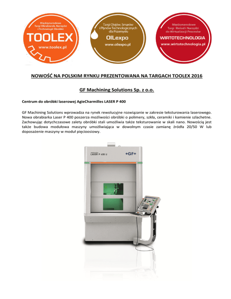 NOWOŚĆ NA POLSKIM RYNKU PREZENTOWANA NA TARGACH TOOLEX 2016 GF Machining Solutions Sp. z o.o. Centrum do obróbki laserowej AgieCharmilles LASER P 400 GF Machining Solutions wprowadza na rynek rewolucyjne rozwiązanie w zakresie teksturowania laserowego. Nowa obrabiarka Laser P 400 poszerza możliwości obróbki o polimery, szkła, ceramiki i kamienie szlachetne. Zachowując dotychczasowe zalety obróbki stali umożliwia także teksturowanie w skali nano. Nowością jest także budowa modułowa maszyny umożliwiająca w dowolnym czasie zamianę źródła 20/50 W lub doposażenie maszyny w moduł pięcioosiowy.