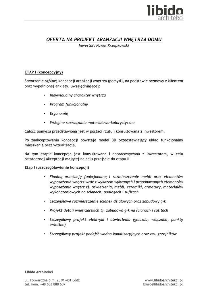 OFERTA NA PROJEKT ARANŻACJI WNĘTRZA DOMU Inwestor: Paweł Krzepkowski ETAP I (koncepcyjny) Stworzenie ogólnej koncepcji aranżacji wnętrza (pomysł), na podstawie rozmowy z klientem oraz wypełnionej ankiety, uwzględniającej: • Indywidualny charakter wnętrza • Program funkcjonalny • Ergonomię • Wstępne rozwiązania materiałowo-kolorystyczne Całość pomysłu przedstawiona jest w postaci rzutu i konsultowana z Inwestorem. Po zaakceptowaniu koncepcji powstaje model 3D przedstawiający układ funkcjonalny mieszkania oraz wizualizacje. Na tym etapie koncepcja jest konsultowana i dopracowywana z Inwestorem, w celu ostatecznej akceptacji mającej na celu przejście do etapu II. Etap I (uszczegółowienie koncepcji) • Finalną aranżację funkcjonalną i rozmieszczenie mebli oraz elementów wyposażenia wnętrz wraz z wykazem wybranych i proponowanych elementów wyposażenia wnętrz tj. oświetlenia, mebli, ceramiki, armatury, materiałów wykończeniowych na ścianach, podłogach i sufitach • Szczegółowe rozmieszczenie ścianek działowych oraz zabudowy g-k • Projekt detali wnętrzarskich tj. zabudowa g-k na ścianach i sufitach • Szczegółowy projekt elektryki i oświetlenia (gniazda, włączniki, punkty świetlne) • Szczegółowy projekt podejść wodno-kanalizacyjnych oraz ew. grzejników Libido Architekci ul. Folwarczna 6 m. 2, 91-481 Łódź tel. kom. +48 603 888 607 www.libidoarchitekci.pl [email protected] ETAP II (projektowy wykonawczy – uszczegóławianie etapu I) Zaakceptowana wykonawczego. koncepcja jest materiałem wyjściowym do powstania projektu 1. Faza doboru materiałów i elementów wyposażenia wnętrz: • Wizyty w renomowanych salonach wyposażenia wnętrz • Praca w oparciu o katalogi i wzorniki Etap ten ma na celu zapoznanie Inwestora z ofertą atrakcyjnych produktów dostępnych na rynku wnętrzarskim, cenami oraz wyborem konkretnych artykułów. Pomoc doświadczonego architekta ma na celu szybkie i sprawne poruszanie się po asortymencie różnych producentów (glazura, armatura, ceramika, meble kuchenne etc.) oraz eliminację tych nieatrakcyjnych, co jest dużą oszczędnością czasu i energii. Architekt również pomaga Inwestorowi w uzyskaniu rabatów cenowych. 2. Faza projektowa (w oparciu o koncepcję, model 3D i wybrane elementy z punktu 1.) Stworzenie pełnego projektu aranżacji wnętrz obejmującego rzuty, rozwinięcia ścian oraz uszczegółowiony model 3D przedstawiające: • Dobór konkretnych opraw oświetleniowych, mebli, elementów wyposażenia wnętrza, stolarki drzwiowej • Projekt wykończenia ścian, sufitów i podłóg ze szczegółowym rozrysowaniem płytek, drewna, podwieszanych sufitów, elementów takich jak tapety, szkło, grafika na ścianach etc. • Szczegółowy projekt kuchni, mebli kuchennych (zarówno tych robionych na zamówienie jak i gotowych), dobór sprzętów AGD, armatury, zlewu – mając na uwadze funkcjonalność, ergonomię oraz estetykę • Szczegółowy projekt łazienek uwzględniający układ funkcjonalny, rozmieszczenie i układ płytek, projekt mebli łazienkowych i zabudów oraz dobór ceramiki i armatury, jak również rozmieszczenie akcesoriów łazienkowych • Szczegółowy projekt pozostałych mebli, detali wykończeniowych, zabudowy g-k, Projekty są podzielone na poszczególne branże. Dokumentacja projektowa w sposób jednoznaczny określa sposób i zakres wykonywanych prac budowlanych i jest Libido Architekci ul. Folwarczna 6 m. 2, 91-481 Łódź tel. kom. +48 603 888 607 www.libidoarchitekci.pl [email protected] materiałem wyjściowym dla ekip remontowych. Rysunki obejmują rzuty oraz rozwinięcia ścian. Wszystkie projekty są wykonywane w oparciu o zachowanie zasad ergonomii i funkcjonalności oraz są dostosowywane do indywidualnych potrzeb Inwestora. Architekt dostarcza Inwestorowi projekt w dwóch egzemplarzach, w wersji papierowej. ETAP III (nadzór autorski) W cenę projektu wliczone są 2 spotkania (do wykorzystania na nadzór autorski, spotkanie u Klienta lub wizyty w sklepach) Każda kolejna wizyta jest płatna dodatkowo w kwocie 450 zł. Jeśli Klient przyjeżdża na spotkanie do architekta, wówczas wizyta jest bezpłatna. ———————————————————————————————————————————————————————— Projekt obejmuje projekt parteru, piętra oraz poddasza w zakresie dwóch pomieszczeń PP02 (łączna powierzchnia projektowa do 150 m2). Dodatkowe pomieszczenia nie objęte niniejszą ofertą będą wyceniane indywidualnie. Z poważaniem Agata Karczewska Libido Architekci ul. Folwarczna 6 m. 2, 91-481 Łódź tel. kom. +48 603 888 607 www.libidoarchitekci.pl [email protected]