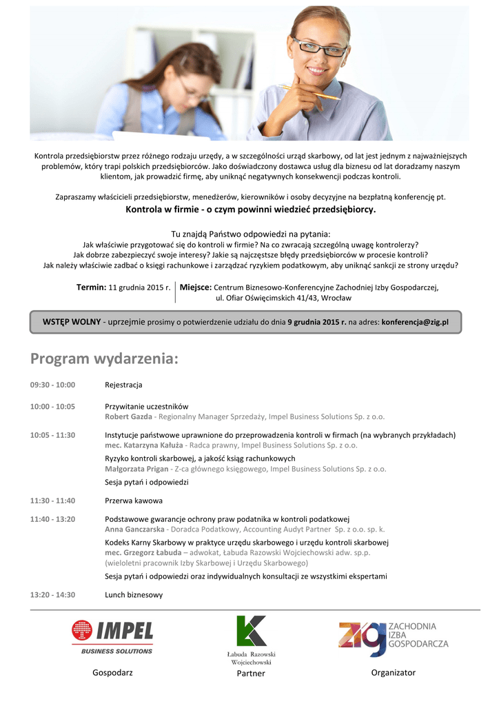 Kontrola przedsiębiorstw przez różnego rodzaju urzędy, a w szczególności urząd skarbowy, od lat jest jednym z najważniejszych problemów, który trapi polskich przedsiębiorców. Jako doświadczony dostawca usług dla biznesu od lat doradzamy naszym klientom, jak prowadzić firmę, aby uniknąć negatywnych konsekwencji podczas kontroli. Zapraszamy właścicieli przedsiębiorstw, menedżerów, kierowników i osoby decyzyjne na bezpłatną konferencję pt. Kontrola w firmie - o czym powinni wiedzieć przedsiębiorcy. Tu znajdą Państwo odpowiedzi na pytania: Jak właściwie przygotować się do kontroli w firmie? Na co zwracają szczególną uwagę kontrolerzy? Jak dobrze zabezpieczyć swoje interesy? Jakie są najczęstsze błędy przedsiębiorców w procesie kontroli? Jak należy właściwie zadbać o księgi rachunkowe i zarządzać ryzykiem podatkowym, aby uniknąć sankcji ze strony urzędu? Termin: 11 grudnia 2015 r. Miejsce: Centrum Biznesowo-Konferencyjne Zachodniej Izby Gospodarczej, ul. Ofiar Oświęcimskich 41/43, Wrocław WSTĘP WOLNY - uprzejmie prosimy o potwierdzenie udziału do dnia 9 grudnia 2015 r. na adres: [email protected] Program wydarzenia: 09:30 - 10:00 Rejestracja 10:00 - 10:05 Przywitanie uczestników Robert Gazda - Regionalny Manager Sprzedaży, Impel Business Solutions Sp. z o.o. 10:05 - 11:30 Instytucje państwowe uprawnione do przeprowadzenia kontroli w firmach (na wybranych przykładach) mec. Katarzyna Kałuża - Radca prawny, Impel Business Solutions Sp. z o.o. Ryzyko kontroli skarbowej, a jakość ksiąg rachunkowych Małgorzata Prigan - Z-ca głównego księgowego, Impel Business Solutions Sp. z o.o. Sesja pytań i odpowiedzi 11:30 - 11:40 Przerwa kawowa 11:40 - 13:20 Podstawowe gwarancje ochrony praw podatnika w kontroli podatkowej Anna Ganczarska - Doradca Podatkowy, Accounting Audyt Partner Sp. z o.o. sp. k. Kodeks Karny Skarbowy w praktyce urzędu skarbowego i urzędu kontroli skarbowej mec. Grzegorz Łabuda – adwokat, Łabuda Razowski Wojciechowski adw. sp.p. (wieloletni pracownik Izby Skarbowej i Urzędu Skarbowego) Sesja pytań i odpowiedzi oraz indywidualnych konsultacji ze wszystkimi ekspertami 13:20 - 14:30 Lunch biznesowy Gospodarz Partner Organizator Zaproszeni eksperci: dr. Grzegorz Łabuda – prawnik, adwokat prowadzący kancelarię adwokacką we Wrocławiu (od 2008 r., Łabuda Razowski Wojciechowski adw. sp.p.), specjalizuje się w prawie karnym skarbowym, autor ok. 40 publikacji z zakresu prawa karnego (monografii, artykułów, publikacji popularyzujących prawo). W latach 1998-2008 pracownik aparatu skarbowego, w tym w okresie 1999-2004 sprawujący funkcję oskarżyciela skarbowego (Pierwszy Urząd Skarbowy we Wrocławiu 1999-2003, Dolnośląski Urząd Skarbowy we Wrocławiu 2004-2008). mec. Grzegorz Łabuda Adwokat, wyspecjalizowany w prawie karnym i skarbowym, wieloletni pracownik Izby Skarbowej i Urzędu Skarbowego we Wrocławiu Anna Ganczarska Doradca Podatkowy Accounting Audyt Partner W 2002 r. ukończył aplikację prokuratorską w okręgu Prokuratury Okręgowej w Zielonej Górze. W 2001 r. ukończył Studia Podyplomowe Prawa Karnego Gospodarczego ze specjalizacją prawa karnego skarbowego (UWr). W 2003 r. uzyskał stopień naukowy doktora nauk prawnych w zakresie prawa karnego materialnego na Uniwersytecie Wrocławskim. Prowadzi i prowadził wiele szkoleń m.in.: z zakresu prawa karnego skarbowego (Podyplomowe Studia Doradztwa Podatkowego i Zarządzania Podatkami UE we Wrocławiu (2006-obecnie), Podyplomowe Studia Rachunkowości UE we Wrocławiu (2006-obecnie), Podyplomowe Studia Prawa Karnego Gospodarczego UJ w Krakowie (2013-obecnie), szkolenia dla sędziów, prokuratorów i adwokatów w ramach szkoleń prowadzonych przez Ministerstwo Sprawiedliwości i izby adwokackie (2005-obecnie), szkolenia dla pracowników komórek karnoskarbowych w urzędach skarbowych i inspektorów kontroli skarbowej w ramach szkoleń prowadzonych przez Ministerstwo Finansów (2007-2009). Anna Ganczarska – doradca podatkowy (nr wpisu 11238), absolwentka Wydziału Prawa, Administracji i Ekonomii Uniwersytetu Wrocławskiego oraz studiów podyplomowych Doradztwo podatkowe i zarządzanie podatkami na Uniwersytecie Ekonomicznym we Wrocławiu. Kompetencje zawodowe zdobywała w jednej z czołowych firm konsultingowo-audytorskich, a następnie w renomowanej kancelarii prawnej zajmującej się obsługą prawno-podatkową podmiotów gospodarczych. W latach 2007 – 2010 pełniła rolę eksperta prawnego w Komisji Statutowej przy Radzie Miejskiej Wrocławia. W Grupie Impel od października 2014 r. Jako doradca podatkowy prowadziła kompleksowe audyty podatkowe, a także doradzała w procesach optymalizacyjnych. Posiada doświadczenie w reprezentowaniu podatników przed organami podatkowymi oraz sądami administracyjnymi. W czerwcu 2015 r. ukończyła aplikację na biegłego rewidenta. Małgorzata Prigan – zastępca Głównego Księgowego, z wykształcenia ekonomistka. Pełnione dotychczas funkcje zawodowe związane były z rachunkowością przedsiębiorstw. Pierwszą pracę podjęła w 1996 roku w American Retail Systems Sp. z o.o. jako osoba wprowadzająca dane do systemu księgowego. Bardzo dobre przygotowanie zawodowe umożliwiło szybki awans zawodowy. W latach 2000 -2008 pełniła obowiązki głównej księgowej w rodzinnej firmie z branży pośrednictwa ubezpieczeniowego. Od września 2008 zatrudniona w Impel Business Solutions. Małgorzata Prigan Z-ca Głównego Księgowego Impel Business Solutions Katarzyna Kałuża - radca prawny, absolwentka Wydziału Prawa i Administracji Uniwersytetu Wrocławskiego, od 2001 roku zajmuje się obsługą prawną spółek kapitałowych i ich organów, spółek osobowych prawa handlowego oraz osób fizycznych prowadzących działalność gospodarczą, pracowała w firmach usługowych, w tym pierwszym w Polsce biurze informacji gospodarczej i największej w kraju agencji pracy tymczasowej oraz firmach produkcyj