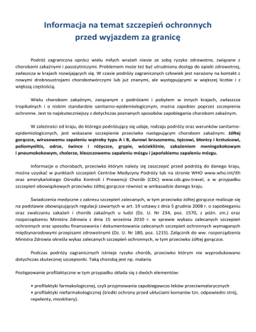 Informacja na temat szczepień ochronnych przed wyjazdem za granicę Podróż zagraniczna oprócz wielu miłych wrażeń niesie ze sobą ryzyko zdrowotne, związane z chorobami zakaźnymi i pasożytniczymi. Problemem może też być utrudniony dostęp do opieki zdrowotnej, zwłaszcza w krajach rozwijających się. W czasie podróży zagranicznych człowiek jest narażony na kontakt z nowymi drobnoustrojami chorobotwórczymi lub już znanymi, ale występującymi w większej liczbie i z większą częstością. Wielu chorobom zakaźnym, związanym z podróżami i pobytem w innych krajach, zwłaszcza tropikalnych i o niskim standardzie sanitarno-epidemiologicznym, można zapobiec poprzez szczepienia ochronne. Jest to najskuteczniejszy z dotychczas poznanych sposobów zapobiegania chorobom zakaźnym. W zależności od kraju, do którego podróżujący się udaje, rodzaju podróży oraz warunków sanitarnoepidemiologicznych, jest wskazane szczepienie przeciwko następującym chorobom zakaźnym: żółtej gorączce, wirusowemu zapaleniu wątroby typu A i B, durowi brzusznemu, tężcowi, błonicy i krztuścowi, poliomyelitis, odrze, śwince i różyczce, grypie, wściekliźnie, zakażeniom meningokokowym i pneumokokowym, cholerze, kleszczowemu zapaleniu mózgu i japońskiemu zapaleniu mózgu. Informacje o chorobach, przeciwko którym należy się zaszczepić przed podróżą do danego kraju, można uzyskać w punktach szczepień Centrów Medycyny Podróży lub na stronie WHO www.who.int/ith oraz amerykańskiego Ośrodka Kontroli i Prewencji Chorób (CDC) www.cdc.gov.travel, a w przypadku szczepień obowiązkowych przeciwko żółtej gorączce również w ambasadzie danego kraju. Świadczenia medyczne z zakresu szczepień zalecanych, w tym przeciwko żółtej gorączce realizuje się na podstawie obowiązujących regulacji zawartych w art. 19 ustawy z dnia 5 grudnia 2008 r. o zapobieganiu oraz zwalczaniu zakażeń i chorób zakaźnych u ludzi (Dz. U. Nr 234, poz. 1570, z późn. zm.) oraz rozporządzeniu Ministra Zdrowia z dnia 15 września 2010 r. w sprawie wykazu zalecanych szczepień ochronnych oraz sposobu finansowania i dokumentowania zalecanych szczepień ochronnych wymaganych międzynarodowymi przepisami zdrowotnymi (Dz. U. Nr 180, poz. 1215). Załącznik do ww. rozporządzenia Ministra Zdrowia określa wykaz zalecanych szczepień ochronnych, w tym przeciwko żółtej gorączce. Podczas podróży zagranicznych istnieje ryzyko chorób, przeciwko którym nie wyprodukowano dotychczas skutecznej szczepionki. Taką chorobą jest np. malaria. Postępowanie profilaktyczne w tym przypadku składa się z dwóch elementów: • profilaktyki farmakologicznej, czyli przyjmowania zapobiegawczo leków przeciwmalarycznych • profilaktyki niefarmakologicznej (środki ochrony przed ukłuciami komarów tzn. odpowiedni strój, repelenty, moskitiery). Nie ma również szczepionek przeciwko większości drobnoustrojów wywołujących tzw. biegunkę podróżnych (enteropatogenne szczepy Escherichia coli, Campylobacter jejuni, Salmonella, Shigella). Źródłem zakażenia tymi drobnoustrojami są zanieczyszczone nimi produkty pokarmowe i woda, a także ręce. Zapobieganie tym zakażeniom polega na starannym przestrzeganiu zasad higieny osobistej i higieny żywienia (spożywanie pokarmów poddanych obróbce termicznej, picie wody pozbawionej czynników chorobotwórczych). Szczepienia obowiązkowe przed podróżą zagraniczną są wymagane przez władze krajów docelowych na podstawie Międzynarodowych Przepisów Zdrowotnych (International Health Regulations IHR), opublikowanych w 2005 r. przez WHO. Aktualnie są to szczepienia przeciwko: • żółtej gorączce dla wyjeżdżających do następujących krajów: Angola, Benin, Burkina Faso, Burundi, Demokratyczna Republika Konga – dawny Zair, Gabon, Ghana, Gujana Francuska, Gwinea Bissau, Kamerun, Kongo, Liberia, Mali, Niger, Republika Środkowo-Afrykańska, Ruanda, Sierra Leone, Togo, Wyspy Świętego Tomasza i Książęca, Wybrzeże Kości Słoniowej • zakażeniom meningokokowym dla pielgrzymów do Mekki lub Umrah w Arabii Saudyjskiej. Szczepienia zalecane przed podróżą zagraniczną nie są wymagane przez władze krajów docelowych, ale są uważane przez WHO za rutynowe, z uwagi na to, że w większości krajów dzieci i młodzież są zaszczepione zgodnie z obowiązującym programem szczepień. Jednak w części przypadków może być wymagane podanie przed wyjazdem dawek przypominających lub uzupełnienie całego cyklu szczepienia u osób, które z jakiegoś powodu ich nie otrzymały. Aktualnie są to szczepienia przeciwko: • tężcowi, błonicy i krztuścowi • wirusowemu zapaleniu wątroby typu B • poliomyelitis • odrze, śwince i różyczce • ospie wietrznej • grypie • zakażeniom Haemophilus influenzae typu b • zakażeniom wirusem brodawczaka ludzkiego (HPV) • zakażeniom pneumokokowym • zakażeniom rotawirusowym. Wśród szczepień zalecanych ze względu na zwiększone ryzyko zakażenia w czasie podróży lub pobytu w danym kraju lub ze względu na indywidualne ryzyko wymieniane są szczepienia przeciwko: • wirusowemu zapaleniu wątroby typu A • durowi brzusznemu • żółtej gorączce • zakażeniom meningokokowym • kleszczowemu zapaleniu mózgu • wściekliźnie • cholerze • japońskiemu zapaleniu mózgu (szczepionka dostępna w ramach importu docelowego). Przy wyborze szczepień powinno się uwzględnić m.in. szczegółowe informacje dotyczące podróży, dotychczasowy stan uodpornienia danej osoby oraz ewentualne przeciwwskazania. Uodpornienie najlepiej rozpocząć ok. 6 - 8 tygodni przed planowanym wyjazdem. Niektóre szczepienia wymagają podania kilku dawek w określonym schemacie szczepienia, z czego przed wyjazdem podaje się dwie dawki w odstępie 4 tygodni. Część szczepień wymaga podania tylko jednej dawki najpóźniej 2 tygodnie przed wyjazdem, np. szczepionkę przeciwko żółtej gorączce podaje 