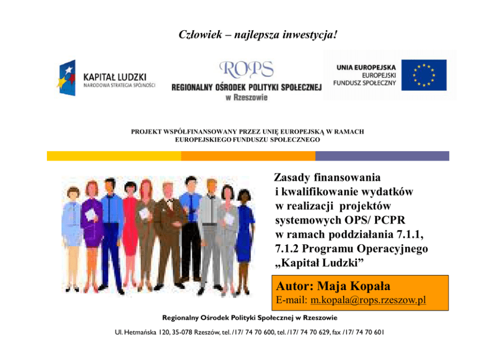 Człowiek – najlepsza inwestycja! PROJEKT WSPÓŁFINANSOWANY PRZEZ UNIĘ EUROPEJSKĄ W RAMACH EUROPEJSKIEGO FUNDUSZU SPOŁECZNEGO Zasady finansowania i kwalifikowanie wydatków w realizacji projektów systemowych OPS/ PCPR w ramach poddziałania 7.1.1, 7.1.2 Programu Operacyjnego „Kapitał Ludzki” Autor: Maja Kopała E-mail: [email protected] Regionalny Ośrodek Polityki Społecznej w Rzeszowie Ul. Hetmańska 120, 35-078 Rzeszów, tel. /17/ 74 70 600, tel. /17/ 74 70 629, fax /17/ 74 70 601 Człowiek – najlepsza inwestycja! PROJEKT WSPÓŁFINANSOWANY PRZEZ UNIĘ EUROPEJSKĄ W RAMACH EUROPEJSKIEGO FUNDUSZU SPOŁECZNEGO Kwestie kwalifikowania wydatków w ramach POKL regulują następujace akty prawne i dokumenty: Rozporządzenie Rady (WE) nr 1083/2006z dnia 11 lipca 2006r., ustanawiające przepisy ogólne dotyczące Europejskiego Funduszu Rozwoju Regionalnego, Europejskiego Funduszu Społecznego oraz Funduszu Spójności i uchylające rozporządzenie (WE) nr 1260/1999 è Rozporządzenie Komisji (WE) nr 1828/2006 z dnia 8 grudnia 2006 r. ustanawiajace szczególowe zasady wykonywania rozporządzenia Rady (WE) nr 1083/ 2006 è Rozporządzenie (WE) Parlamentu Europejskiego i Rady nr 1081/2006z dnia 5 lipca 2006 r. w sprawie Europejskiego Funduszu Społecznego è Ustawa z dnia 6 grudnia 2006 r. o zasadach prowadzenia polityki rozwoju è Człowiek – najlepsza inwestycja! PROJEKT WSPÓŁFINANSOWANY PRZEZ UNIĘ EUROPEJSKĄ W RAMACH EUROPEJSKIEGO FUNDUSZU SPOŁECZNEGO Narodowe Strategiczne Ramy Odniesienia 2007-2013. Wytyczne w zakresie kwalifikowalności wydatków w ramach POKL z dnia 28 grudnia 2009 r. l Zasady finansowania POKL z dnia 30 grudnia 2009 r l Zasady przygotowania, realizacji i rozliczania projektów systemowych Ośrodków Pomocy Społecznej, Powiatowych Centrów Pomocy Rodzinie oraz Regionalnego Ośrodka Polityki Społecznej w ramach POKL na lata 2007-2013 z dnia 1 stycznia 2010r. l Człowiek – najlepsza inwestycja! PROJEKT WSPÓŁFINANSOWANY PRZEZ UNIĘ EUROPEJSKĄ W RAMACH EUROPEJSKIEGO FUNDUSZU SPOŁECZNEGO Podstawowe zasady kwalifikowania wydatków: Wszystkie wydatki w ramach PO KL są kwalifikowalne, o ile łącznie spełniają następujące warunki: 1) są niezbędne dla realizacji projektu, mają bezpośredni związek z celami projektu, 2) są racjonalne i efektywne (nie są zawyżone w stosunku do cen i stawek rynkowych) oraz spełniają wymogi efektywnego zarządządzania finansami ( relacja nakład/rezultat), 3) zostały faktycznie poniesione (pod pojęciem wydatku faktycznie poniesionego należy rozumieć wydatek poniesiony w znaczeniu kasowym). 4) są udokumentowane, 5) są zgodne z zatwierdzonym budżetem projektu, 6) są zgodne z odrębnymi przepisami prwa krajowego i wspolnotowego, w szczególnosci z ustawą z dnia 29 stycznia 2004 - Prawo zamówień publicznych ( Dz.U. Z 2007 r. Nr 223, poz. 1655, z późn.zm.) Człowiek – najlepsza inwestycja! PROJEKT WSPÓŁFINANSOWANY PRZEZ UNIĘ EUROPEJSKĄ W RAMACH EUROPEJSKIEGO FUNDUSZU SPOŁECZNEGO Dowodem poniesienia wydatku jest opłacona faktura lub inny dokument księgowy o równoważnej wartości dowodowej wraz z dowodami zapłaty. zapłaty. W przypadku płatności gotówkowej dowodem jest faktura bądź inny dokument księgowy ze wskazaniem , że został zapłacony gotówką gotówką.. W przypadku poświadczania wkładu niepieniężnego, amortyzacji lub wkładu w postaci dodatków wypłacanych przez stronę trzecią, powinny pozwalać na identyfikację sposoby wyliczania tego wkładu oraz wyraźnie wskazywać jego wysokość wysokość.. W ramach POKL niedozwolone jest podwójne finansowanie czyli całkowite lub częściowe zrefundowanie danego wydatku dwa razy ze środków publicznych, w szczególności szczególności:: l zrefundowanie tego samego wydatku w ramach dwóch róznych projektów dofinansowywanych w ramach POKL lub innych programów operacyjnych finansowanych z funduszy stukturalnych l zrefundowanie podatku od towarów i usług (VAT) w ramach POKL a następnie odzyskanie tego podatku ze środków budżetu państwa, l zakupienie środka trwałego z udziałem środków krajowych, a następnie zrefundowanie jego amortyzacji w ramach POKL l rozliczenie tego samego wydatku w kosztach bezpośrednich oraz kosztów pośrednich projektu.. projektu Człowiek – najlepsza inwestycja! PROJEKT WSPÓŁFINANSOWANY PRZEZ UNIĘ EUROPEJSKĄ W RAMACH EUROPEJSKIEGO FUNDUSZU SPOŁECZNEGO Konstruowanie budżetu projektu W ramach POKL beneficjent przedstawia zakładane koszty w formie budżetu zadaniowego, tj. przedstawia podział na: - koszty bezpośrednie ( koszty kwalifikowalne poszczególnych zadań ) - koszty pośrednie ( koszty związane z obsługą techniczną projektu). Koszty bezpośrednie ujmowane są wg następujących kategorii: 1) aktywna integracja 2) praca socjalna 3) zasiłki i pomoc w naturze 4) działania o charakterze środowiskowym 5) prace społecznie użyteczne 6) zarządzanie projektem 7) promocja projektu Człowiek – najlepsza inwestycja! PROJEKT WSPÓŁFINANSOWANY PRZEZ UNIĘ EUROPEJSKĄ W RAMACH EUROPEJSKIEGO FUNDUSZU SPOŁECZNEGO 1. Zadanie „aktywna integracja” W pozycji tej zawiera się koszt wsparcia wynikający z przemnożenia liczby osób objętych kontraktami, programami aktywności lokalnej, lub programami integracji społecznej i zawodowej osób niepełnosprawnych przez kalkulowane kwoty wsparcia np: 20 osób objętych kontrakatami socjalnymi ( 20 x 5000,00 zł= 100 000,00 zł) oraz 20 objętych programem aktywności lokalnej (20 x 3000,00 zł = 60 000,00 zł) - w pozycji tej podajemy kwotę ryczałtową - 160 000 tys. zł. Można również wyliczyć budżet w tej pozycji według kosztów rzeczywistych (nieryczałtowych) - w takim przypadku nie obowiązują limity określone w zasadach. 2. Zadanie „praca socjalna” Koszty wynagrodzenia pracowników pomocy społecznej bezpośrednio realizujących działania zadania z zakresu aktywnej integracji w ramach kontraktu socjalnego 